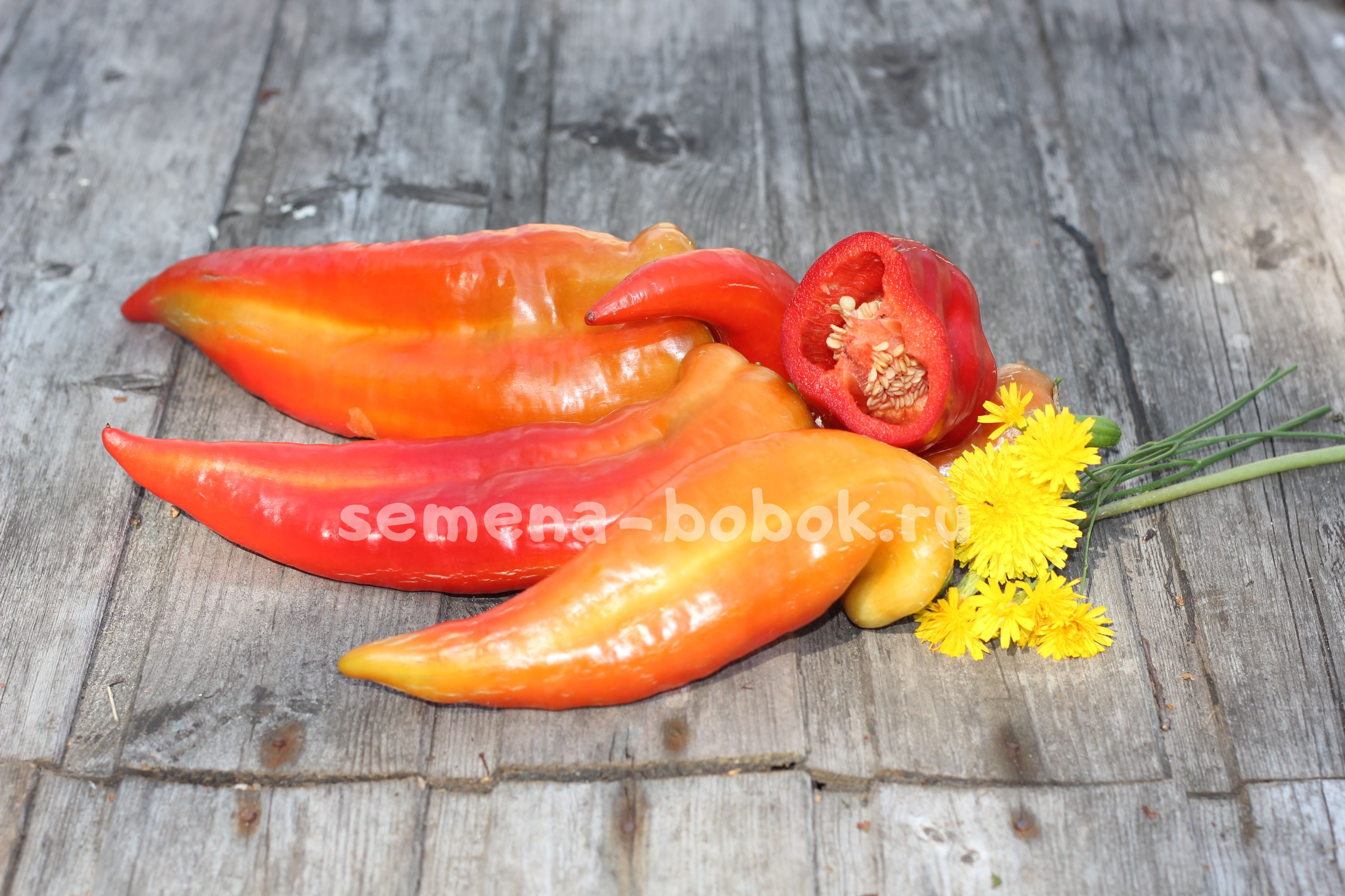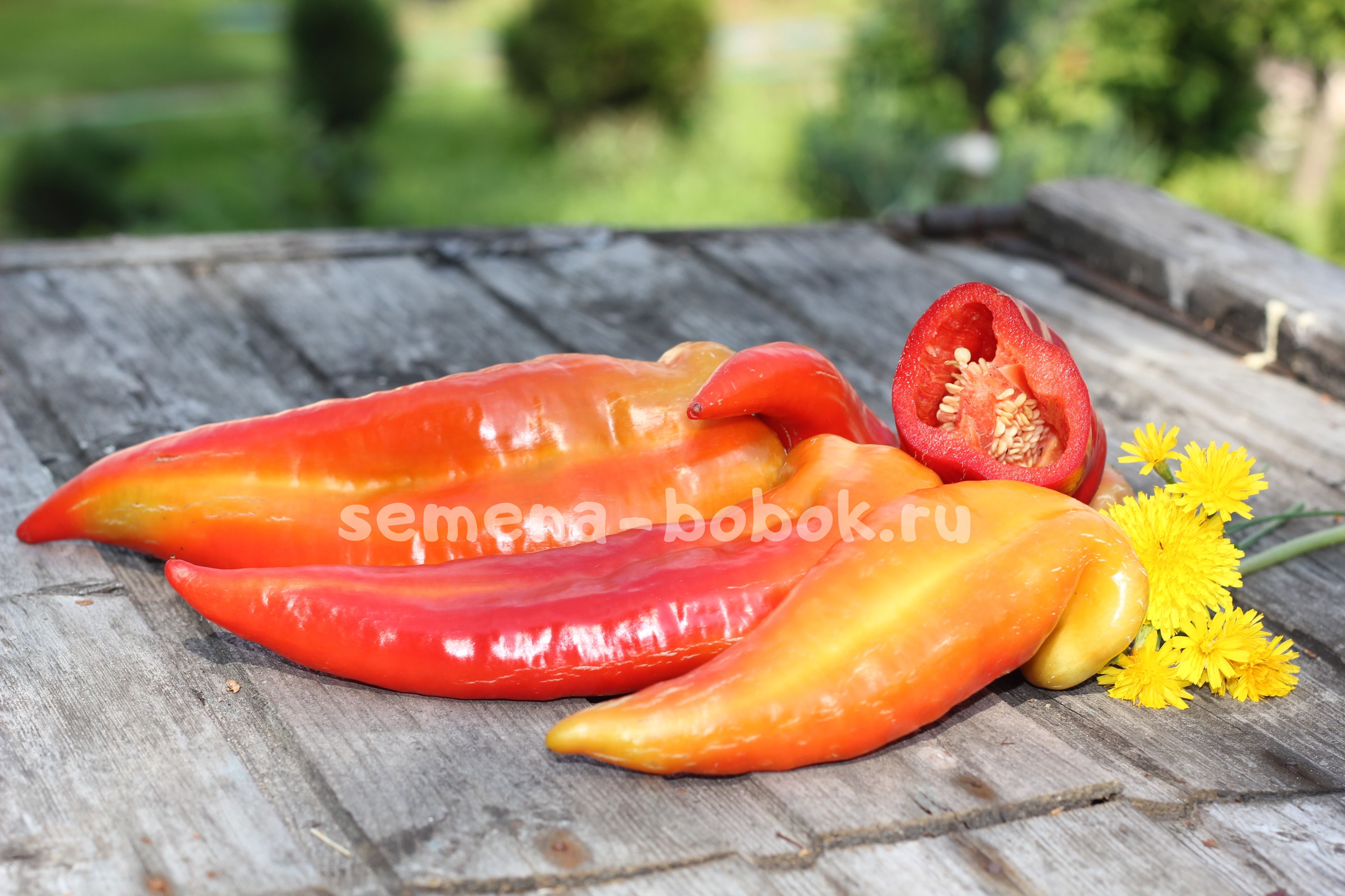 Растение высотой до 70 см. Листья среднего размера, темно-зеленые, с небольшой морщинистостью. Плоды в форме узких конусов. Вес перца от 100 до 250 г, длина - до 35 см. В процессе роста перцы похожи на гроздь бананов из-за зеленовато-белого или кремового окраса. В биолгоческой спелости перцы красного цвета.