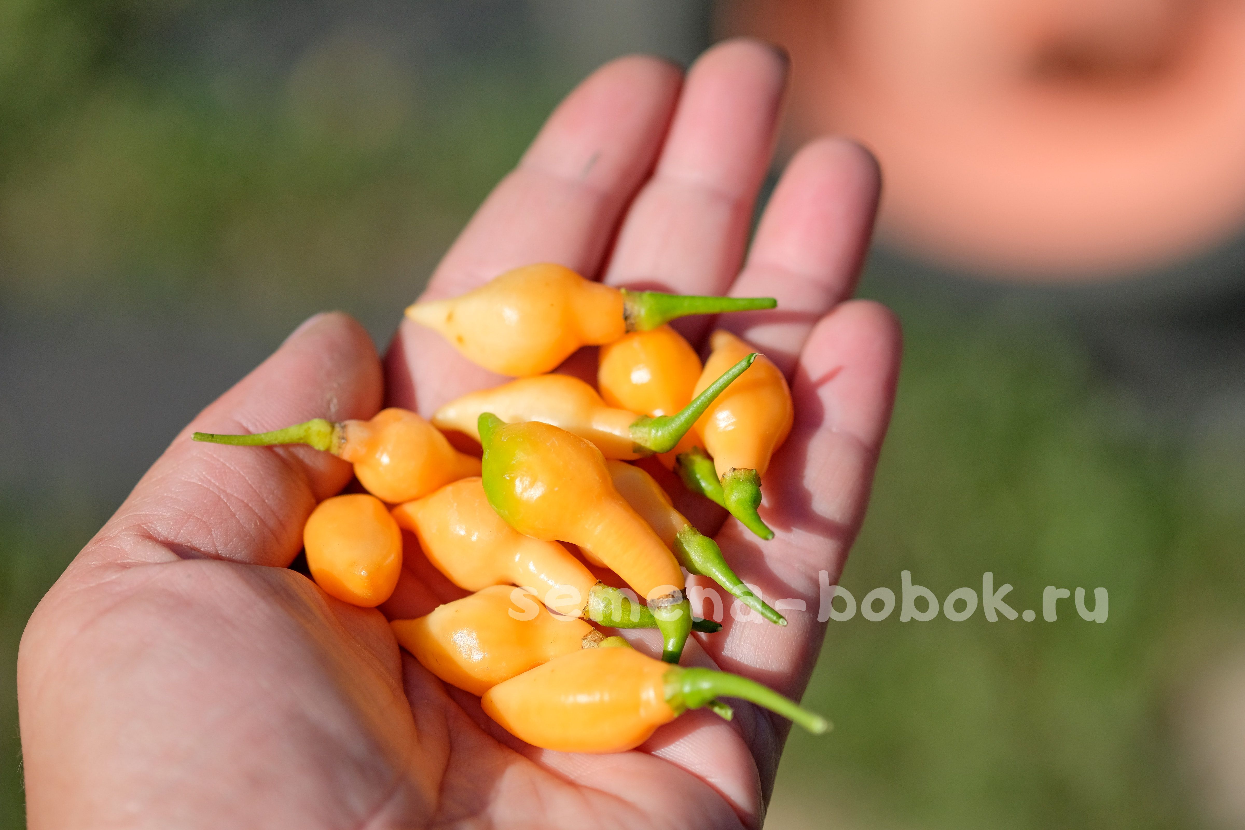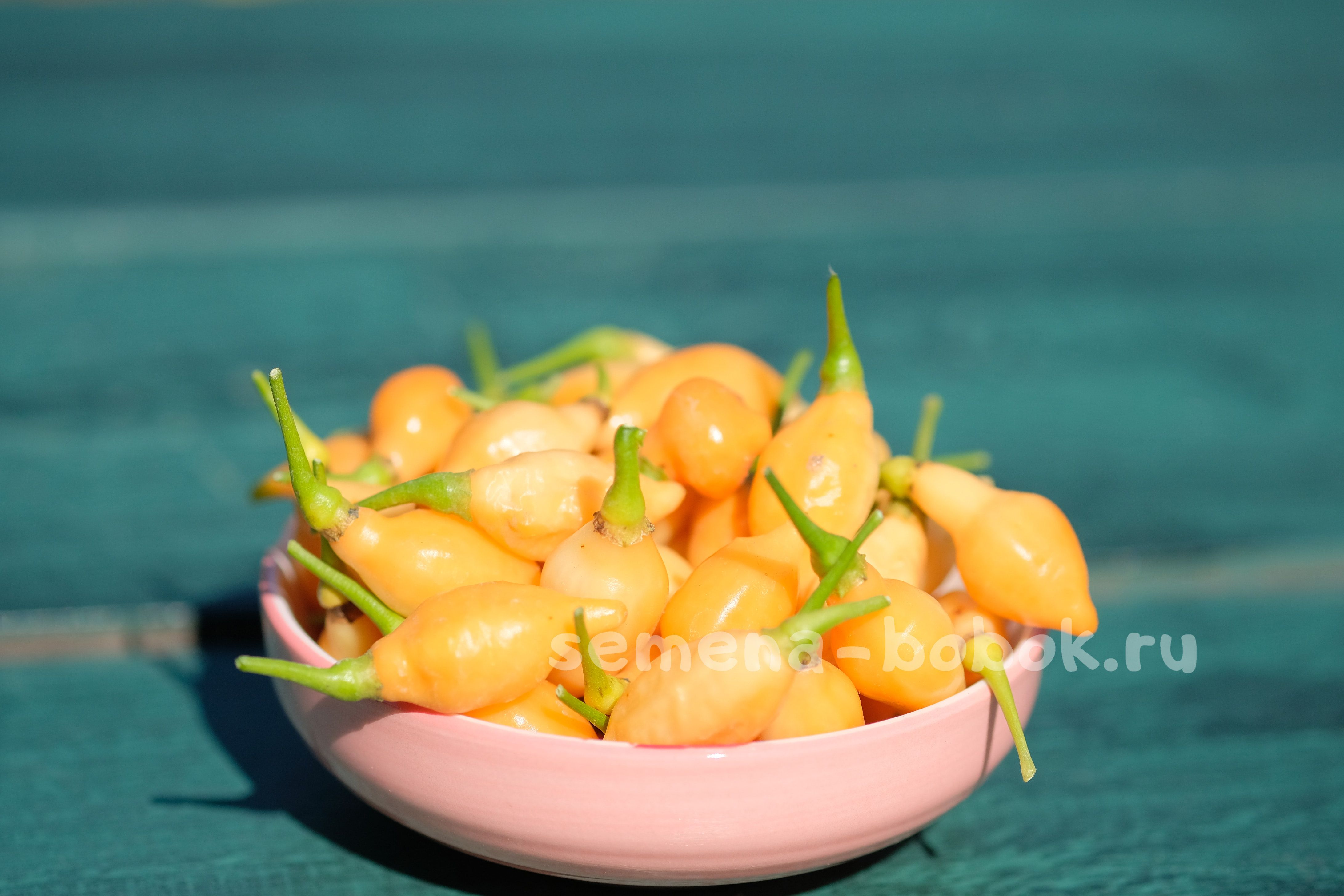 Удивительный перец родом из Бразилии. Его название с португальского переводится как "оранжевая тыковка". Вероятно, это из-за того, что форма стручков напоминает форму тыквы баттернат. Куст очень мощный, высокий (выше 1.5 метров при выращивании в кашпо на 12 литров), в грунте может вырасти за 2 м. Очень урожайный, после цветения весь покрыт небольшими оранжевыми перчиками в несколько ярусов. Вкус и аромат потрясающий! Очень хорош для приготовления соусов, цельноплодного консервирования. Острота комфортная, 25-30 тыс. shu. Замечательный, редкий сорт перца.