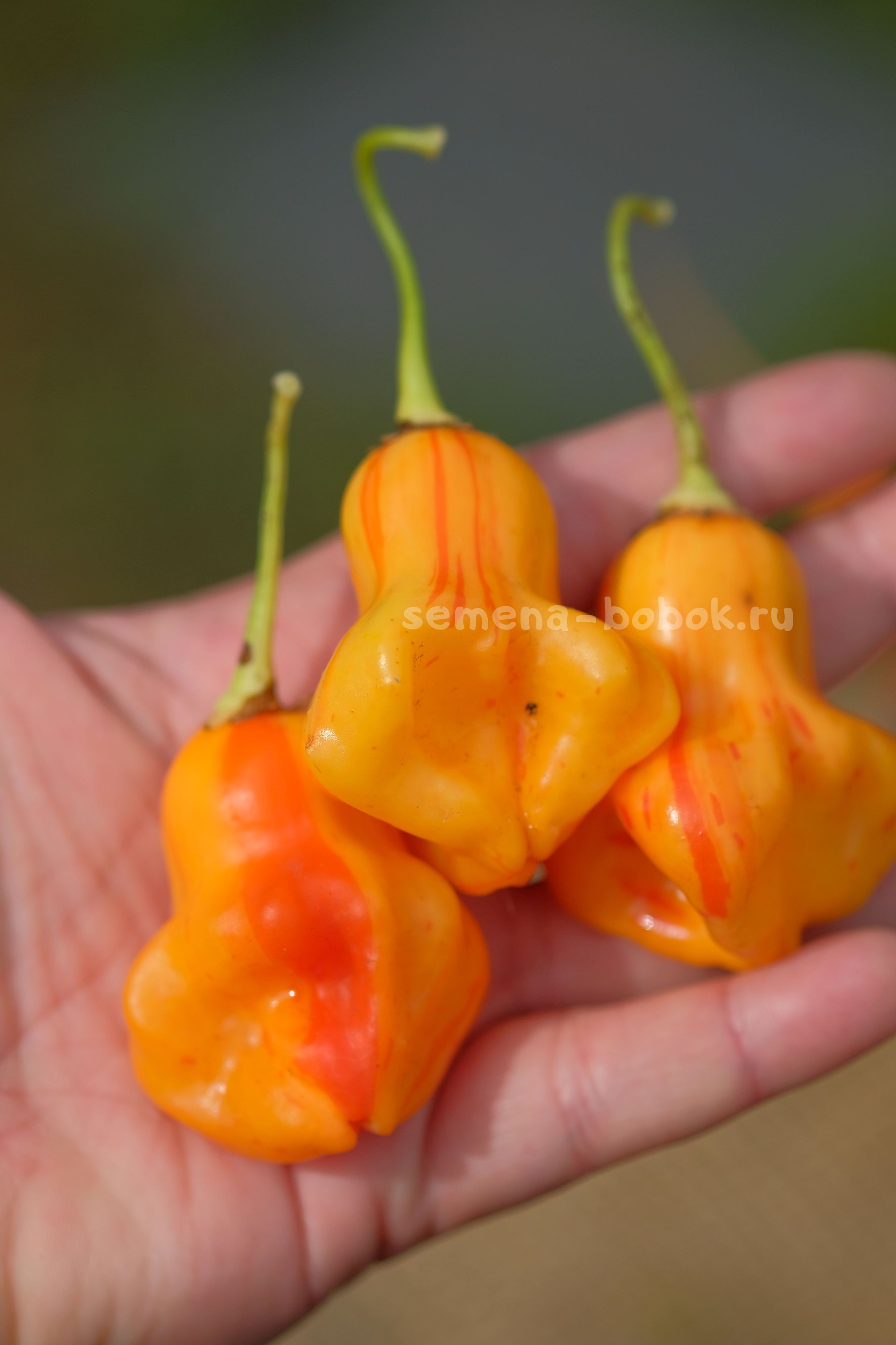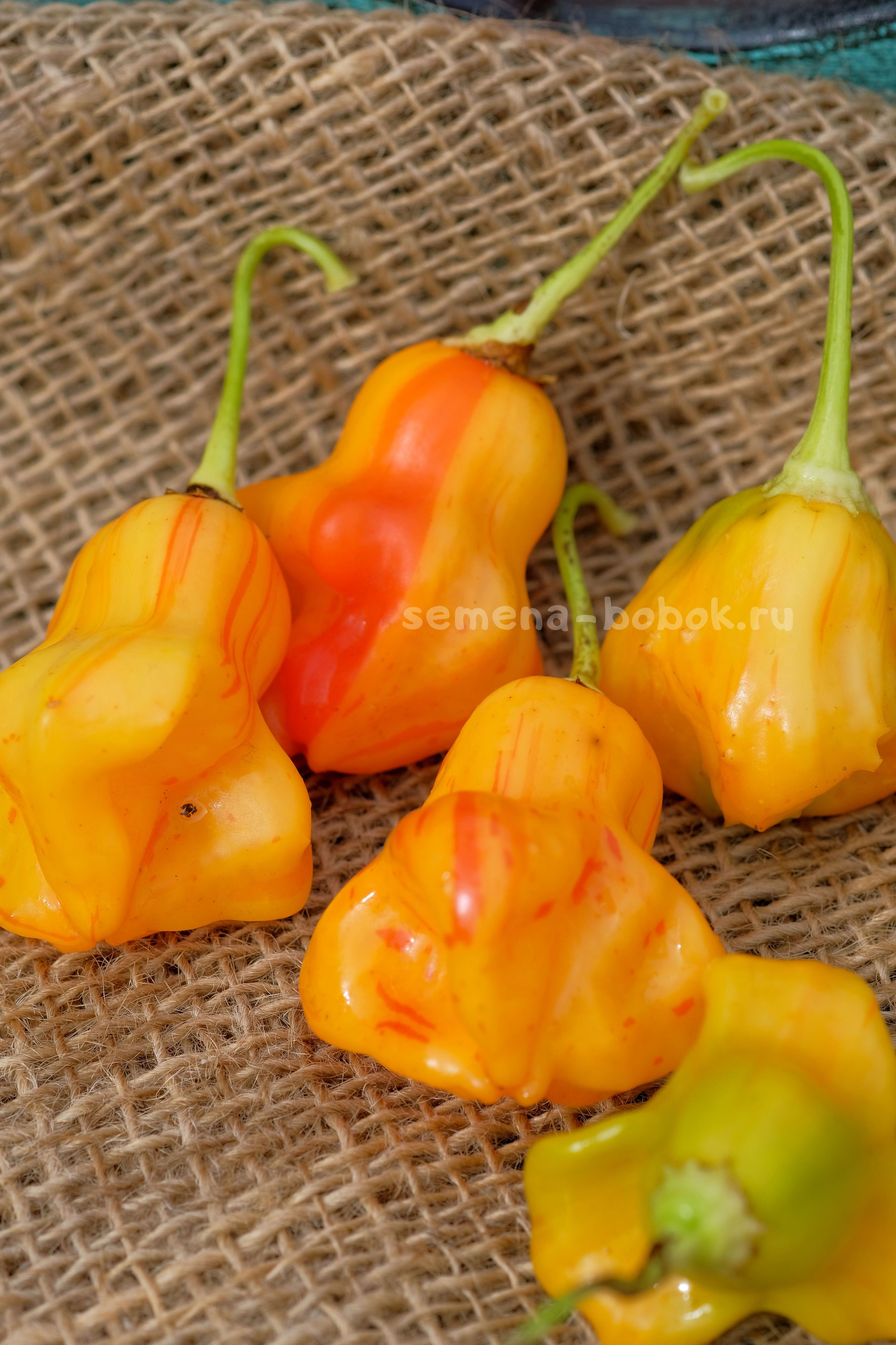 В итоге имеем необыкновенной расцветки колокольчики - желтые в оранжевую полоску, полоски на всех стручках разные, каждый перчик уникален в своем роде. Вкус типичный для перца рода Баккатум - сладкий,фруктовый, хрусткий, с остротой около 10-15 тыс., которая сосредоточена в основном вокруг семян.