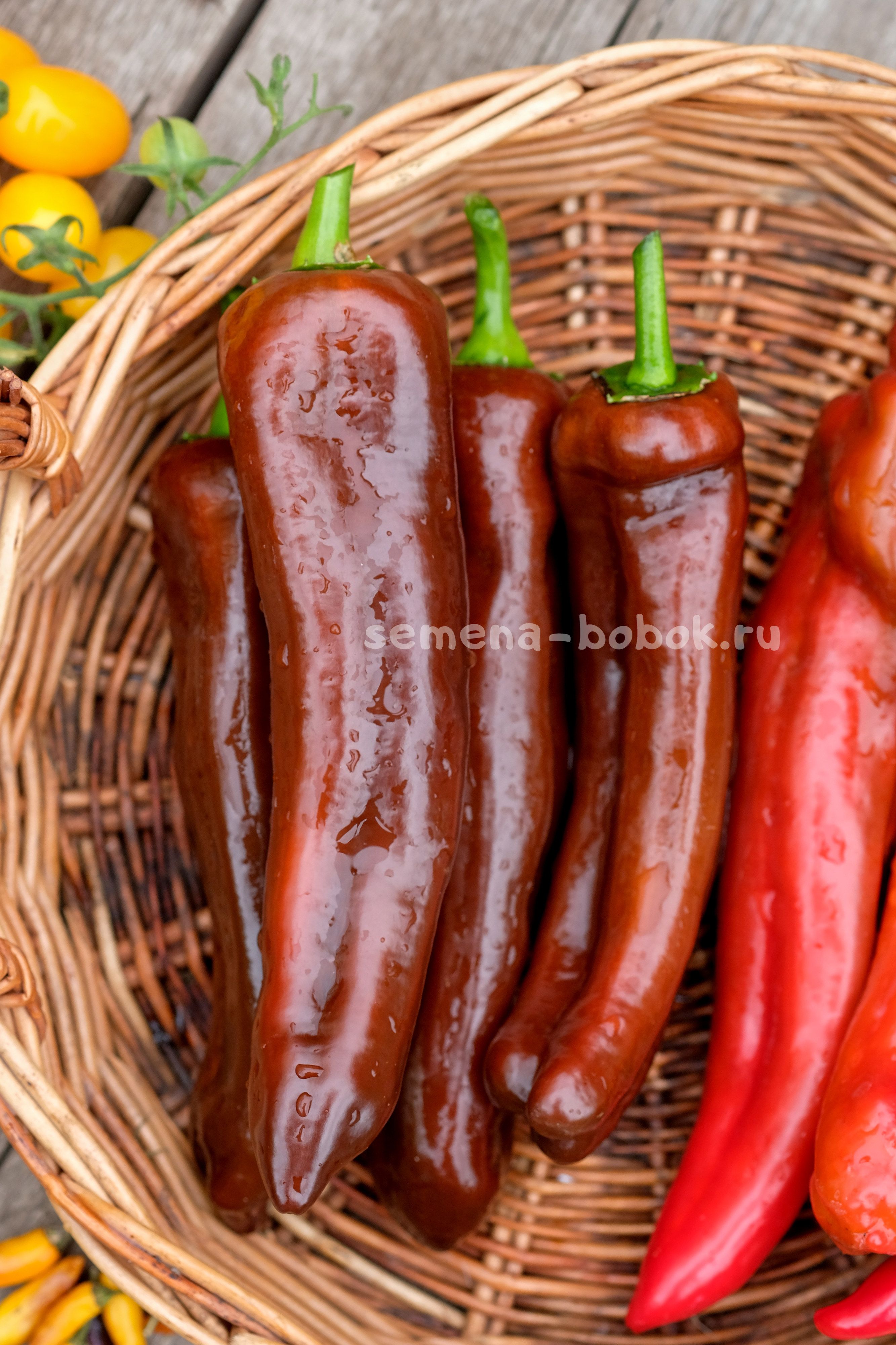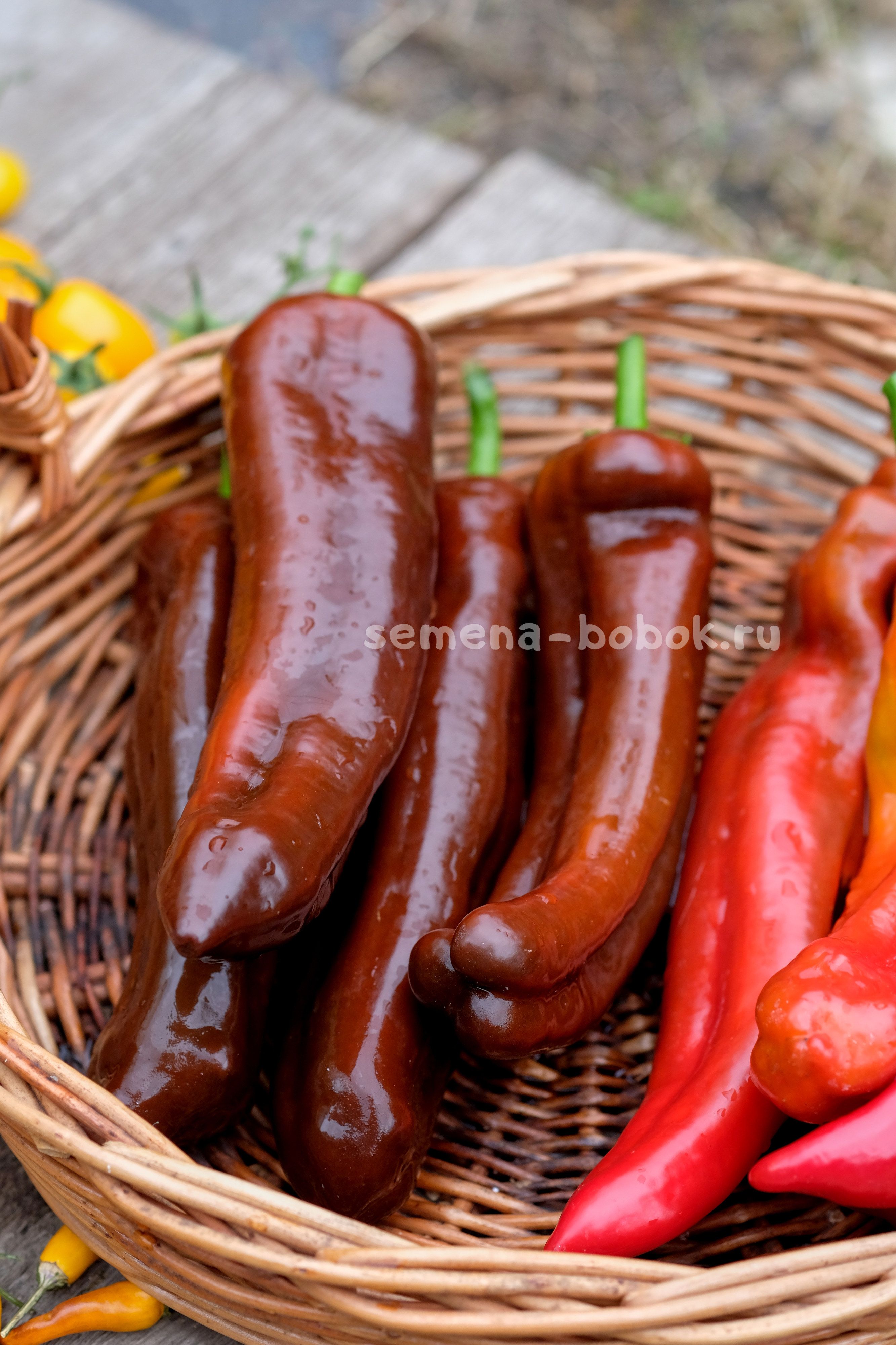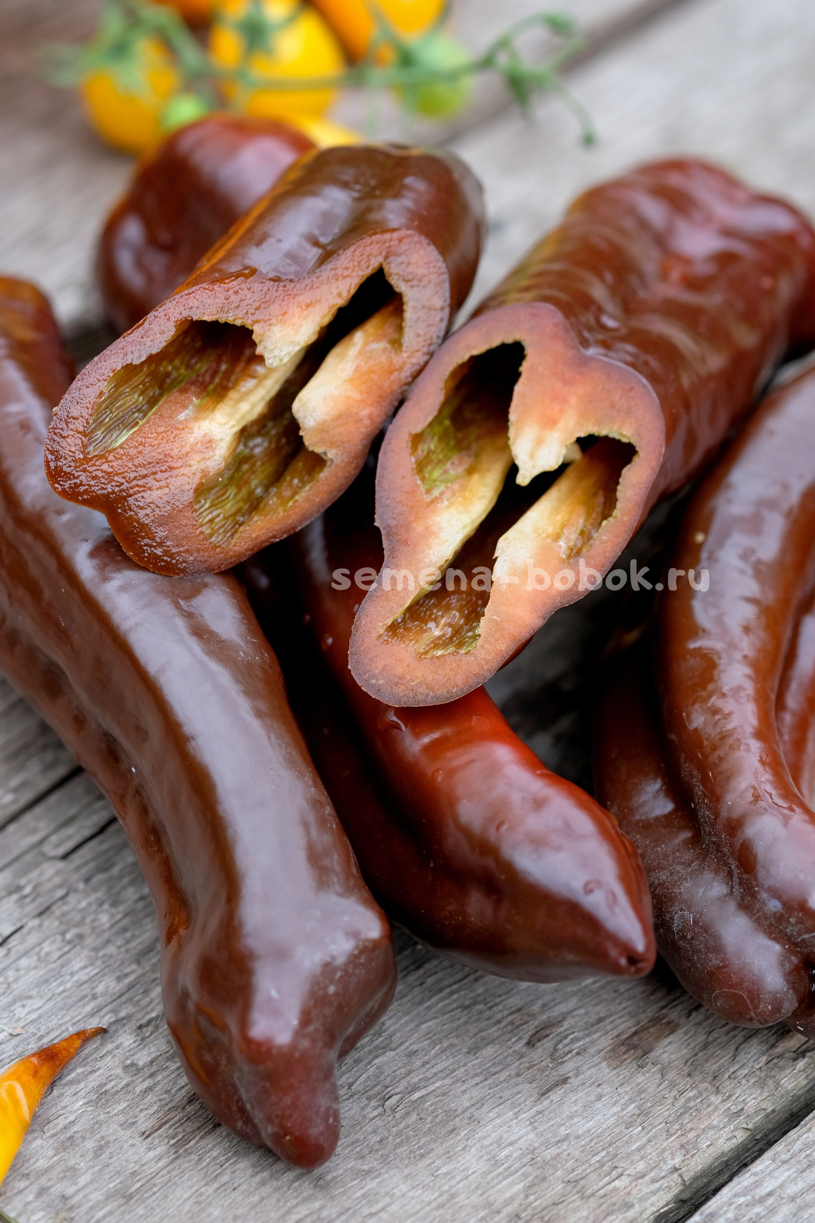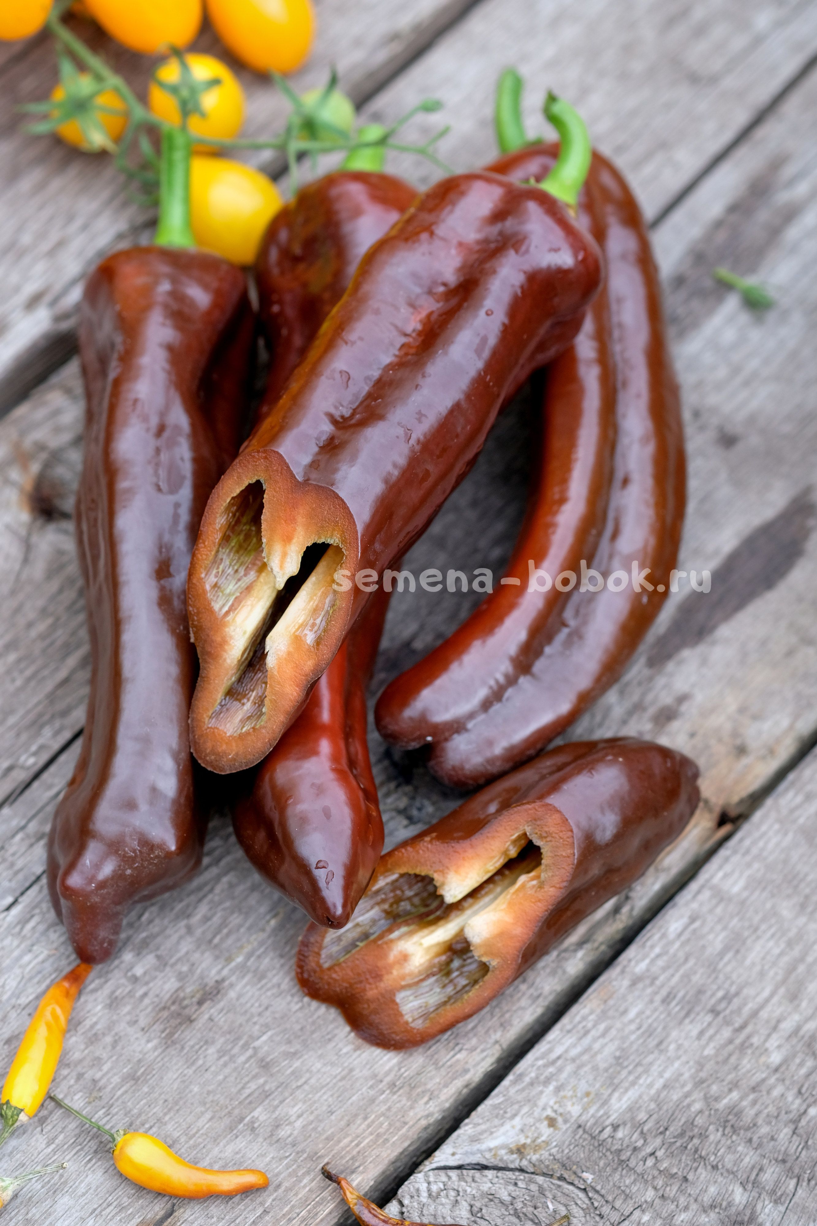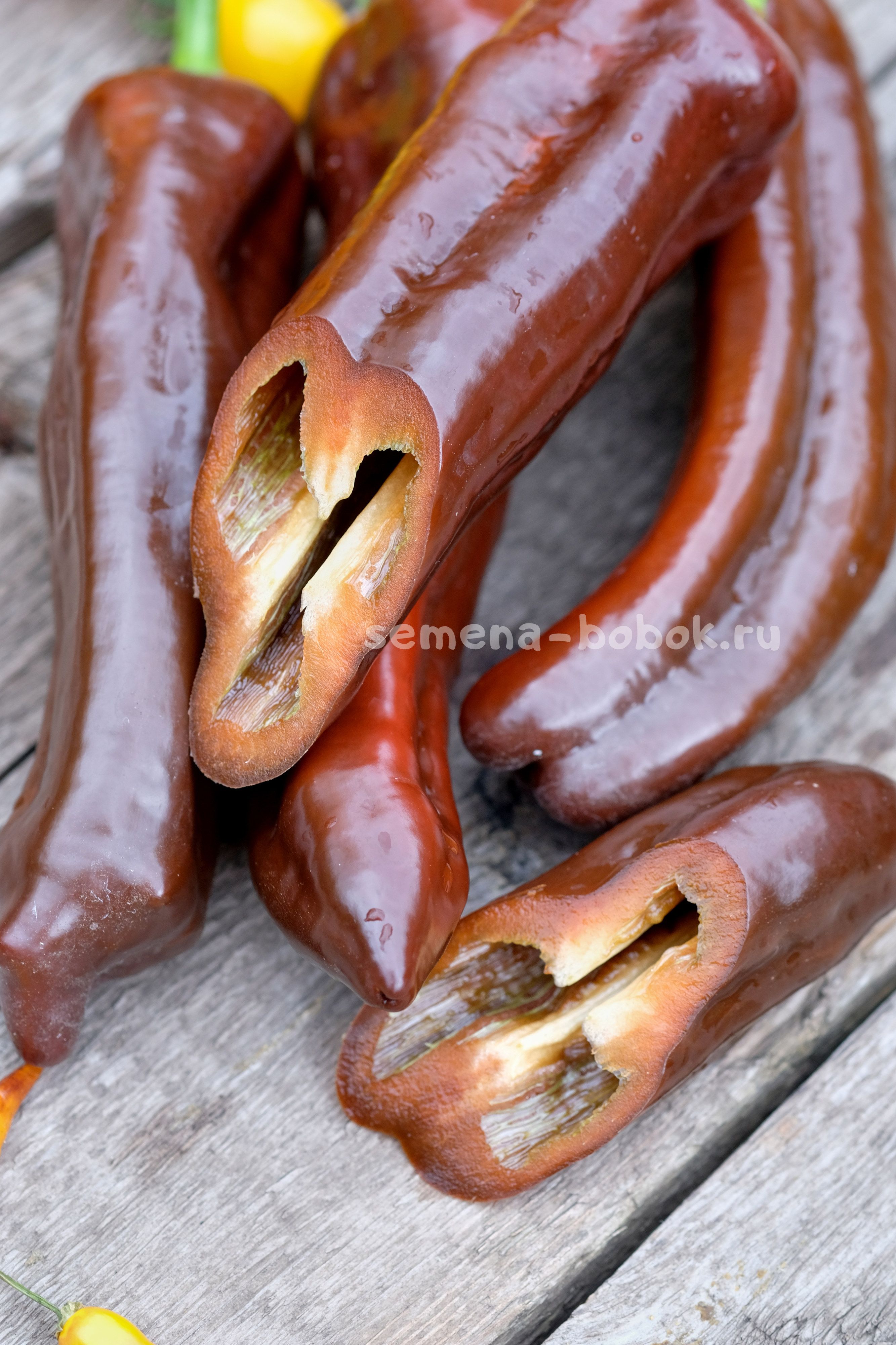 Перцы длинные, конусовидные, сортотипа капия, шоколадно-коричневого цвета. Очень вкусный, очень сладкий, хрустящий, стенка 6 мм. Кусты в открытом грунте были 90 см. Плоды длинные, красивые, до 30 см длинной. Первые плоды у меня упирались в грунт). Среднеспелый.