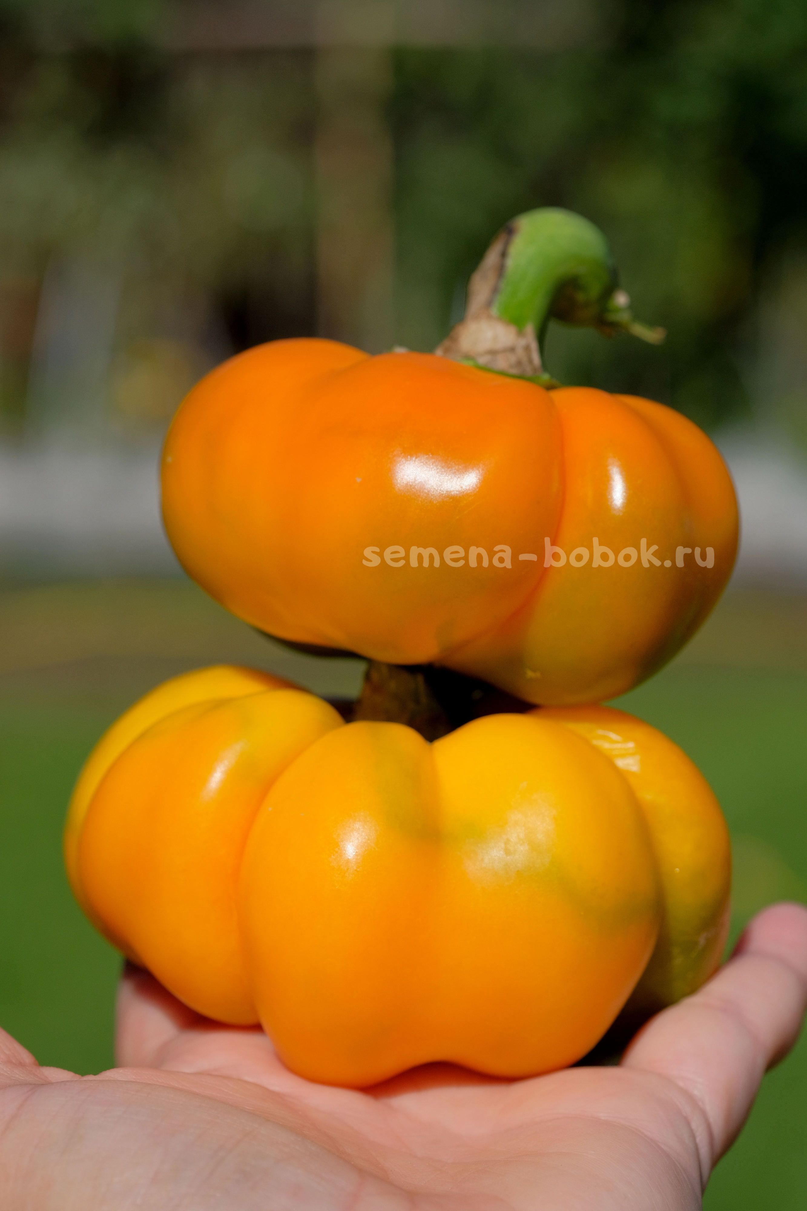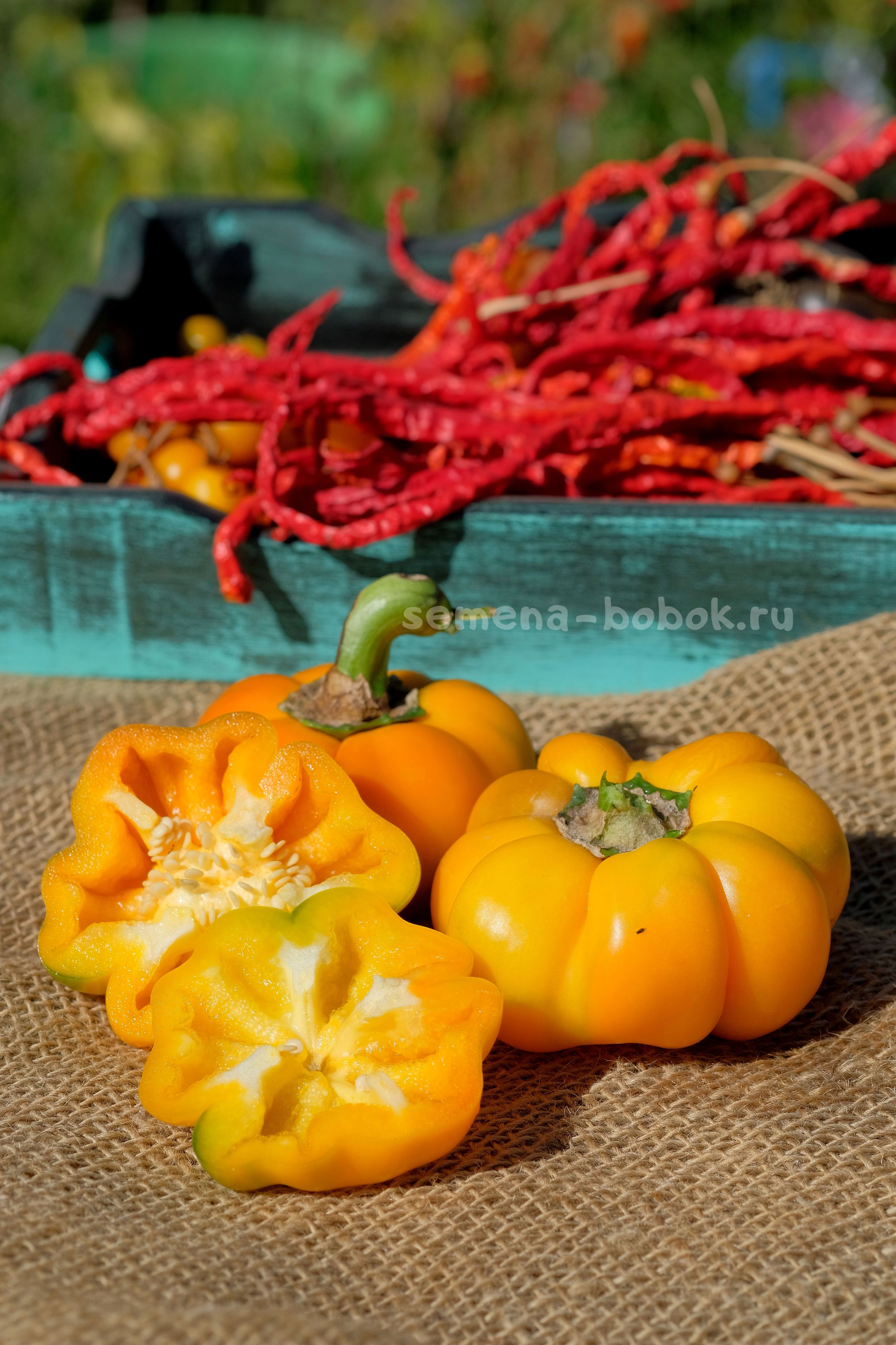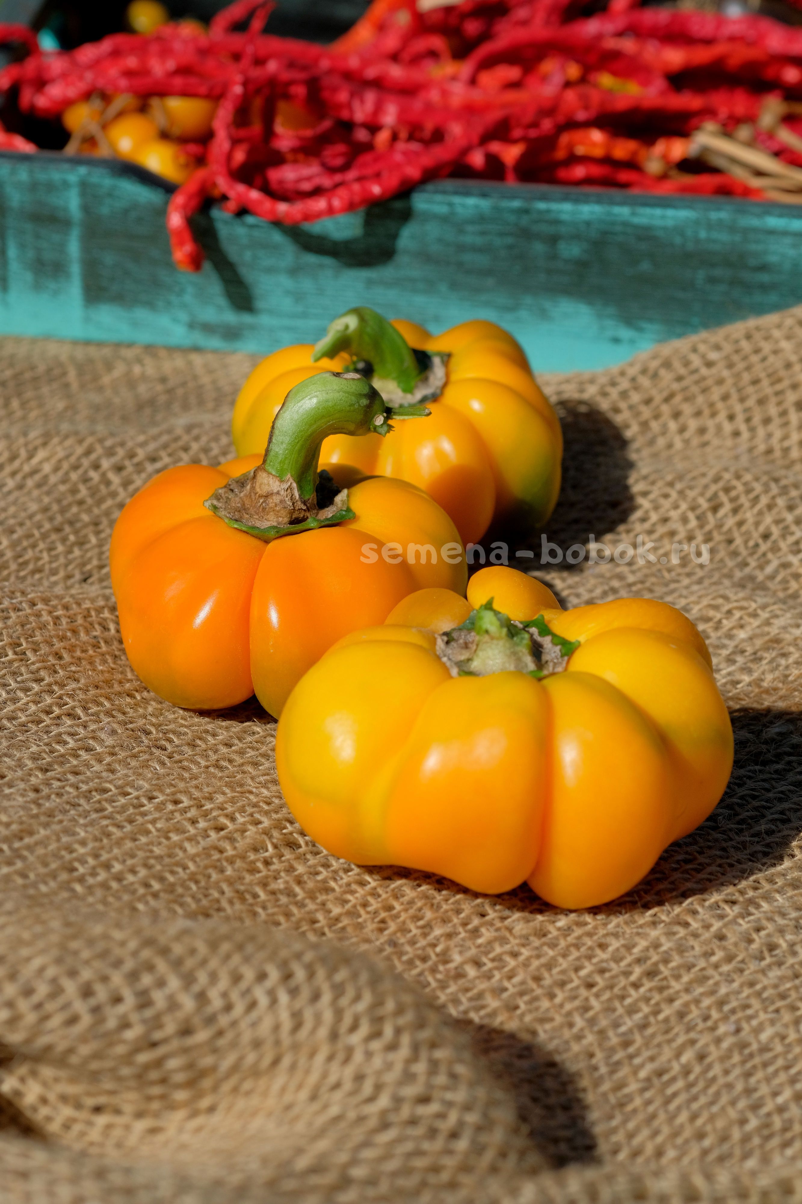 Ну до чего хороши эти желто-оранжевые плюшки! Выглядят как мини-тыковки - такие же ребристые. Куст невысокий, в теплице вырос до 70 см, увешан довольно крупными перчиками, массой около 200 г. Стенка 7-8 мм, сочная, сладкая, мясистая. Хороши для фаршировки, лечо, заморозки. И для красивой подачи на стол.