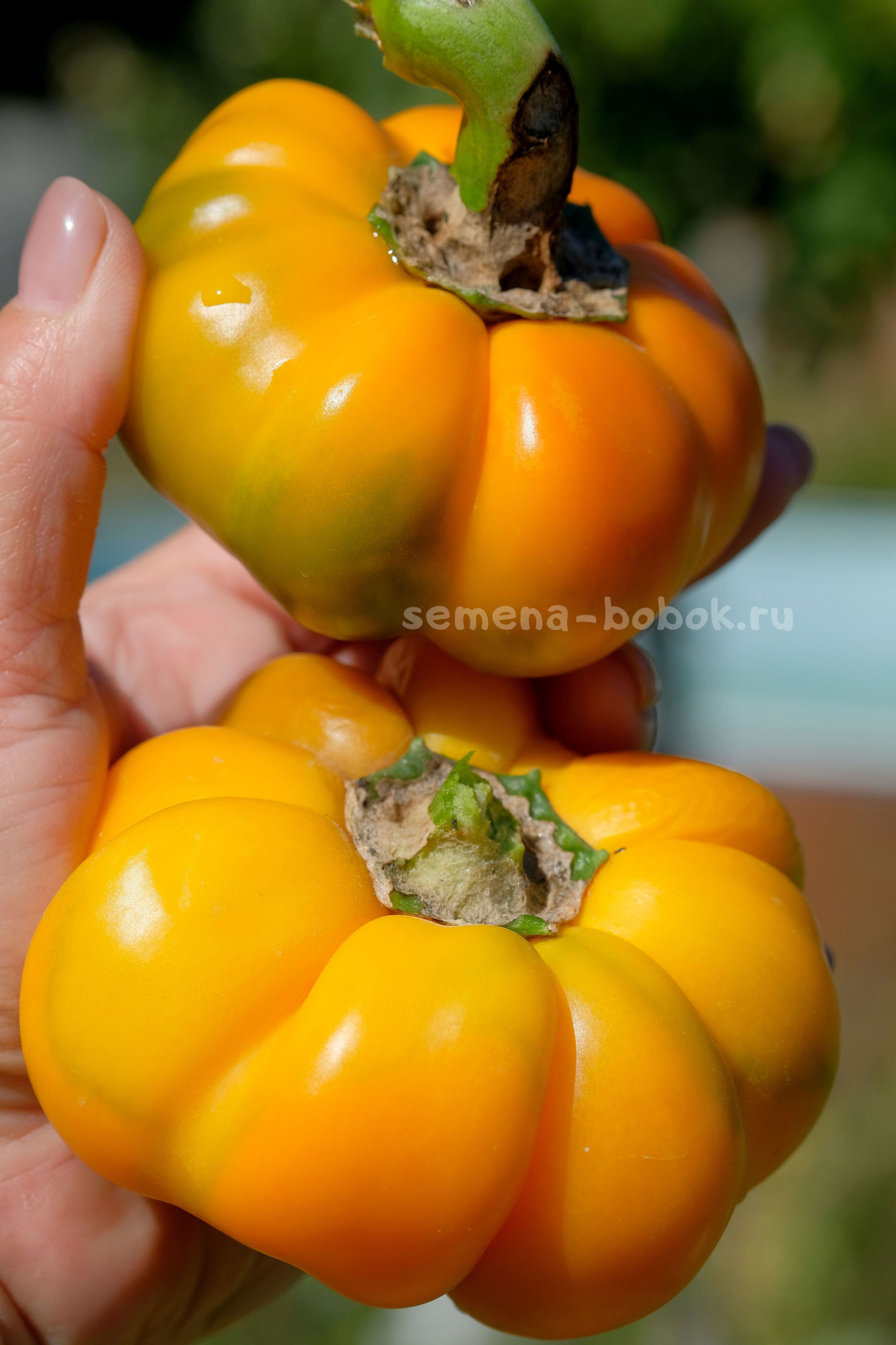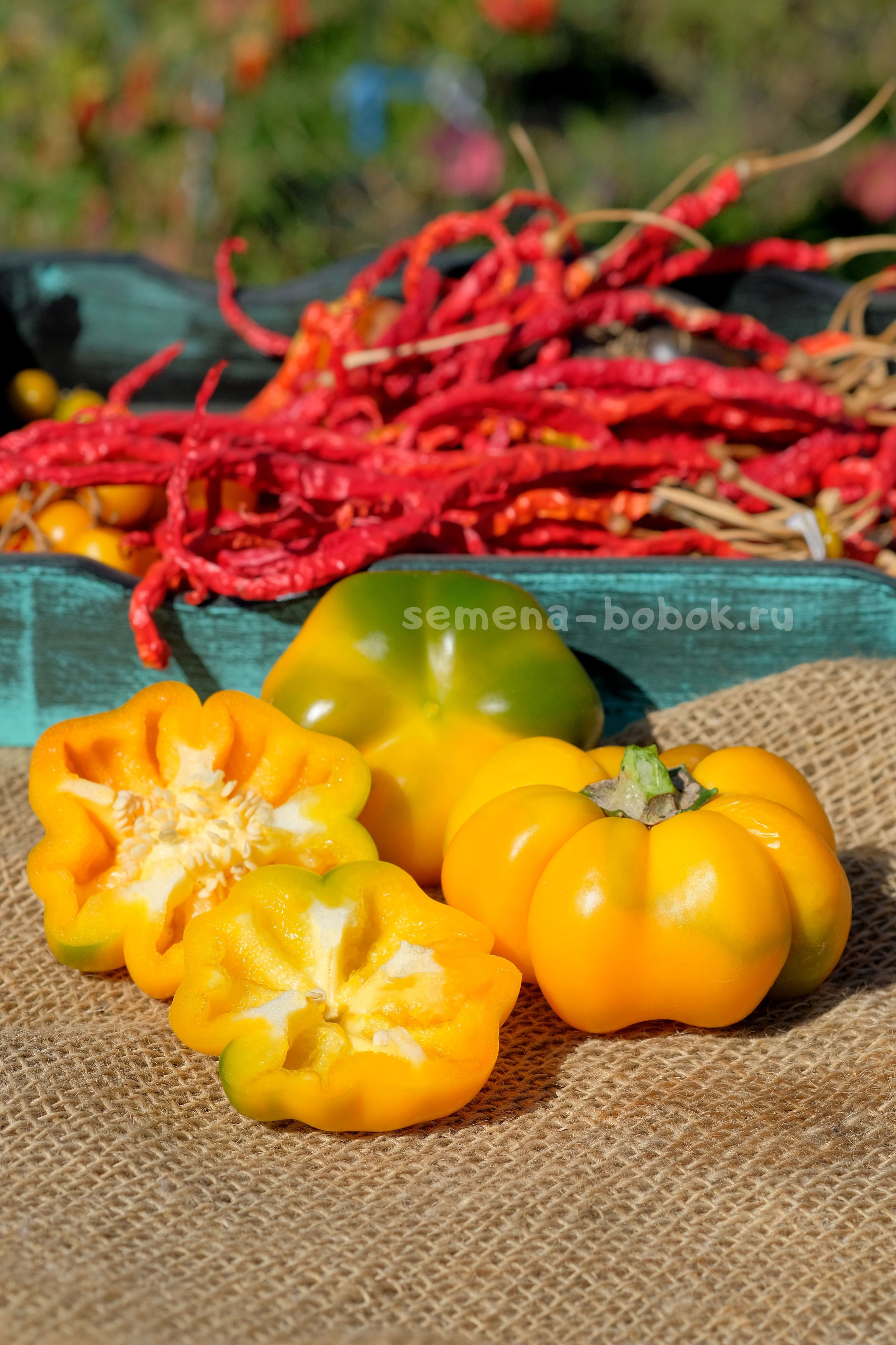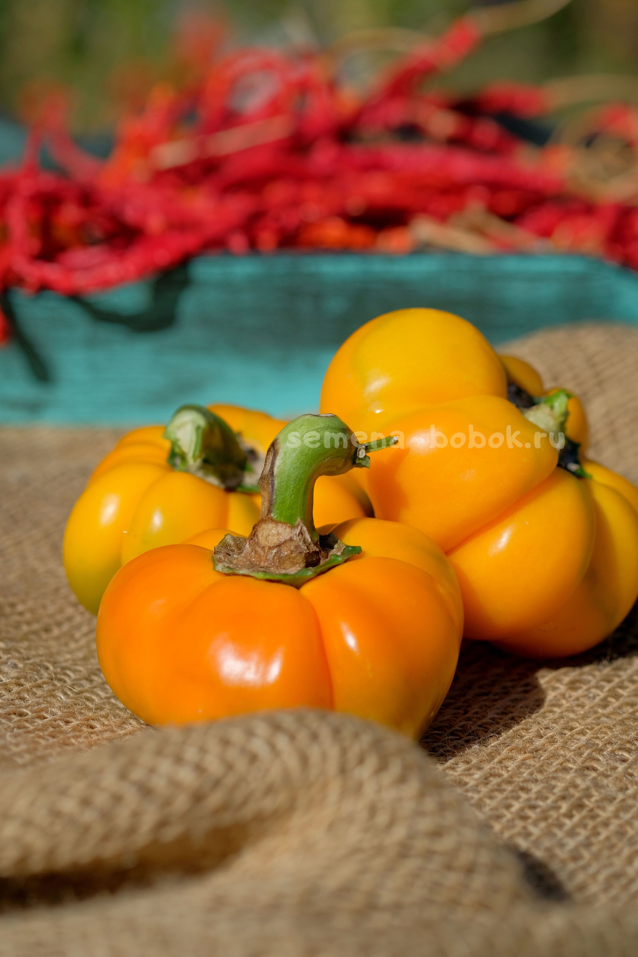 Ну до чего хороши эти желто-оранжевые плюшки! Выглядят как мини-тыковки - такие же ребристые. Куст невысокий, в теплице вырос до 70 см, увешан довольно крупными перчиками, массой около 200 г. Стенка 7-8 мм, сочная, сладкая, мясистая. Хороши для фаршировки, лечо, заморозки. И для красивой подачи на стол.
