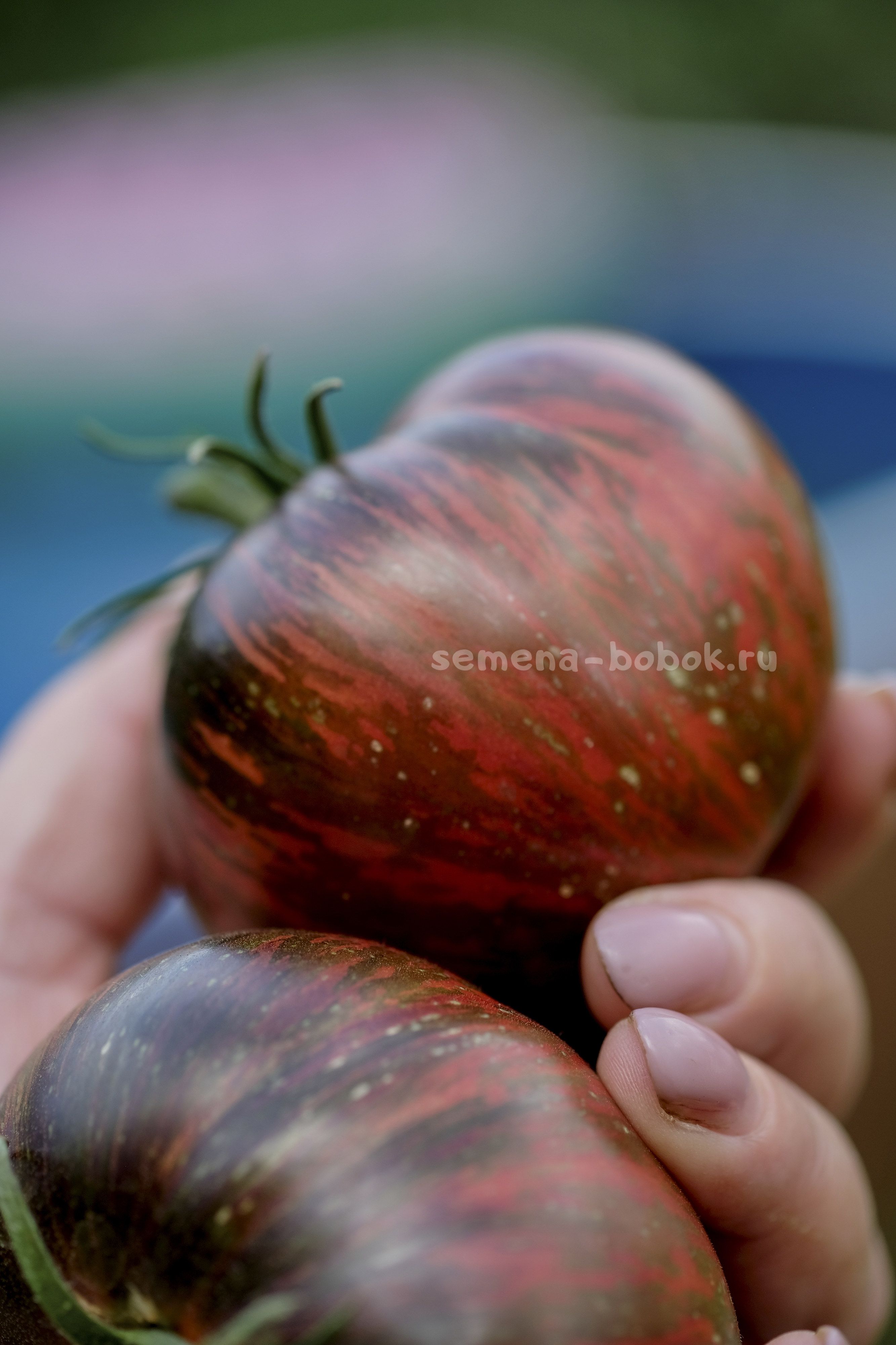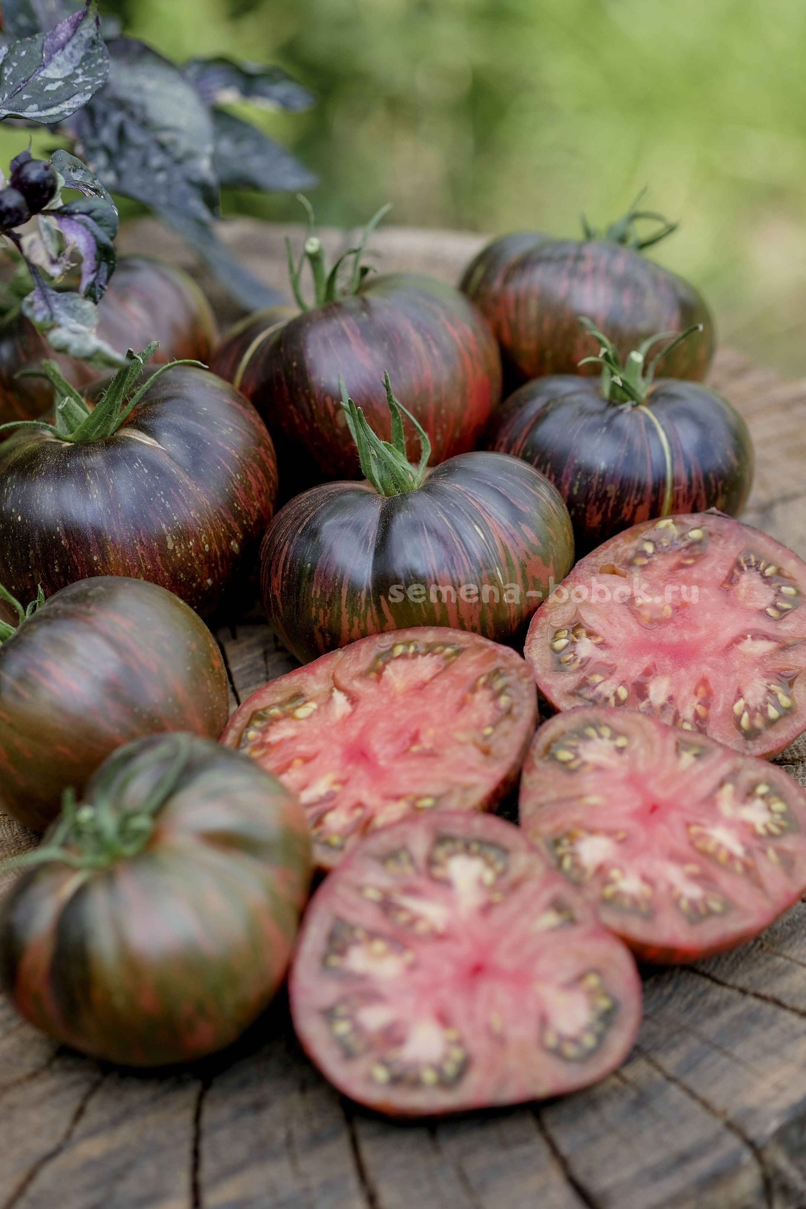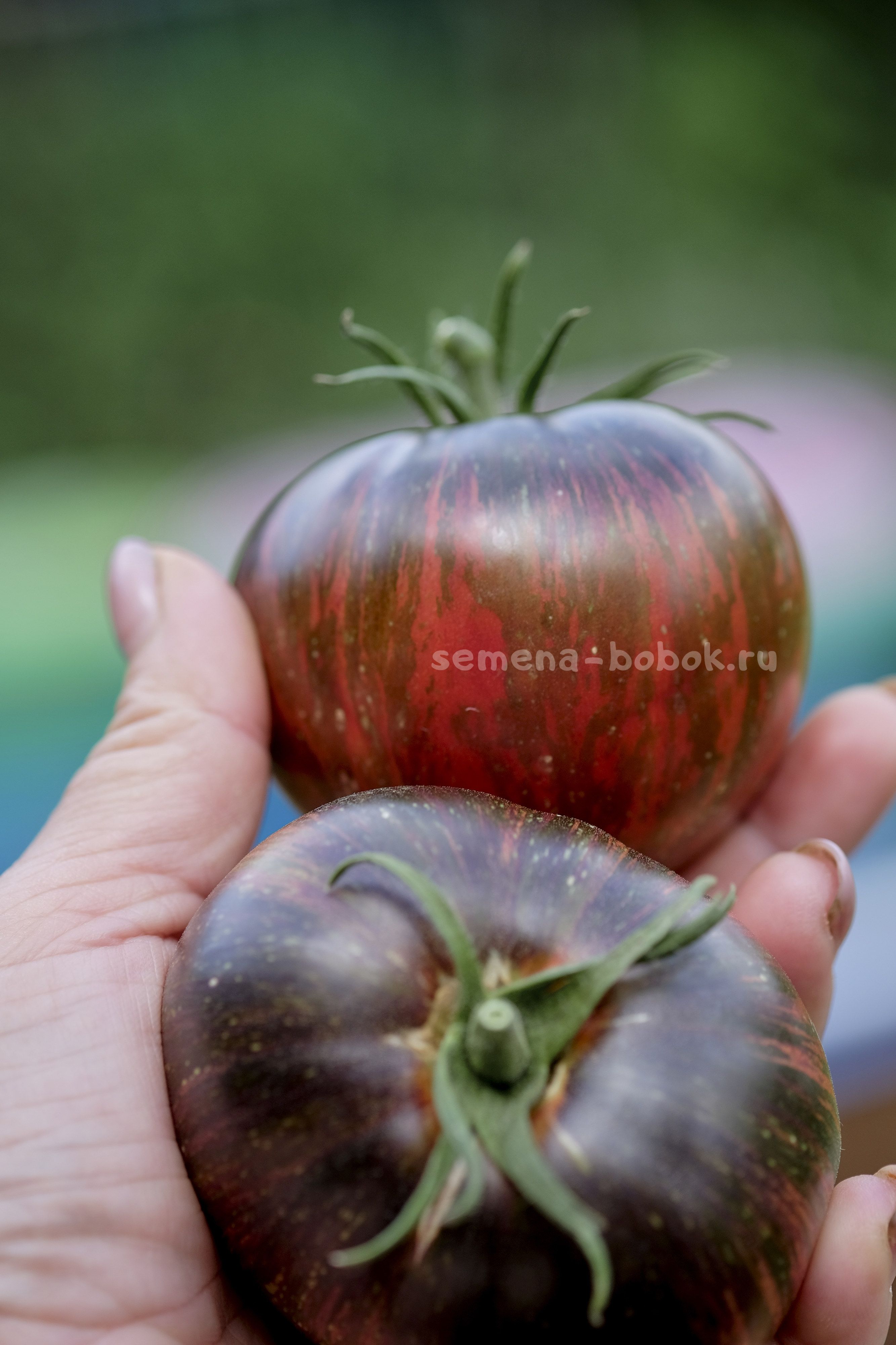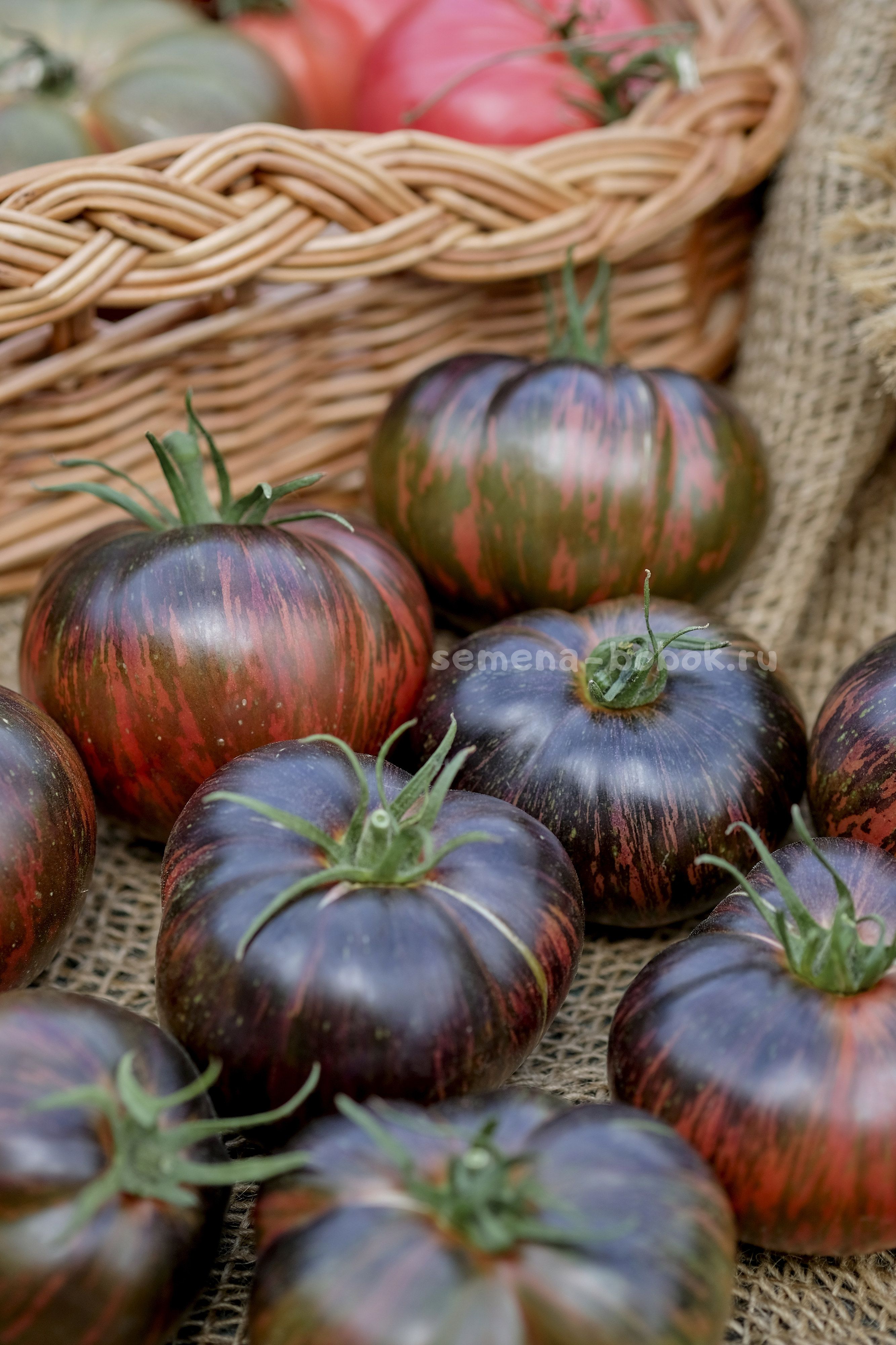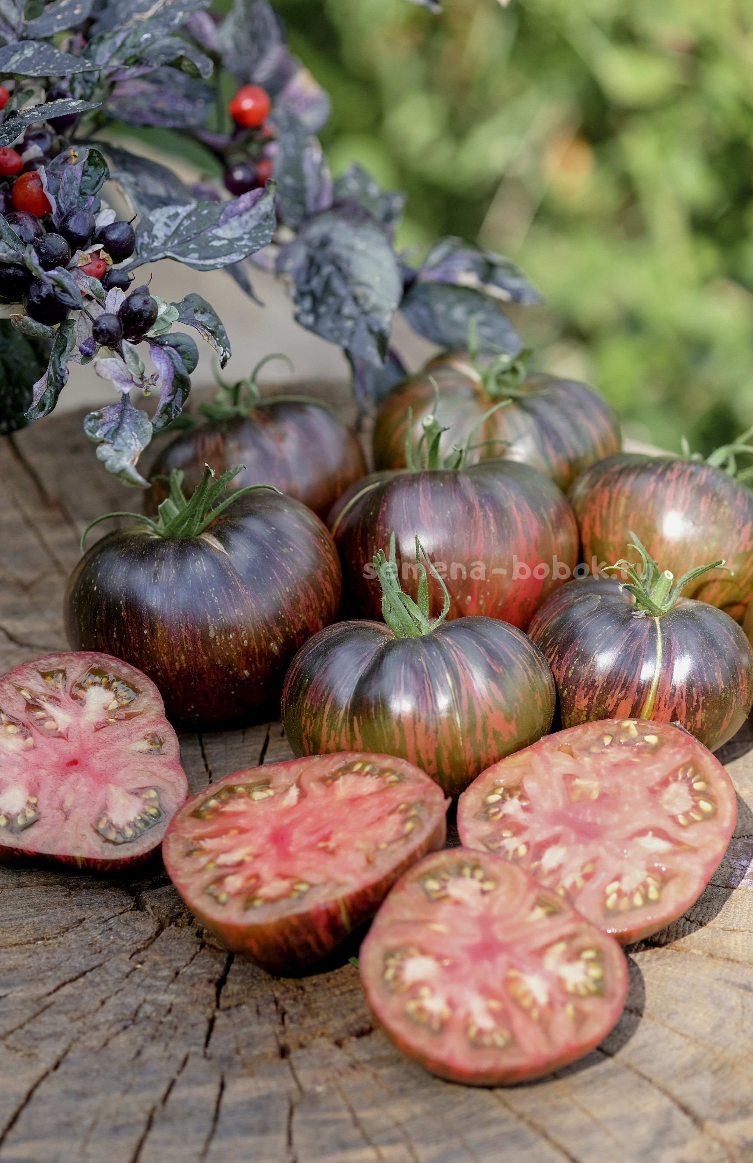 Очень красивая экзотическая окраска плодов - бордовые, с зелеными и оранжевыми полосками и антоциановыми плечиками. Мякоть бордо-малиновая, ароматная, с семенами в зеленом геле. Вкус яркий, сладкий, с небольшой томатной кислинкой. Помидоры плоскоокруглой формы, весом 200-400 г.