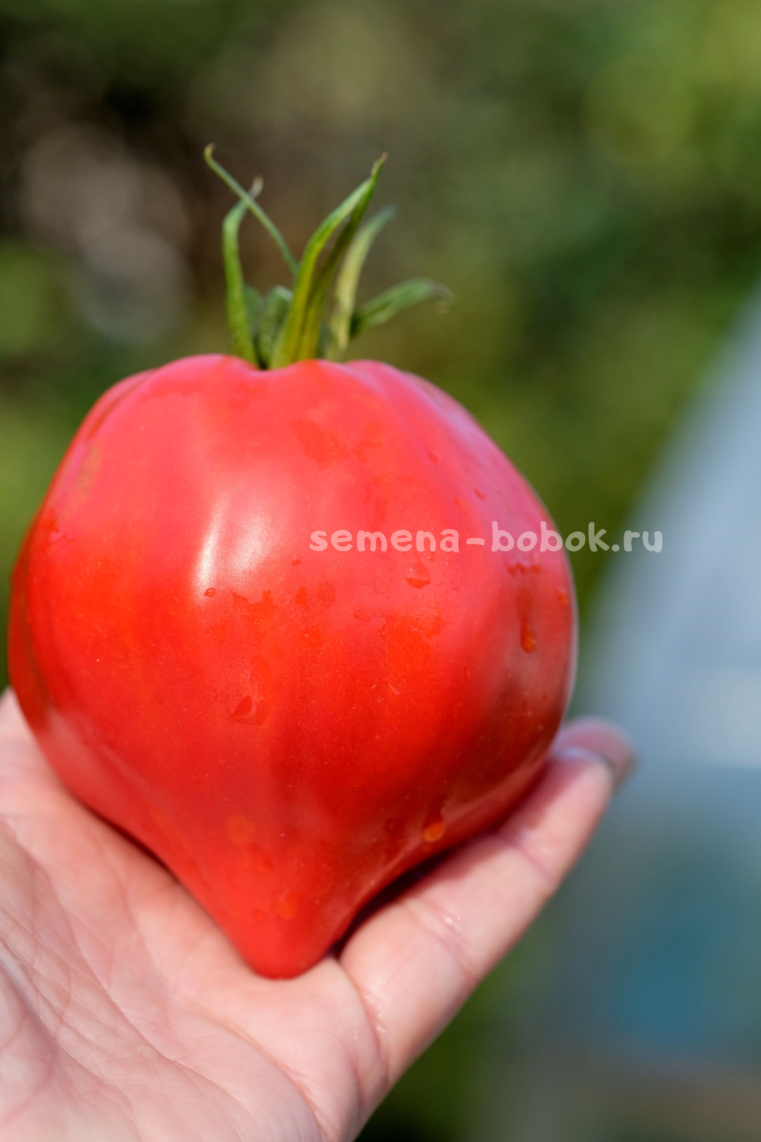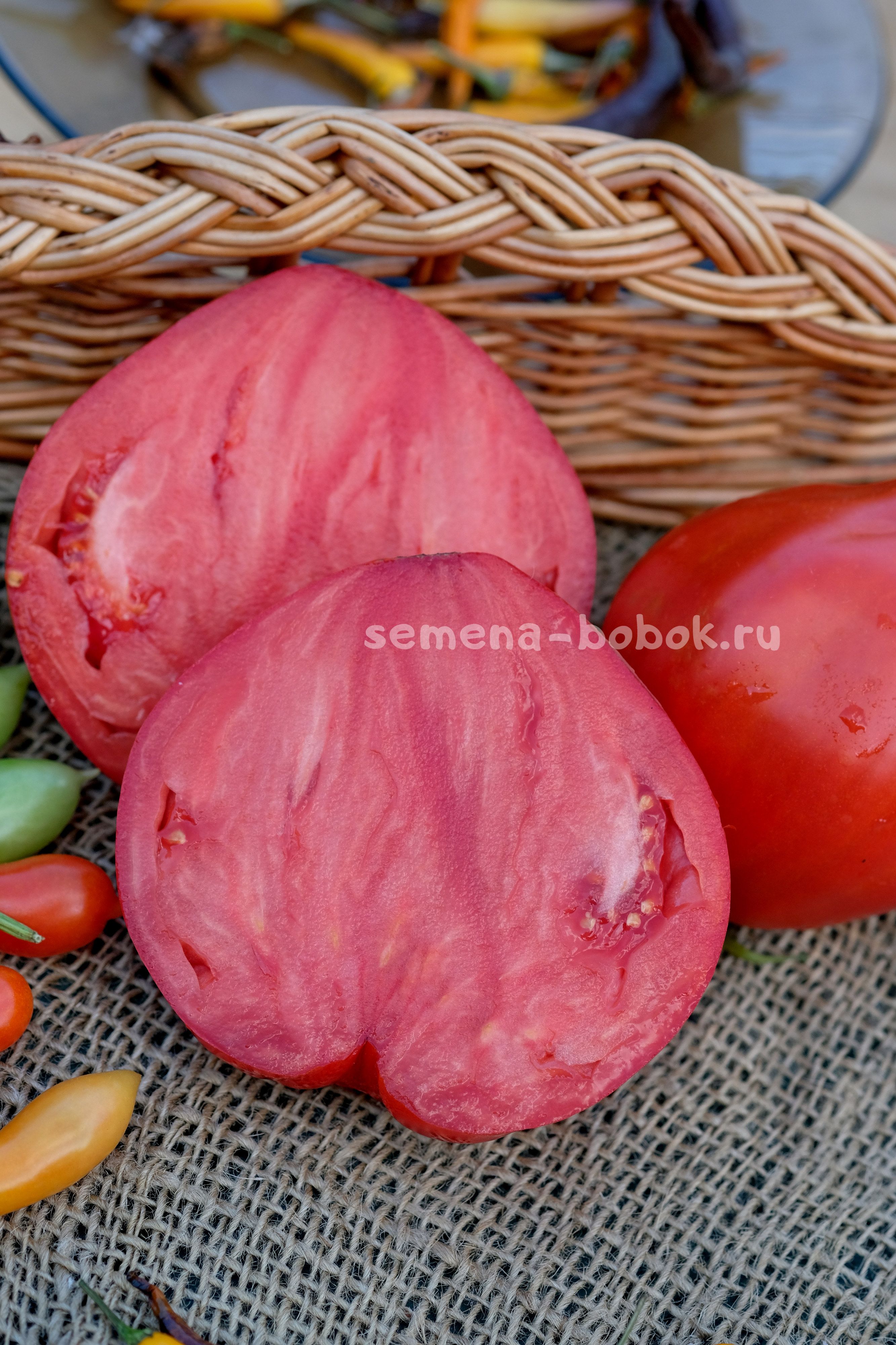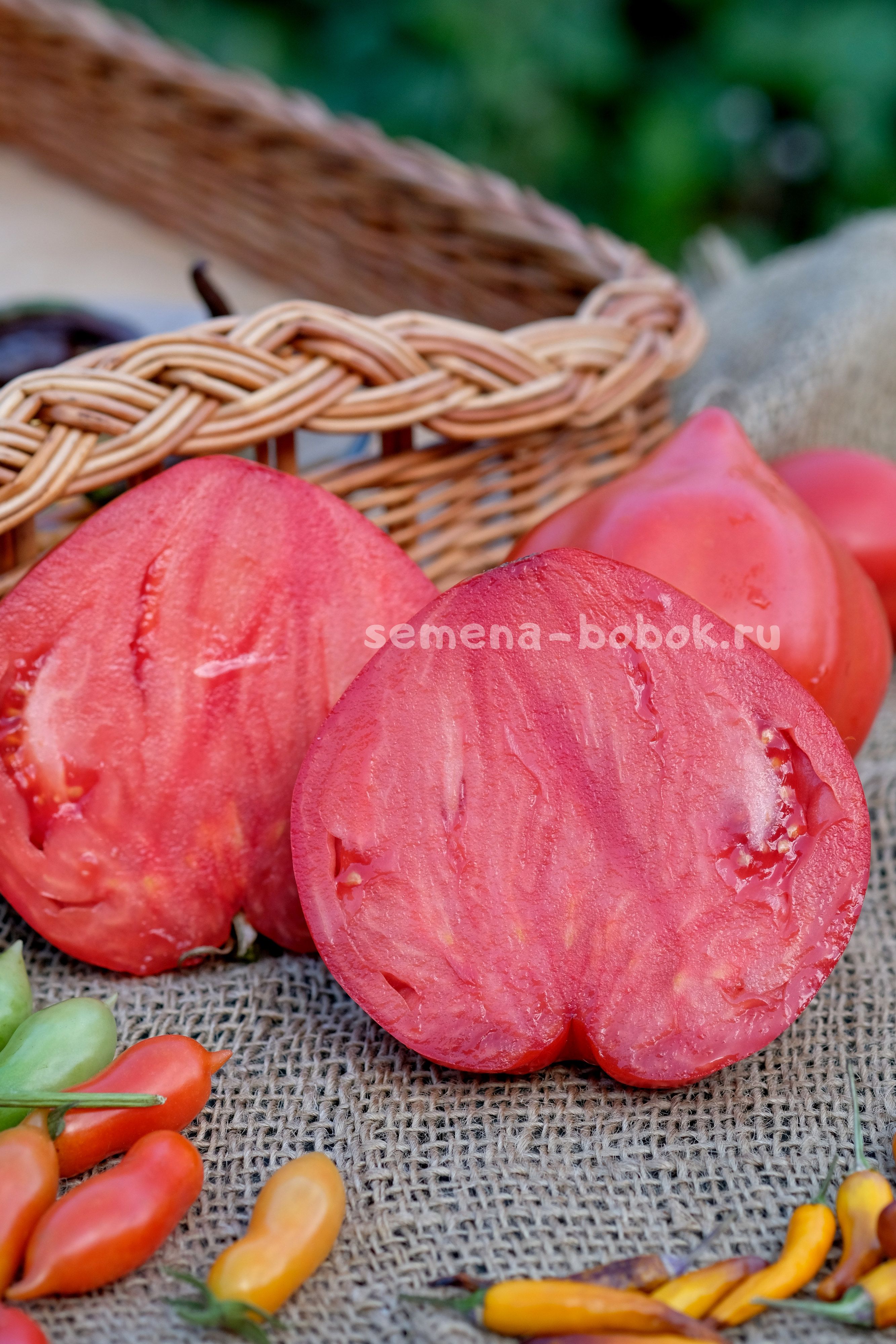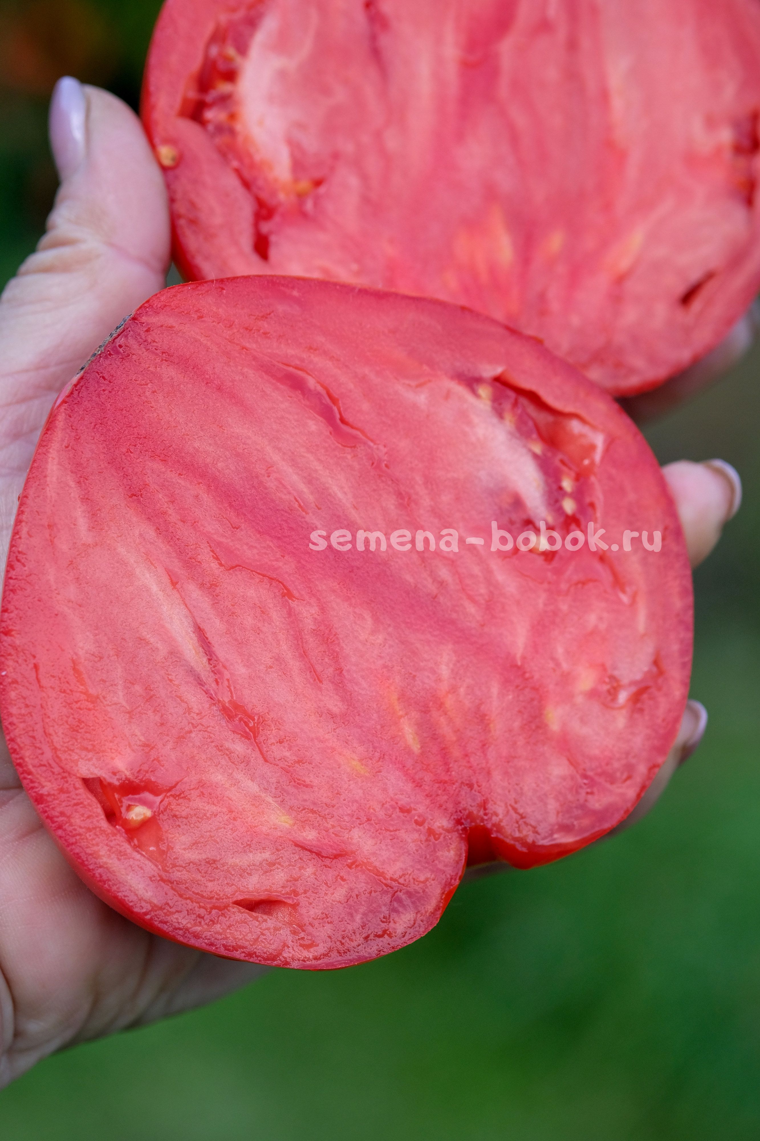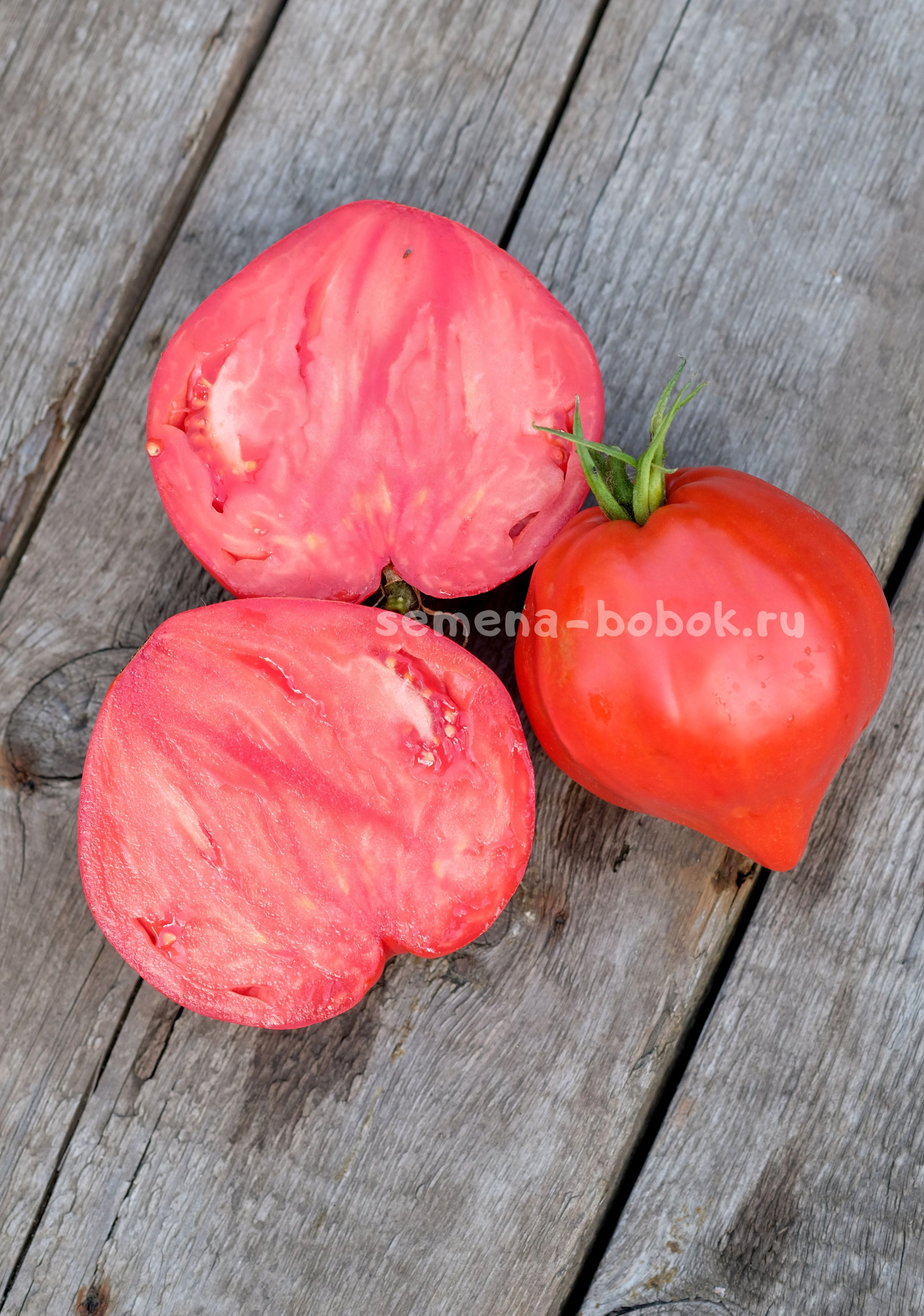 Куст индетерминантный, 1,7 м в ОГ, листья тонкие. Плоды крупные пухлые сердца красного цвета. На разрезе мякоть ярко-розового цвета, она как будто переливается перламутром!