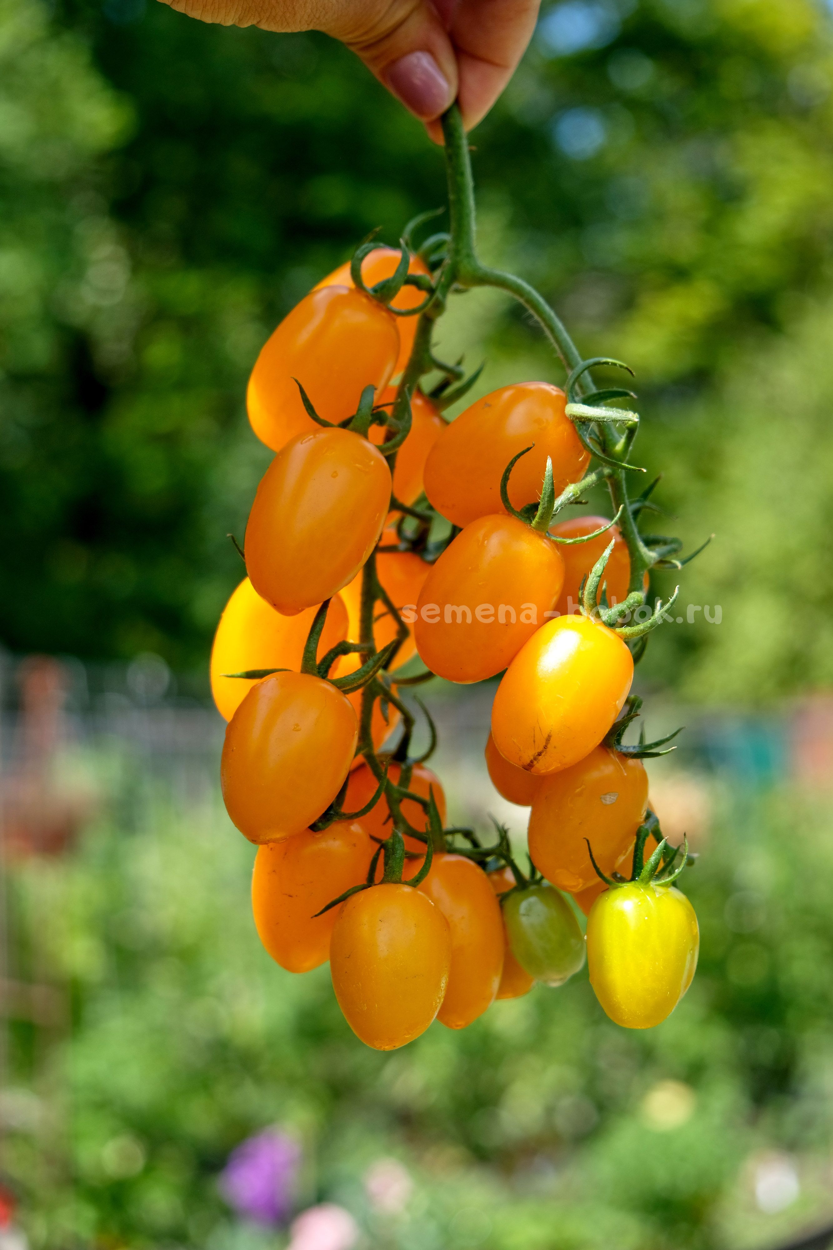 Сорт индетерминантный, выше 2-х метров даже в открытом грунте, устойчив к заболеваниям - к осени листва остается чистой, без грибковых болезней. Вяжет простые и сложные кисти желто-оранжевых чуть удлиненных черри-томатов. Помидорки имеют очень хорошую "товарность" - не трескаются, не осыпаются, долго могут висеть созревшими на кусте. Урожай можно снимать полными кистями.