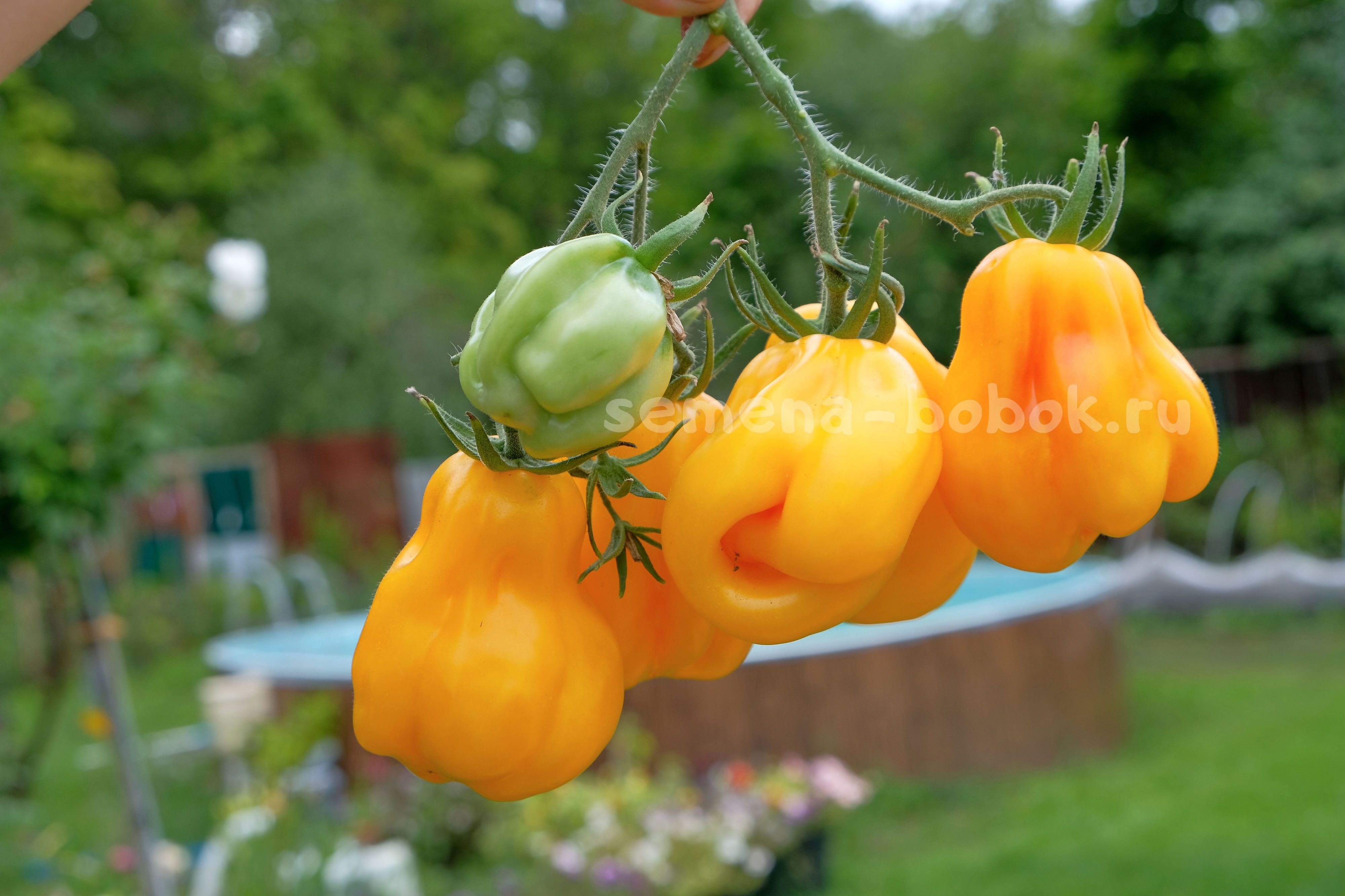 Драпированный удивил урожайностью - он рос в не самом светлом месте теплицы, его затеняли более мощные соседи, тем не менее, он не сбросил ни одного цветка. В кисти созревает одновременно 5-6 плодов. В полной спелости желтого цвета с легким розовым румянцем. Созревшими могут довольно приличное время повисеть. Мне было все не до них, висели больше месяца и не испортились.