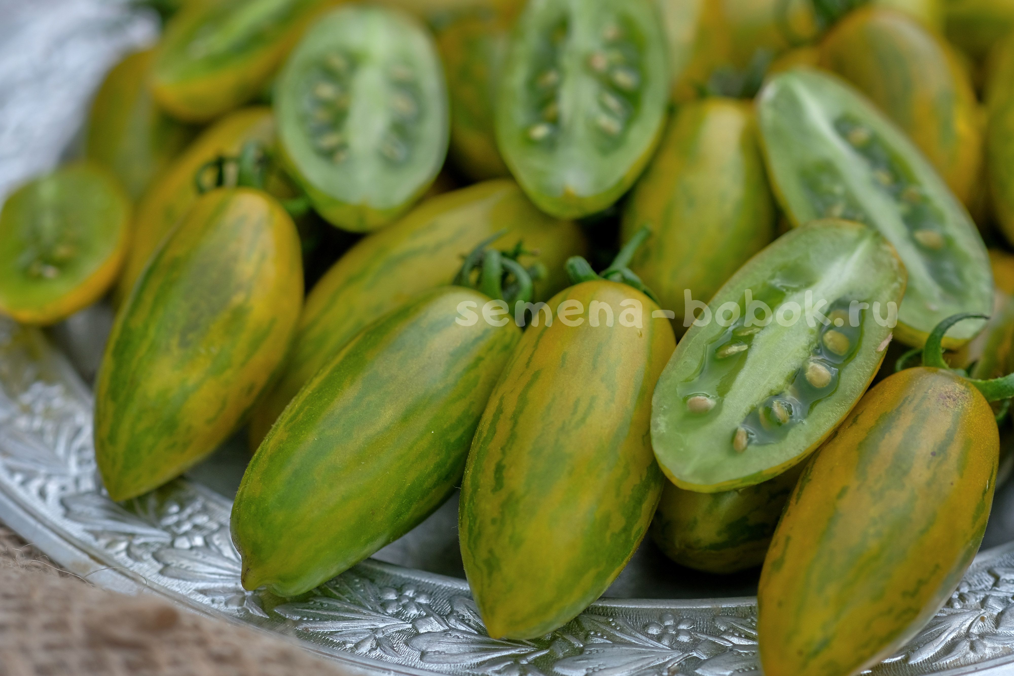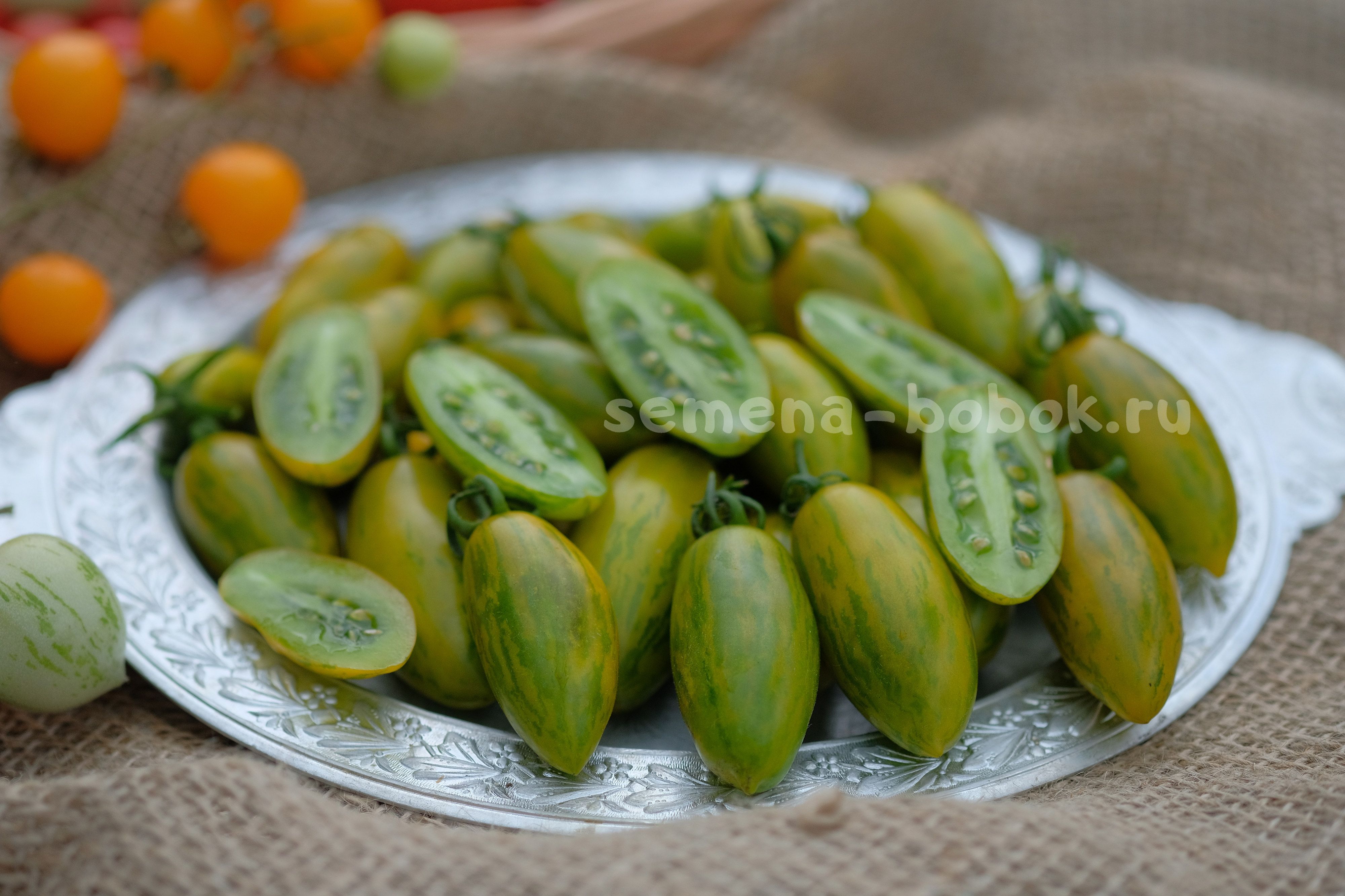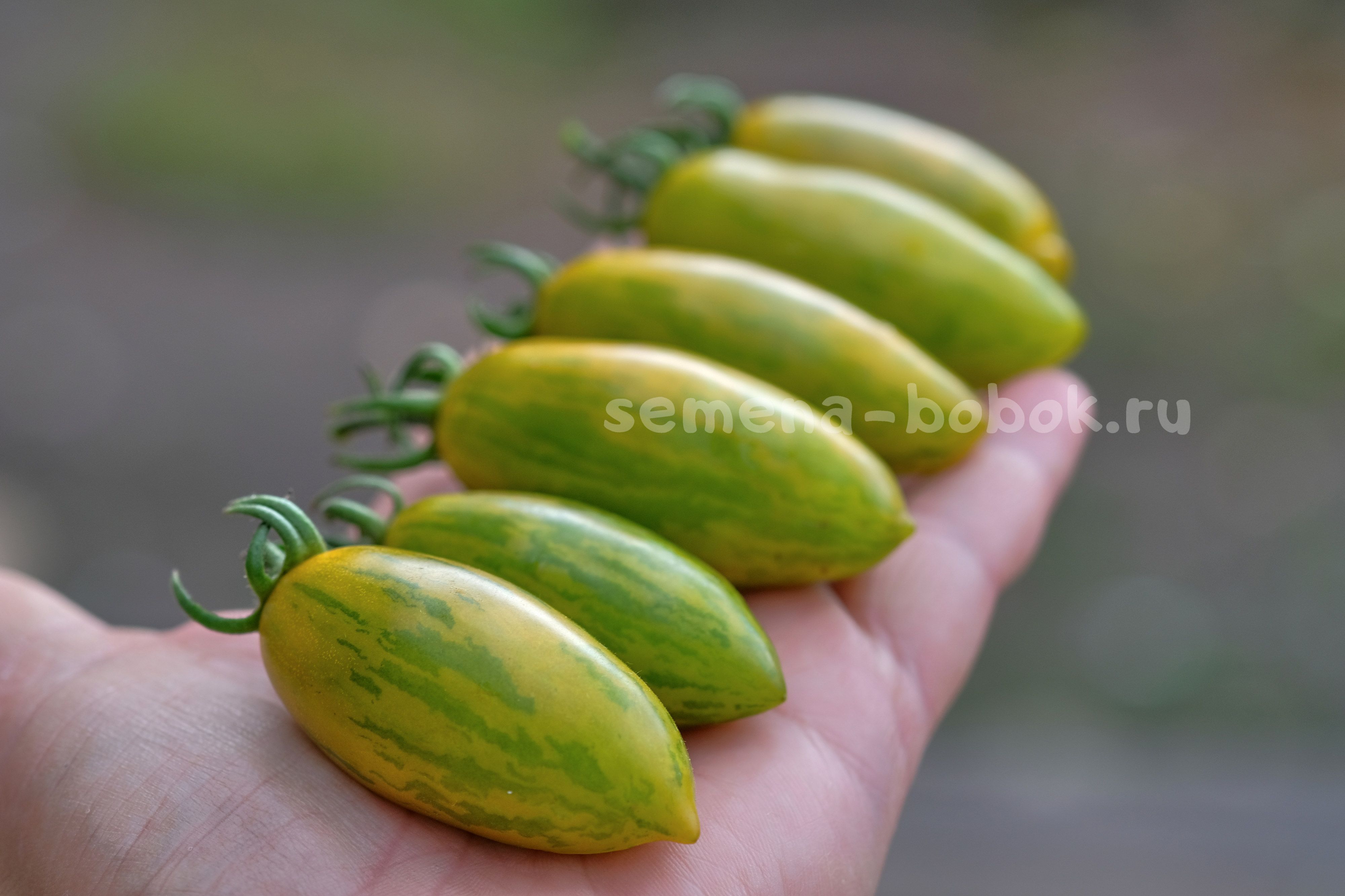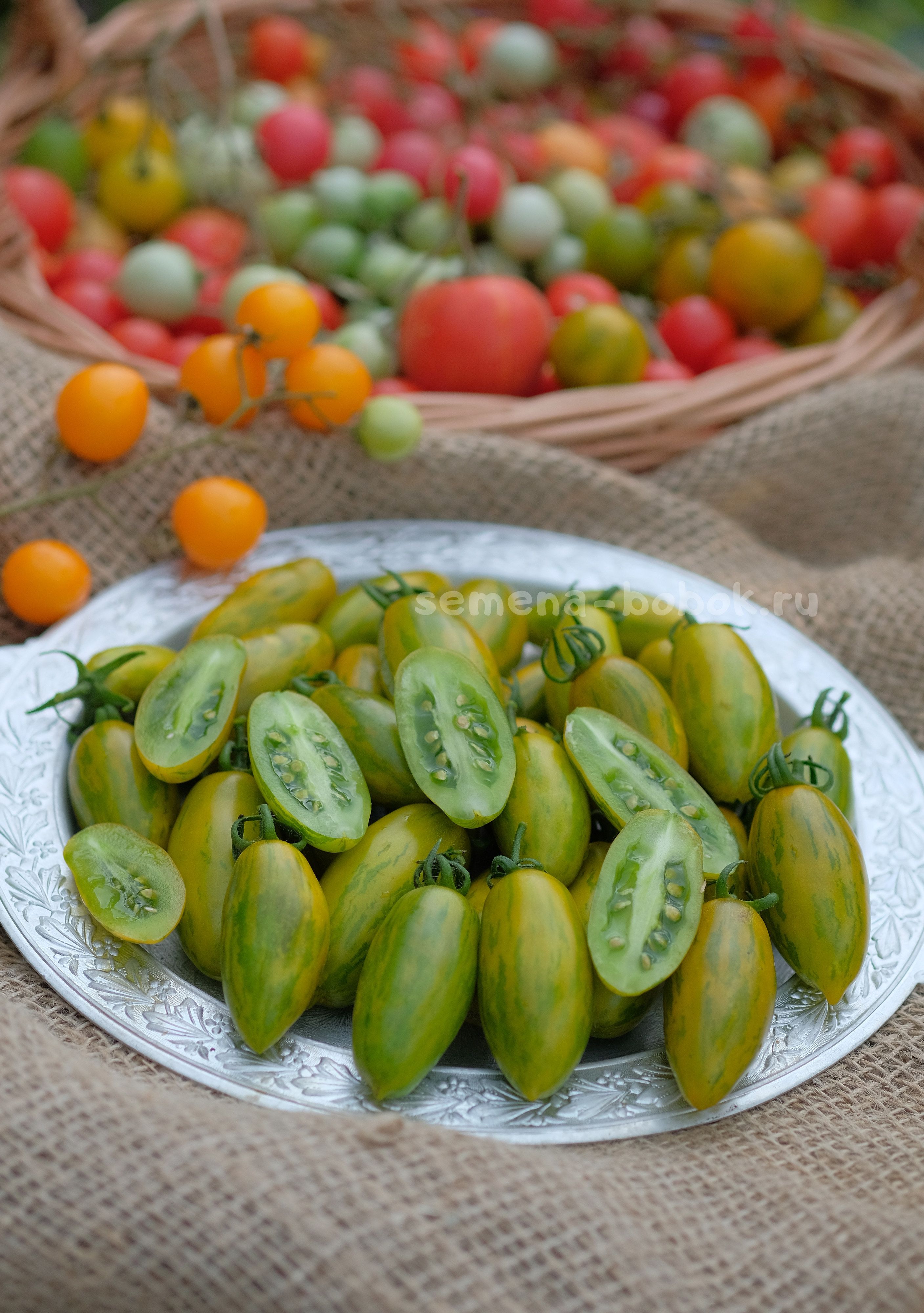 Томаты коктельного типа, удлиненные "колбаски", весом 20-30 г, красивой экзотической расцветки - янтарного цвета с зелеными штрихами и разводами. Мякоть зеленая, желейная, очень сладкая! Вкус нежный, сладкий, с фруктовыми нотками. Очень вкусный сорт! Рекомендую выращивать его в кашпо, литров на 7-10, будет красотища!