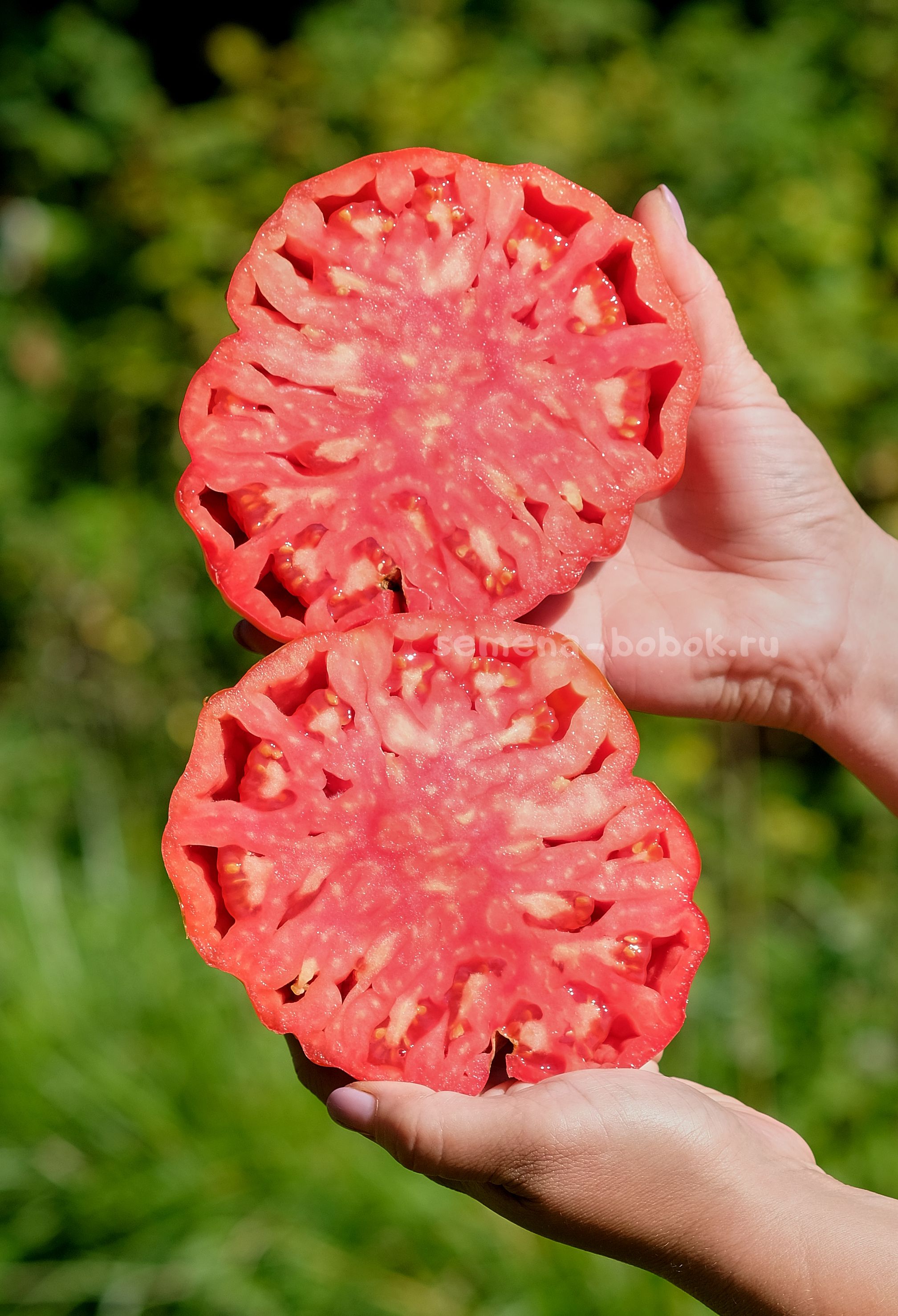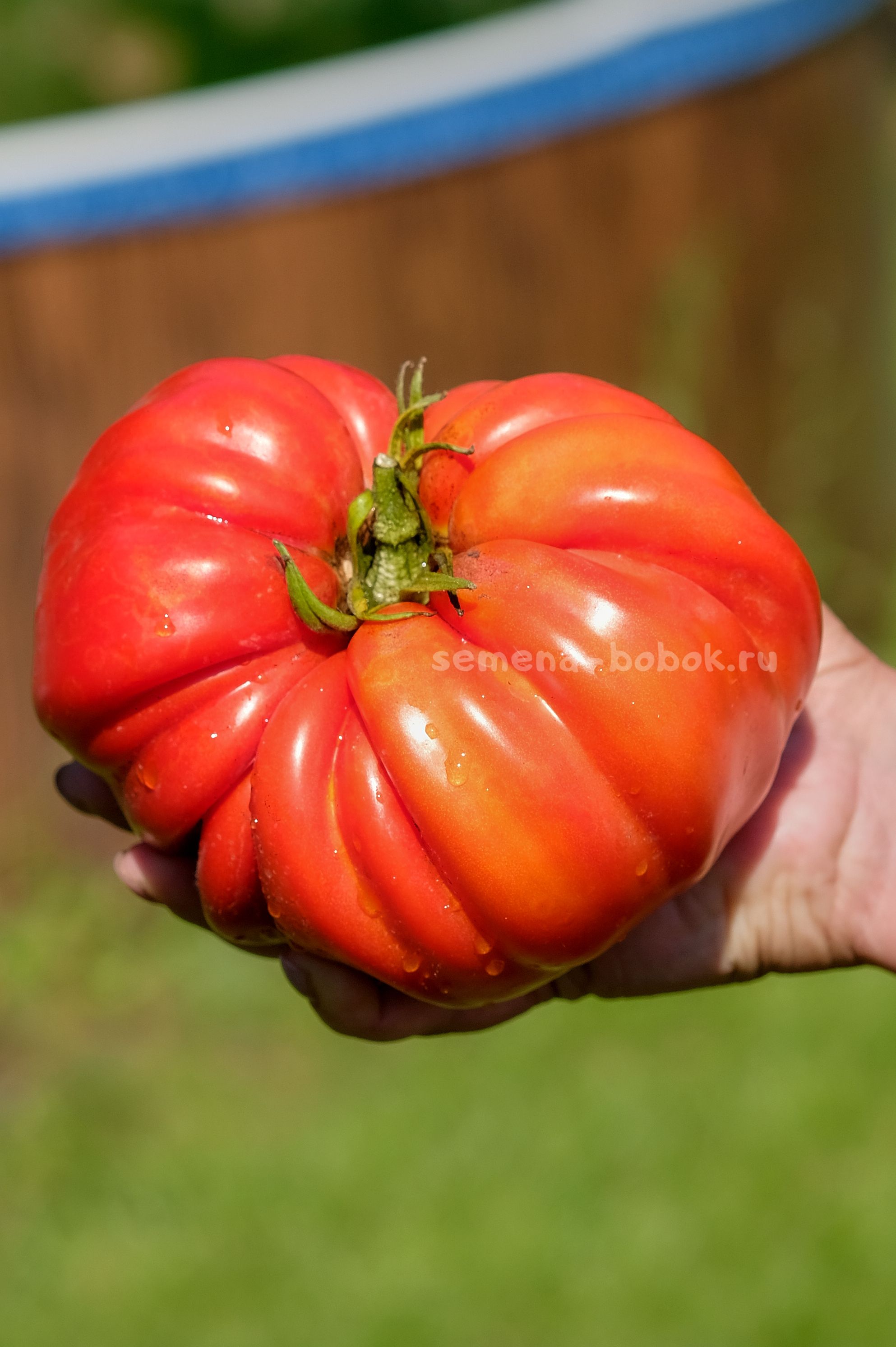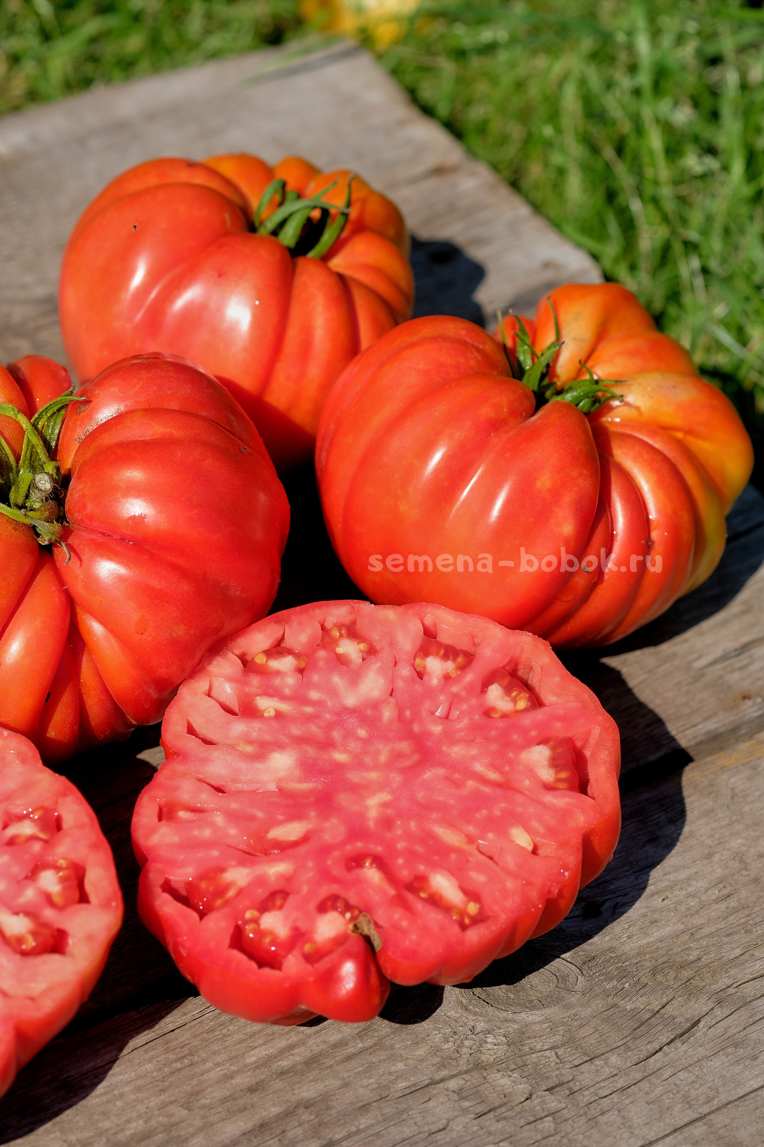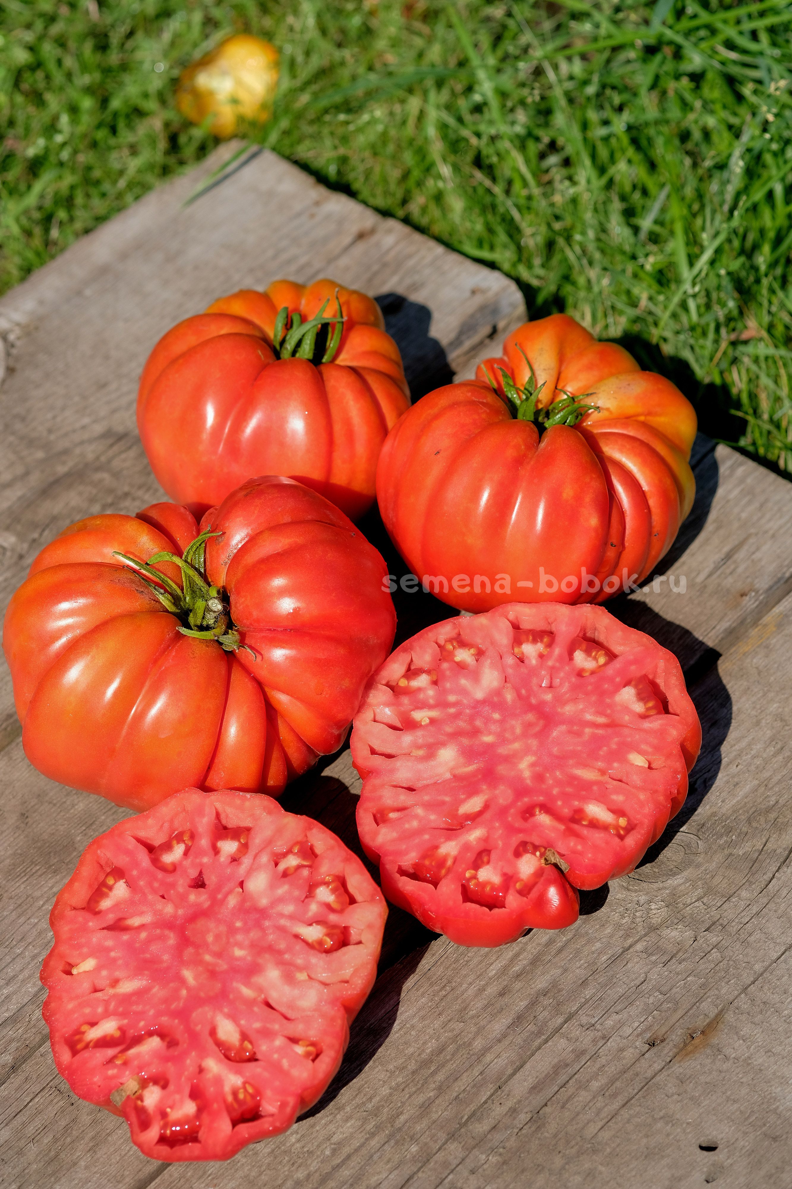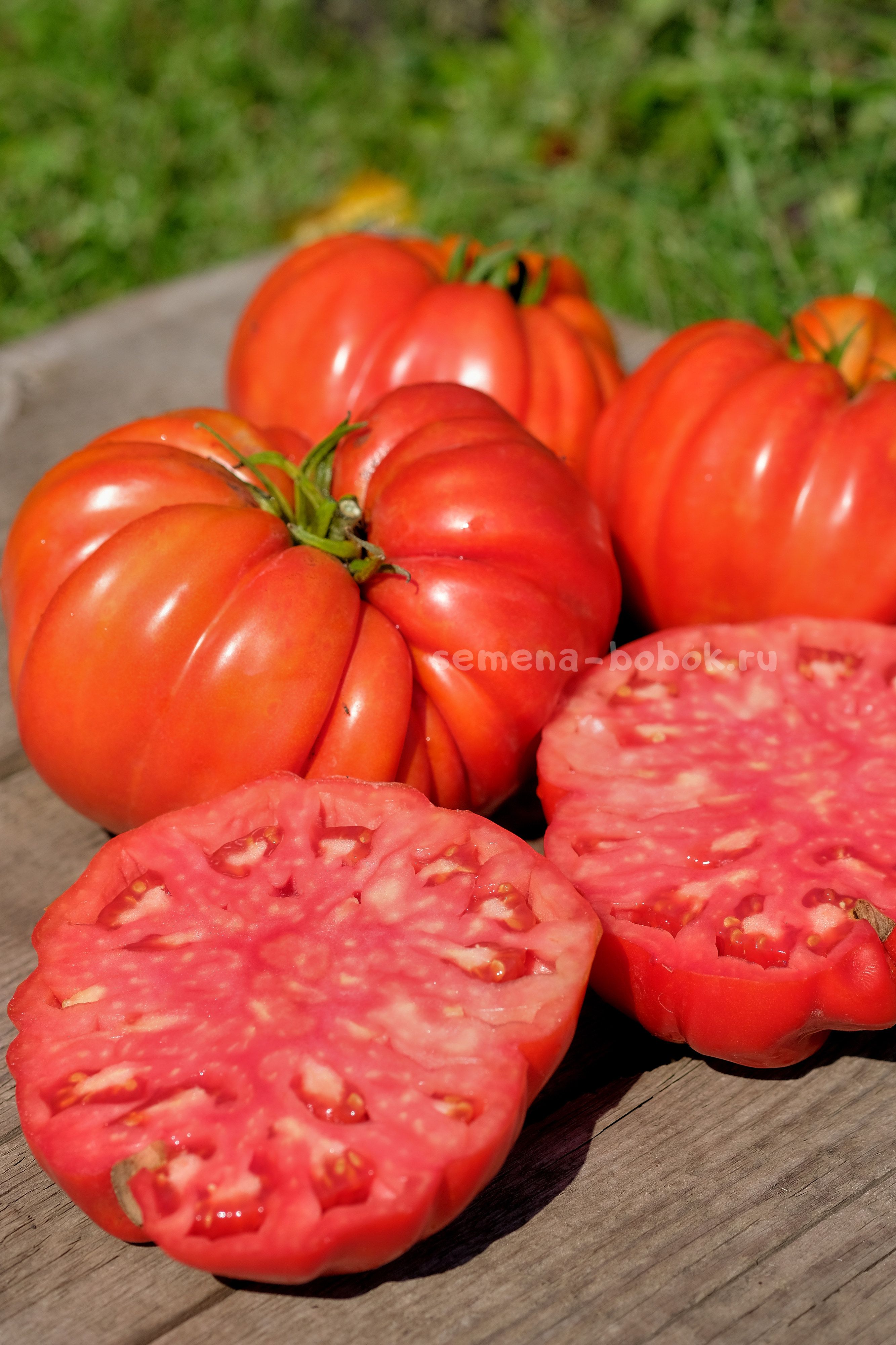 Томаты классического красного цвета, ребристые, с очень пухлыми плечиками. Мякоть также красного цвета, очень плотная, с малым количеством жидкости. Вкус со сладостью и кислинкой. С этих четырех томатов я сварила 2,5 литра вкусного густого кетчупа. Если хотите крупные плоды и много - рекомендую вести его в один ствол, в два ствола следующие кисти тормозят, так как томат очень крупный и созревает не быстро.