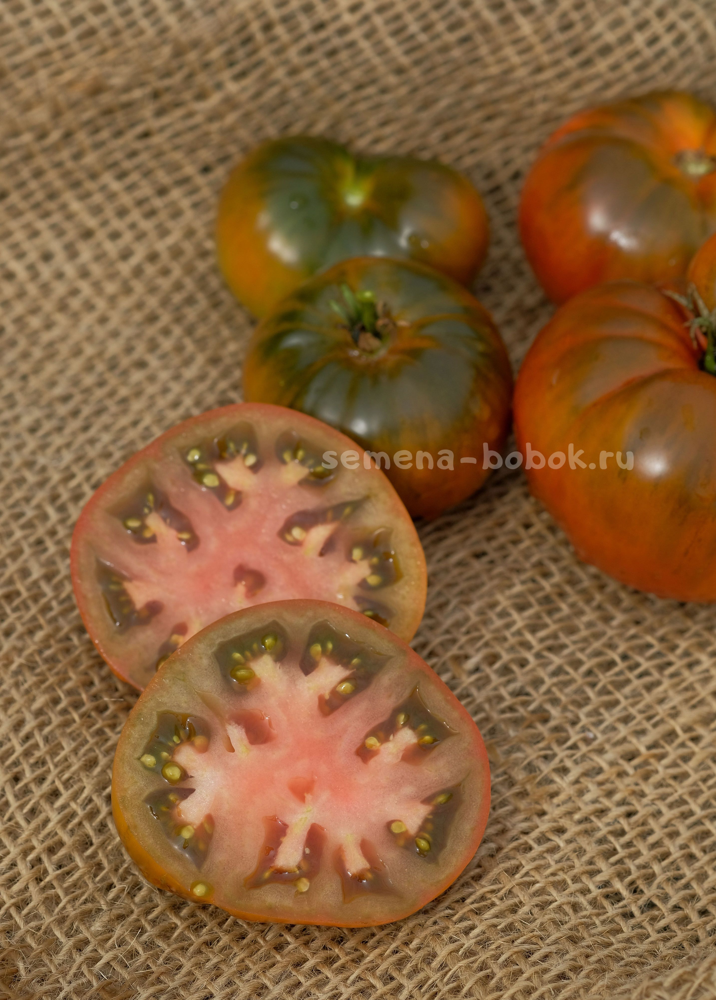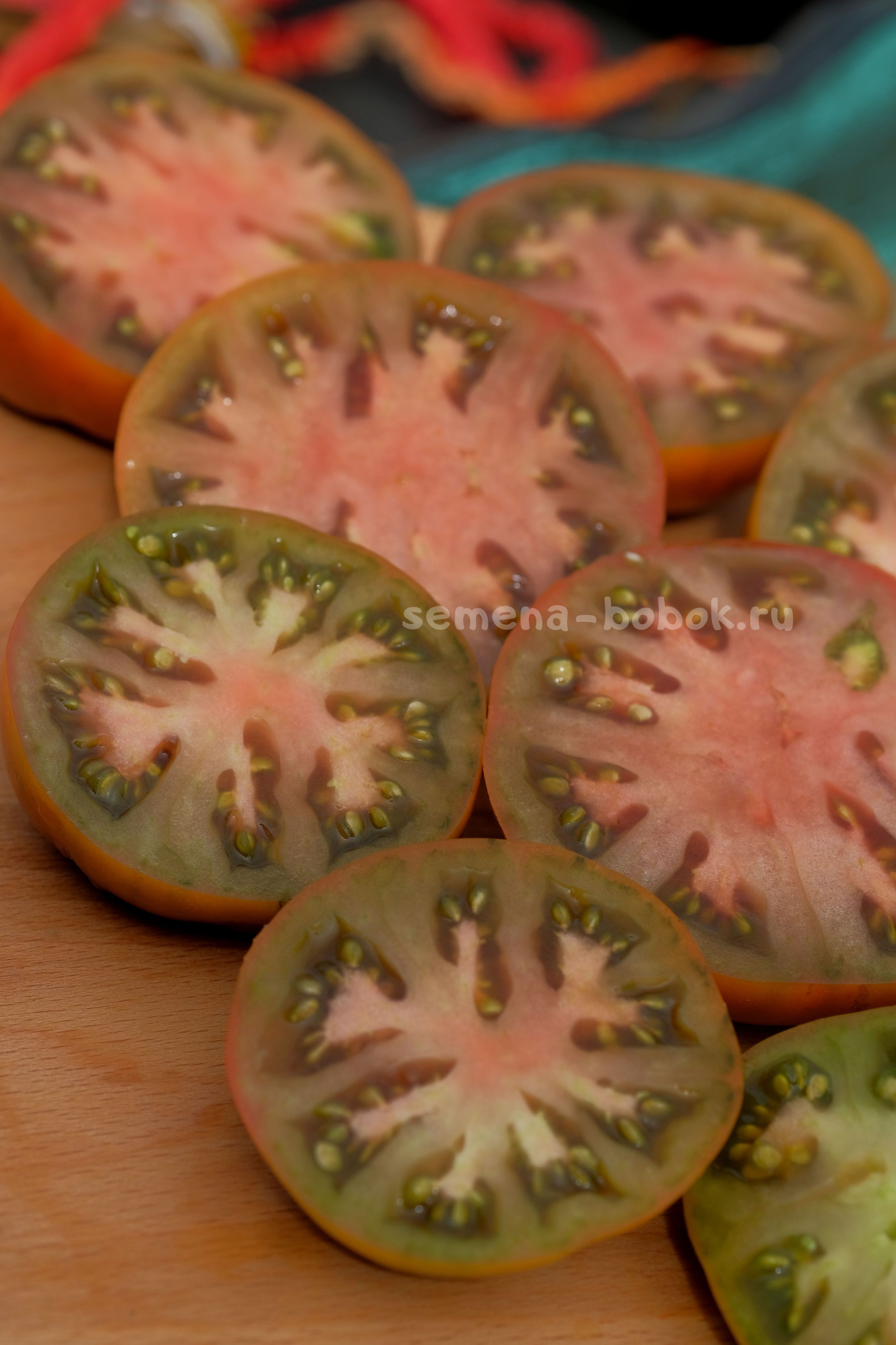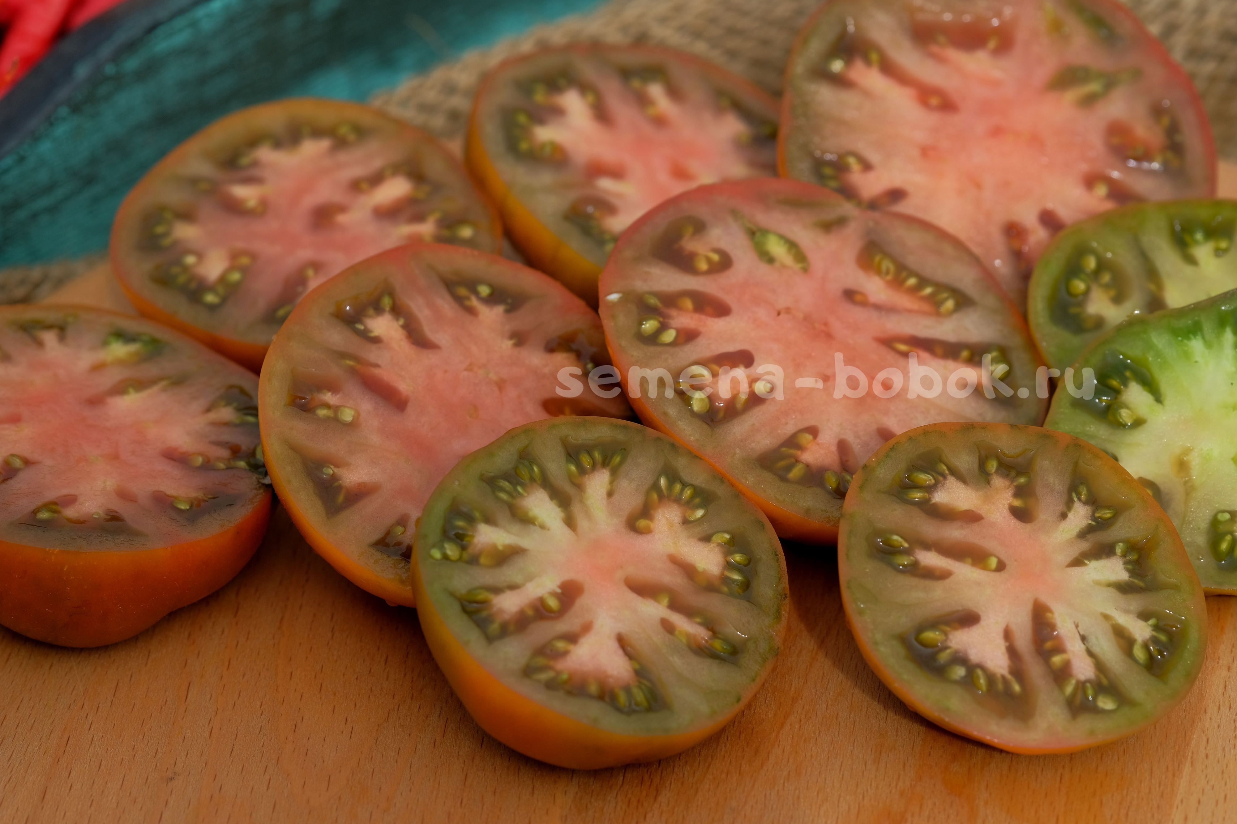 Томаты плоскоокруглые, с пышными плечиками, шоколадного цвета с зелеными полосками на плечиках, которые по мере поспевания становятся менее заметными. Внутри мякоть малинового цвета, семена в темно-зеленом геле. Мякоть плотная, томаты при небольших размерах довольно увесистые. Вес плодов 100-200 г. Вкус сладкий, с кислинкой, салатный.