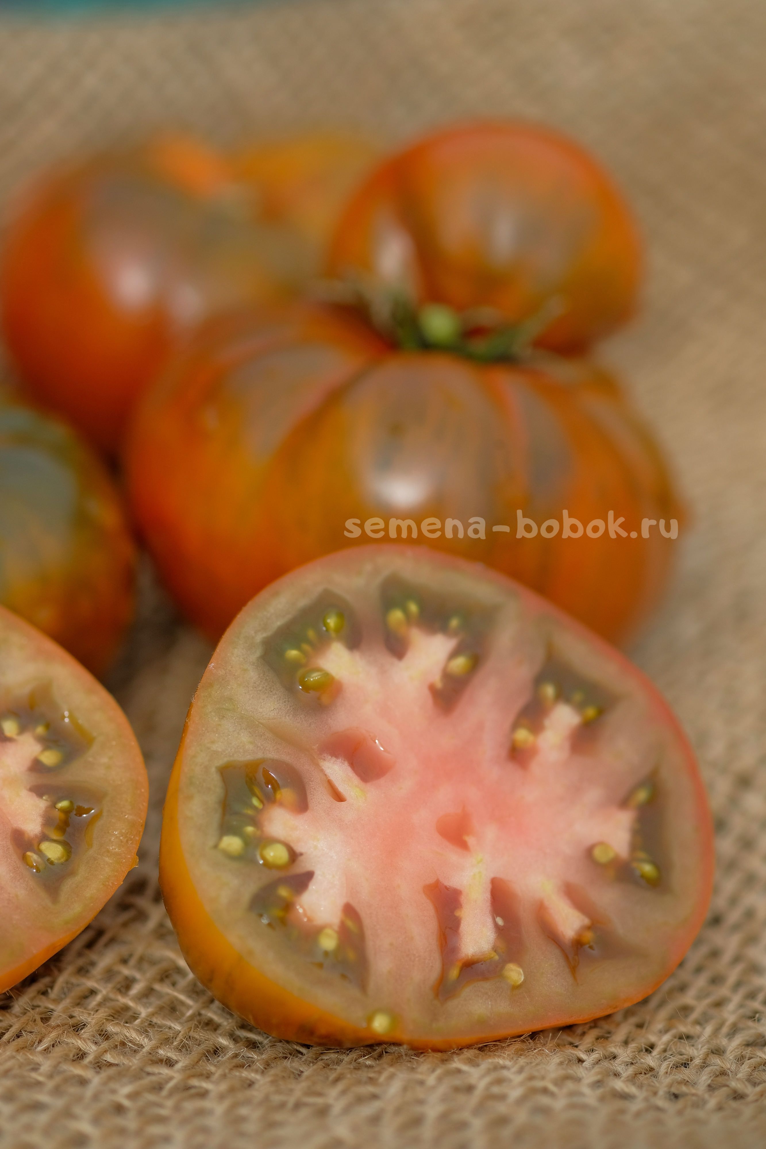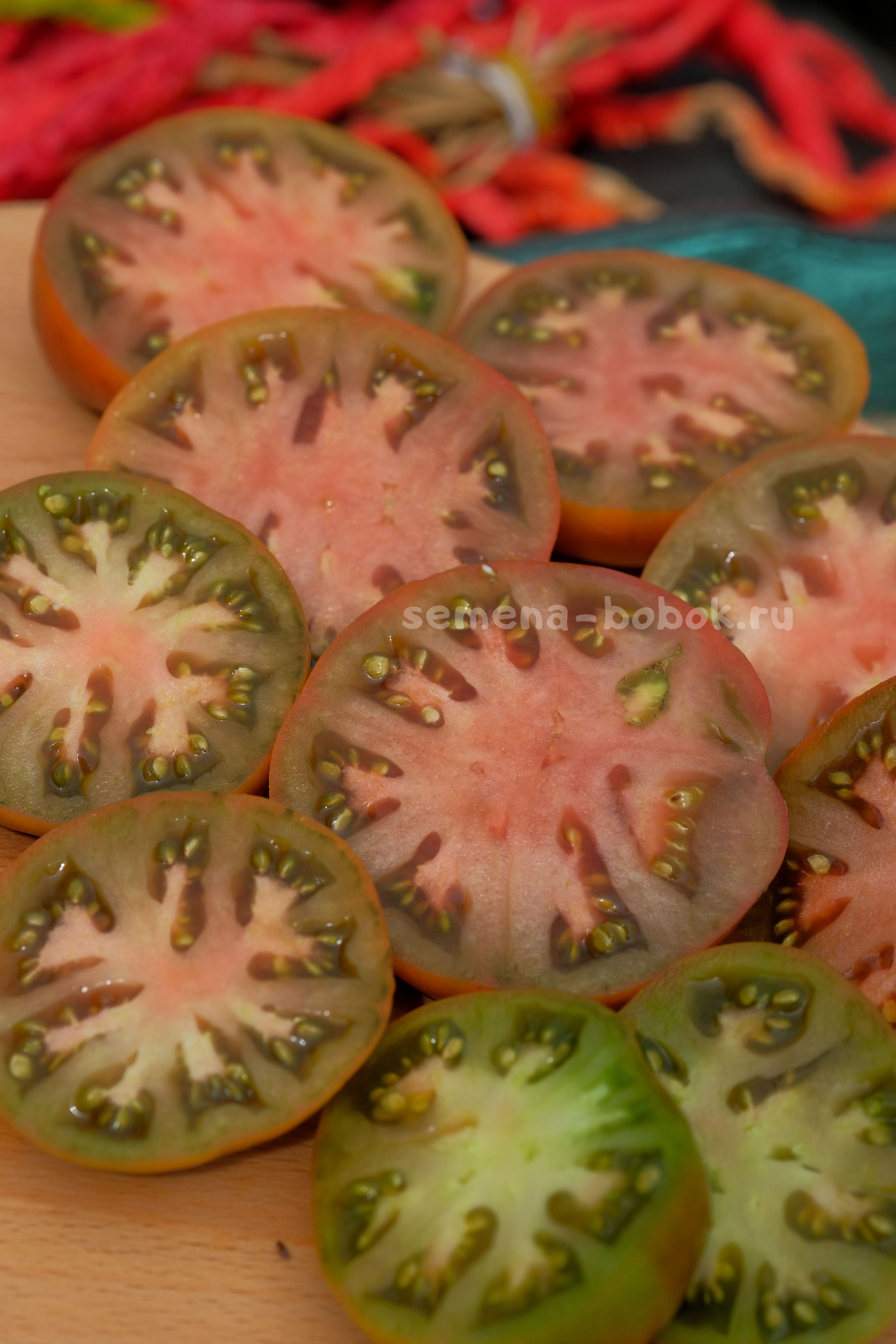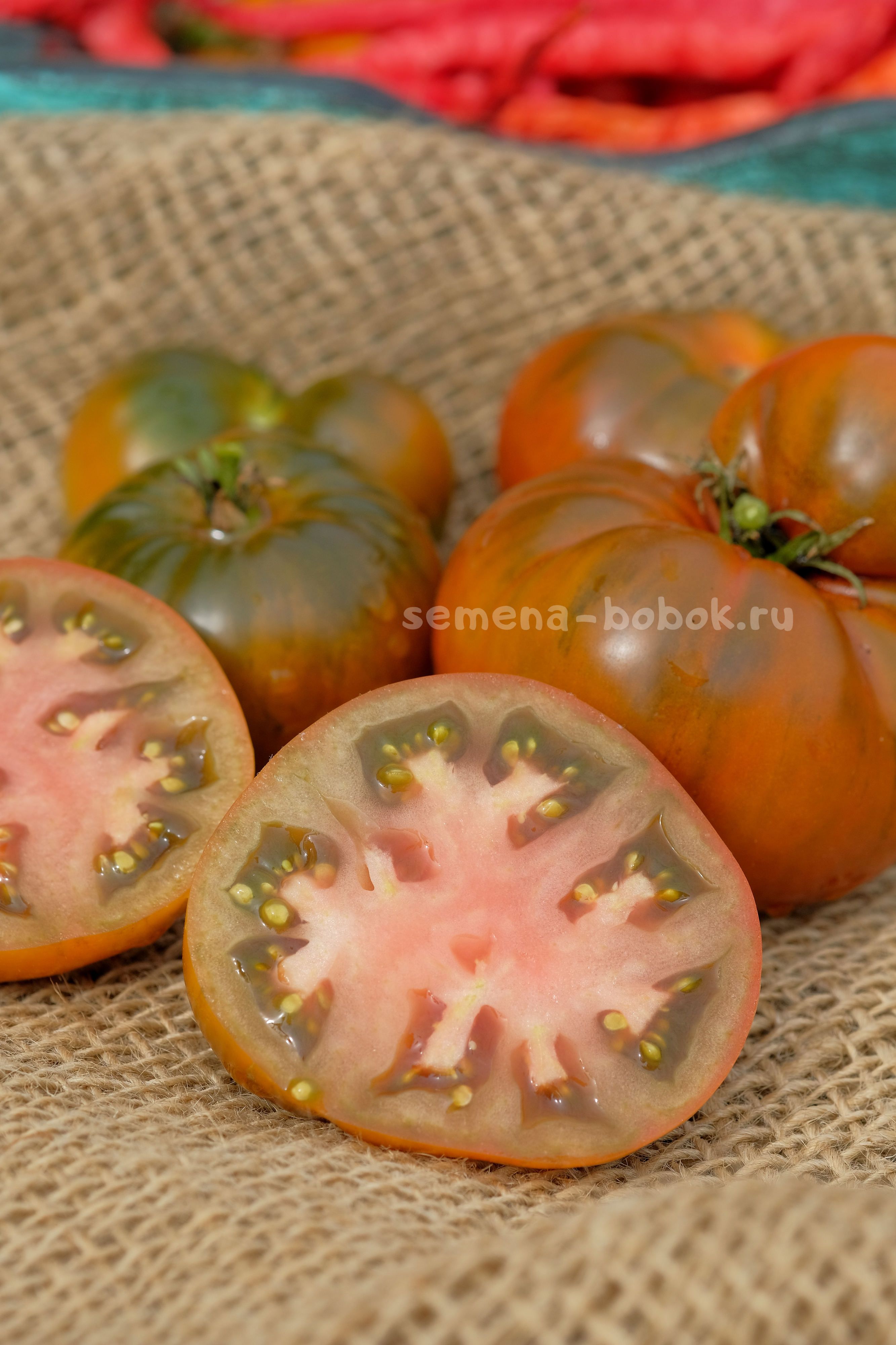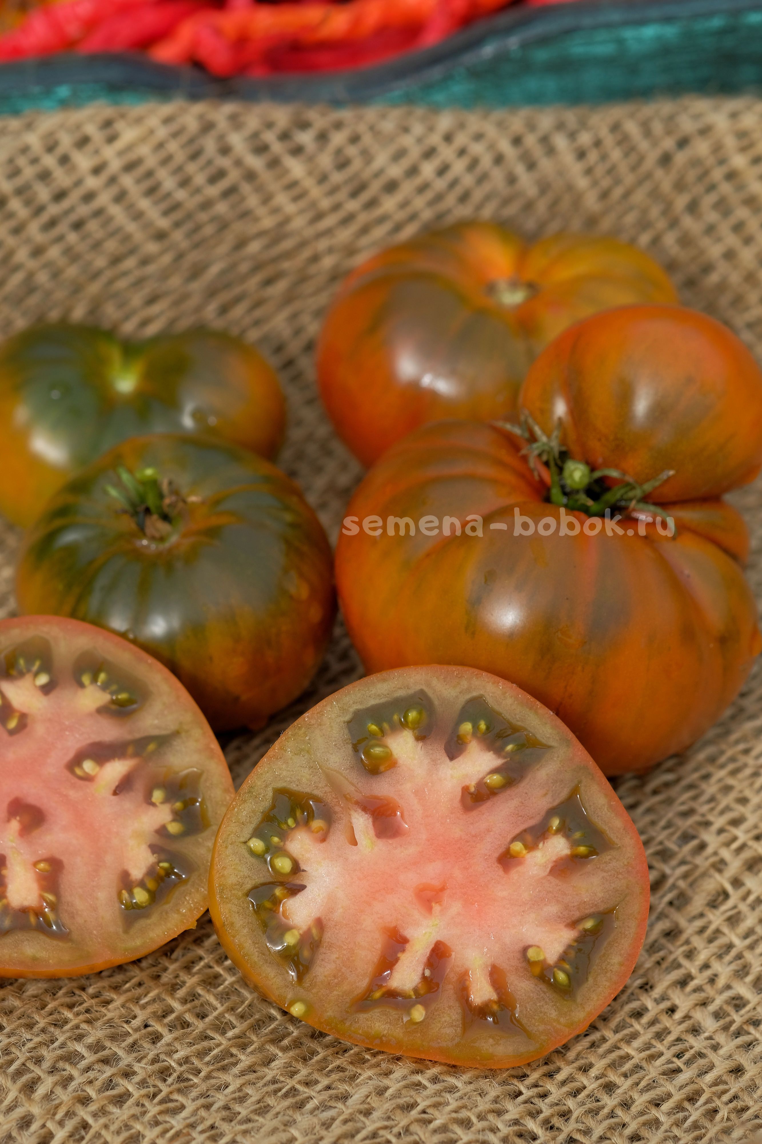 Томаты плоскоокруглые, с пышными плечиками, шоколадного цвета с зелеными полосками на плечиках, которые по мере поспевания становятся менее заметными. Внутри мякоть малинового цвета, семена в темно-зеленом геле. Мякоть плотная, томаты при небольших размерах довольно увесистые. Вес плодов 100-200 г. Вкус сладкий, с кислинкой, салатный.