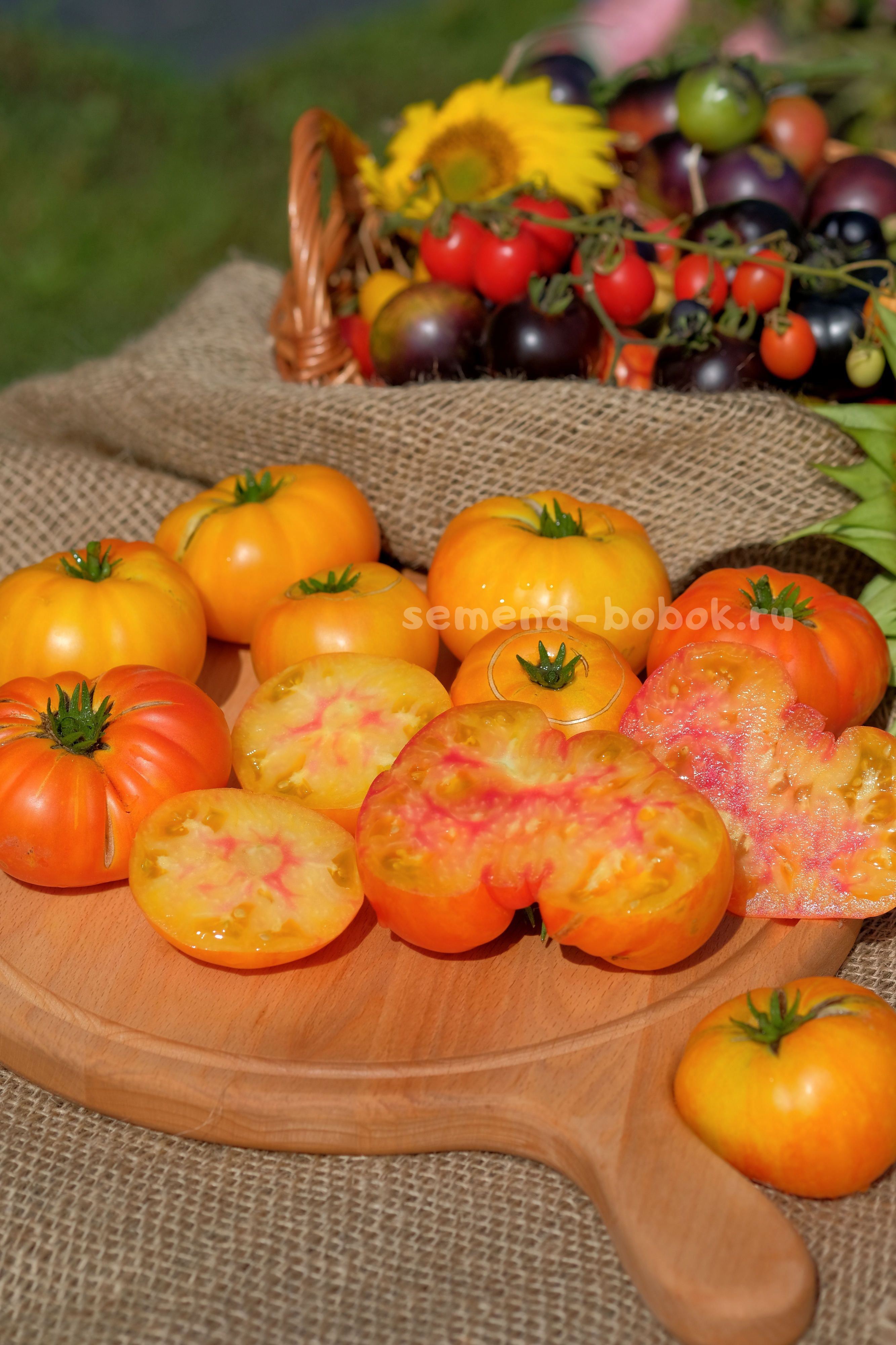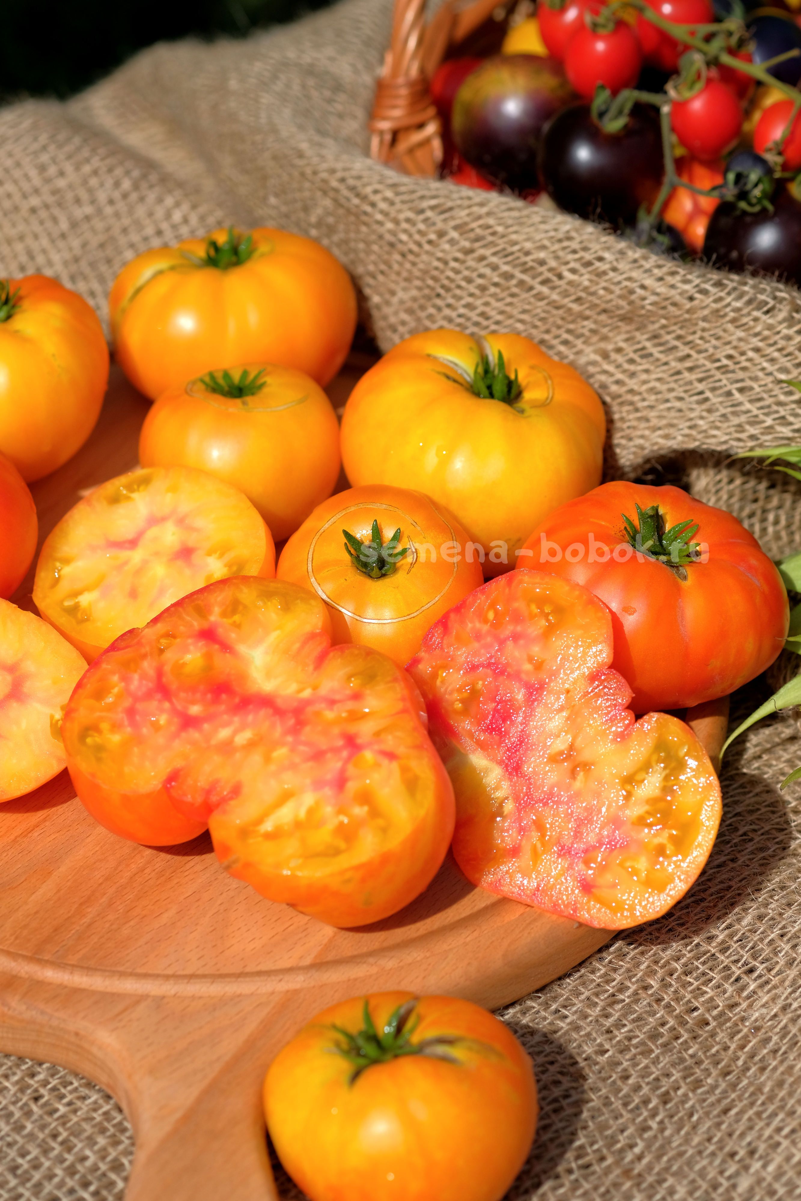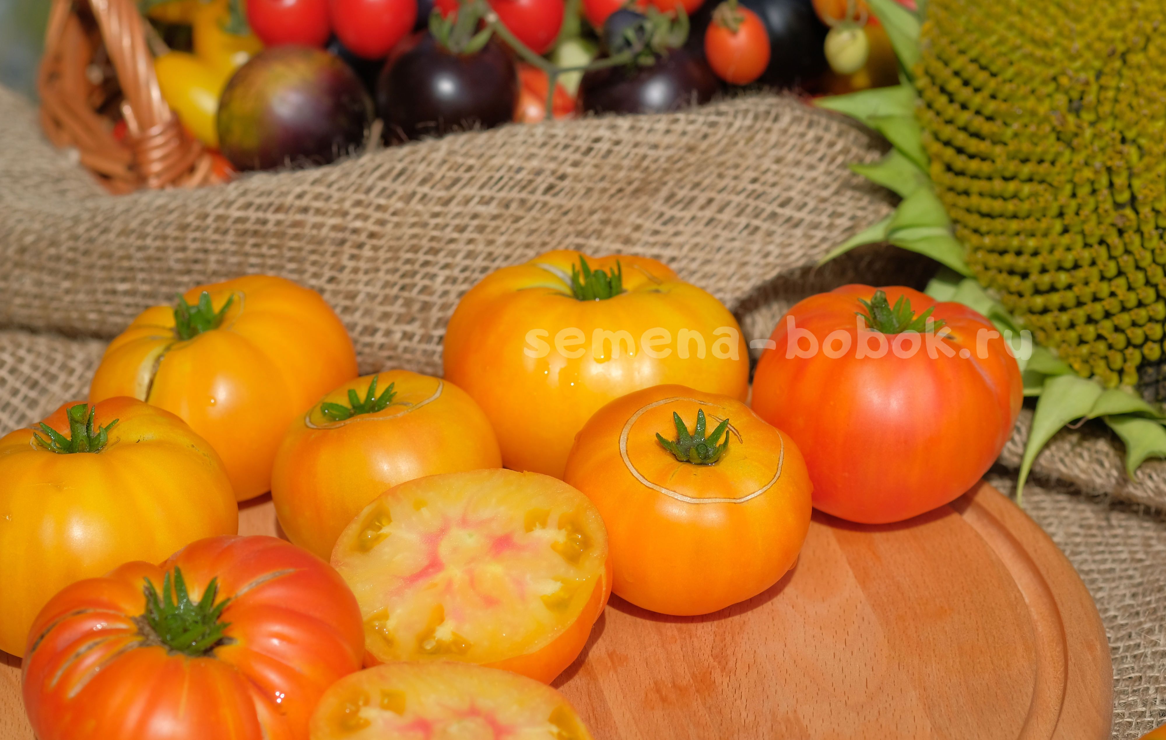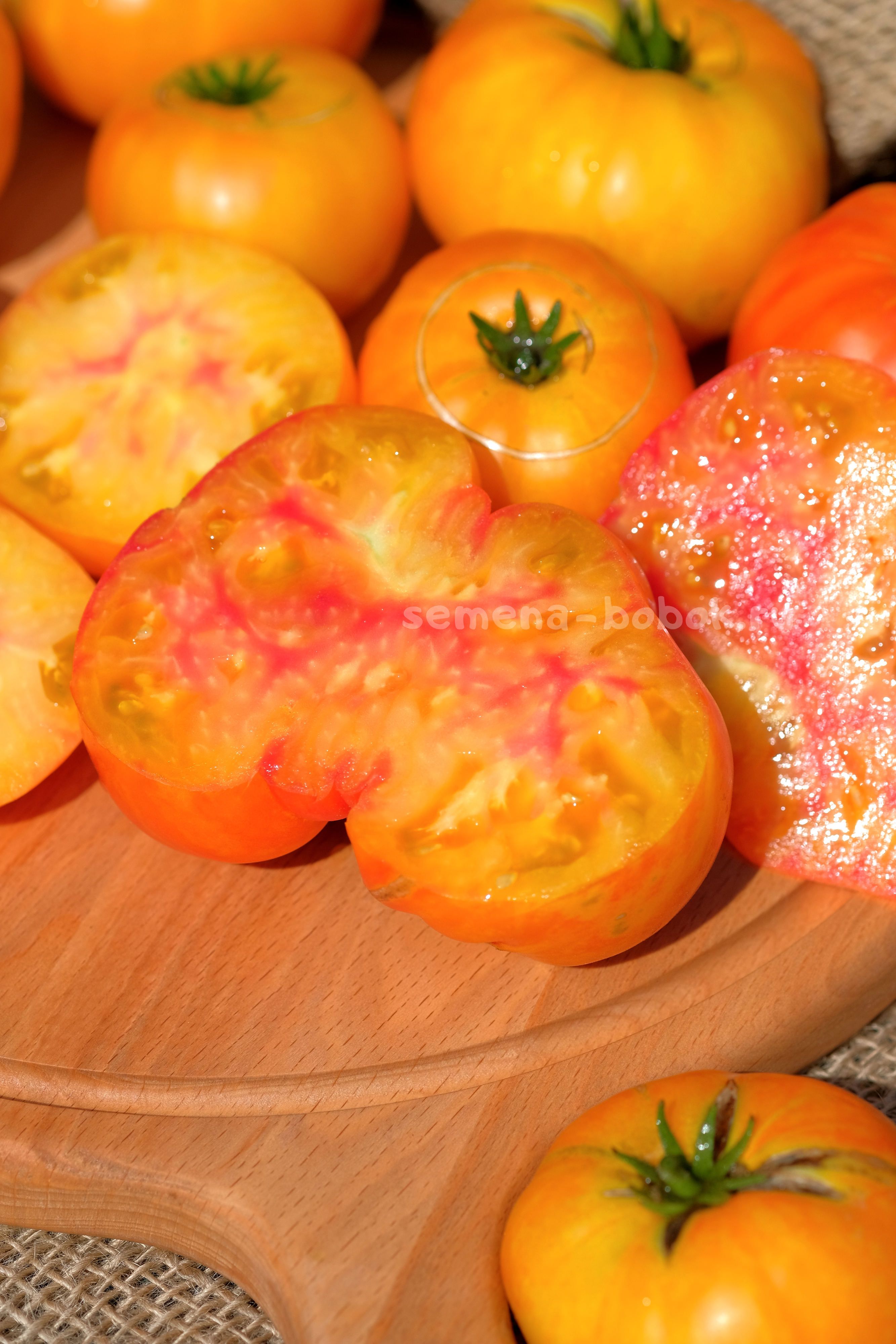 Очень урожайный гном. Куст высотой 90 см в открыом грунте, навязал приличне количество вот таких биколорных плюшек весом 150-300 г. Лист регулярный, плотный, крупный. Томаты - плоскоокруглые биколоры, желтые с оранжевым румянцем на попках снаружи, желтые с розовыми всполохами внутри.