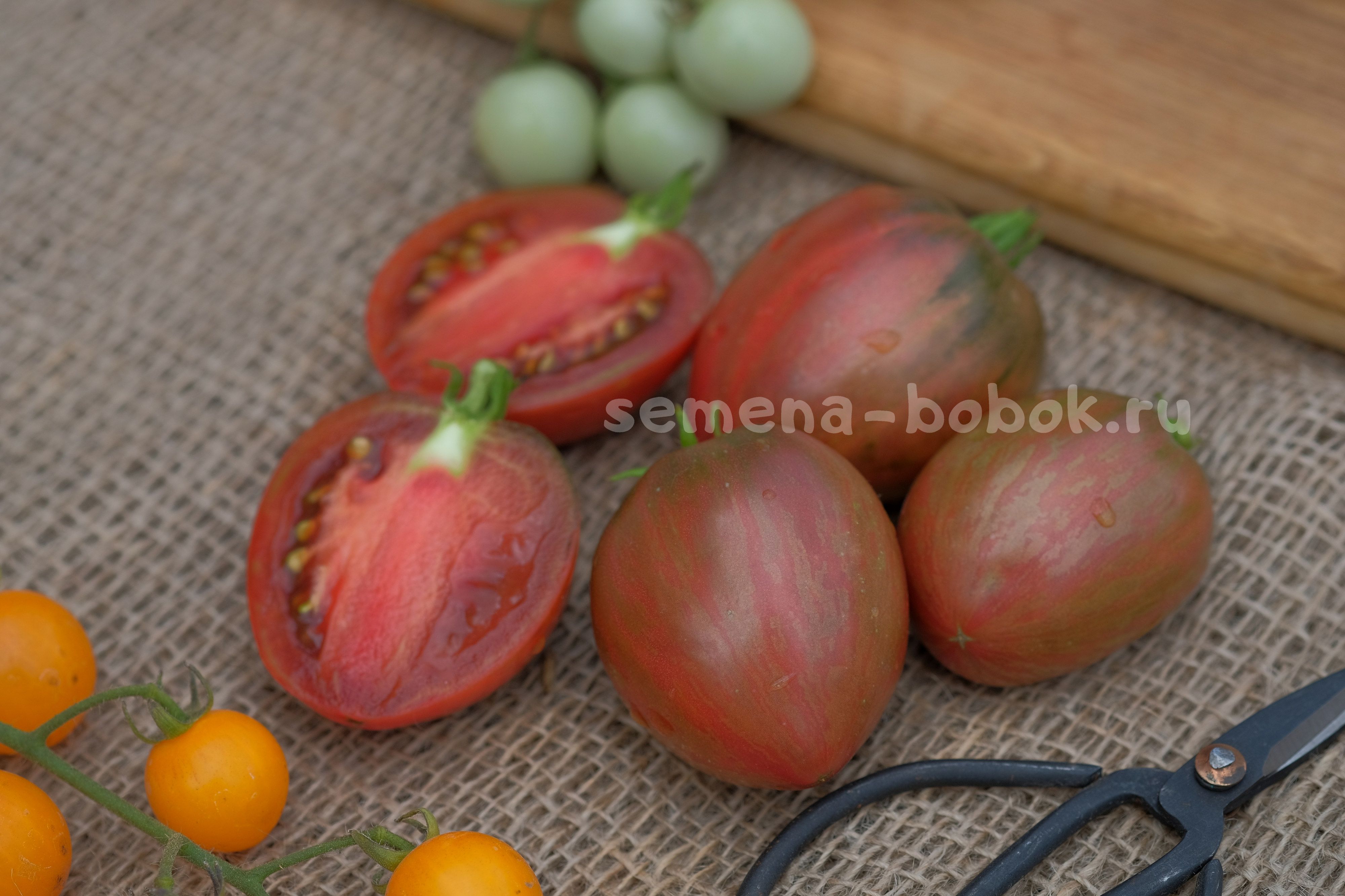 Томаты все одинаковые, одномерные, аккуратные сердца по 100-120 г. Очень необычная расцветка - кирпично-красные плоды, на которых зеленые и перламутровые разводы.