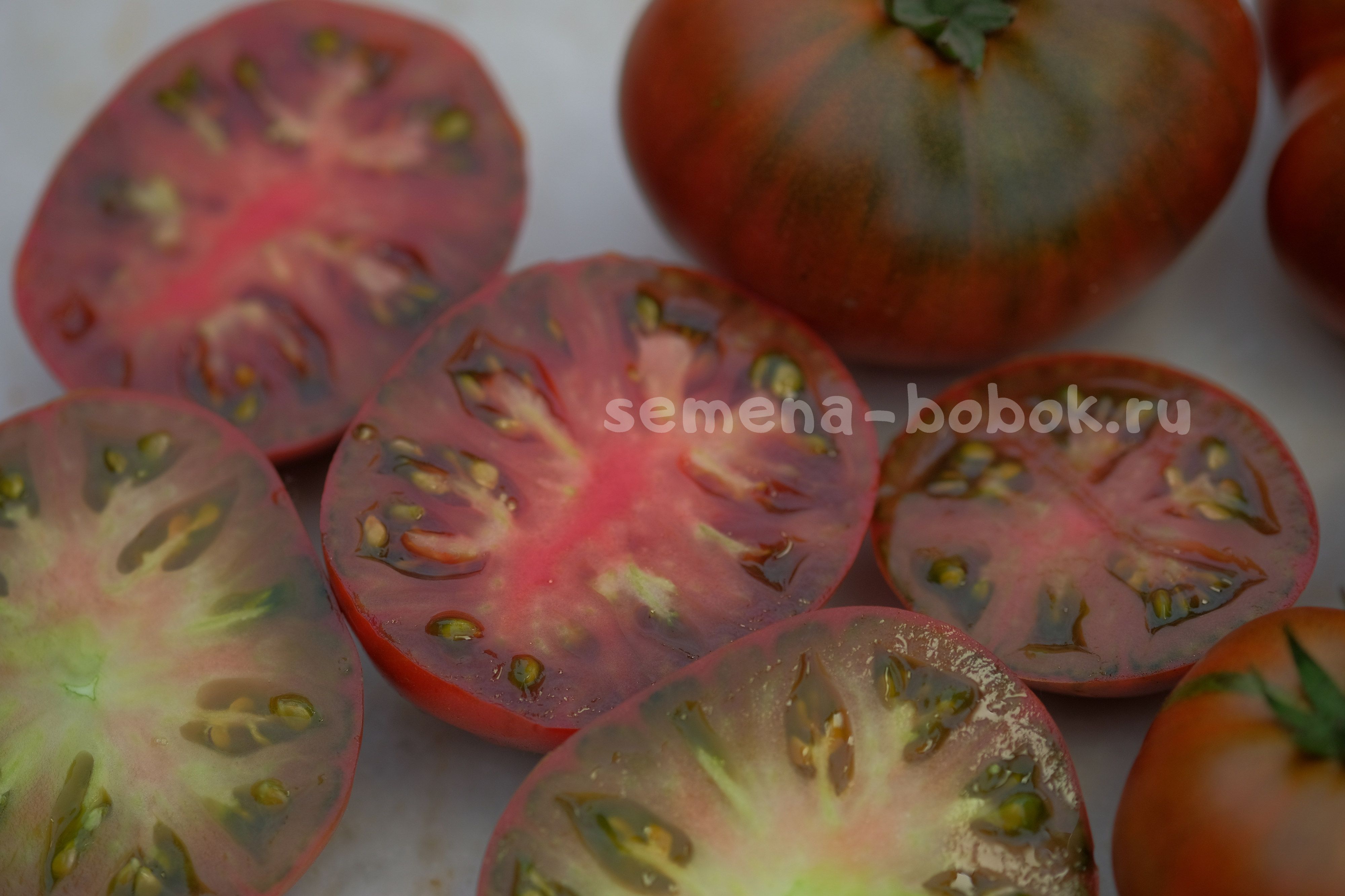 Томаты - плоскоокруглые бифы, коричнево-красного цвета с зеленым напылением на плечиках, в полной спелости зелень практически уходит. На разрезе яркие, бордово-красные с зеленым гелем в семянных камерах. У меня плоды не были крупными, 100-180 г.