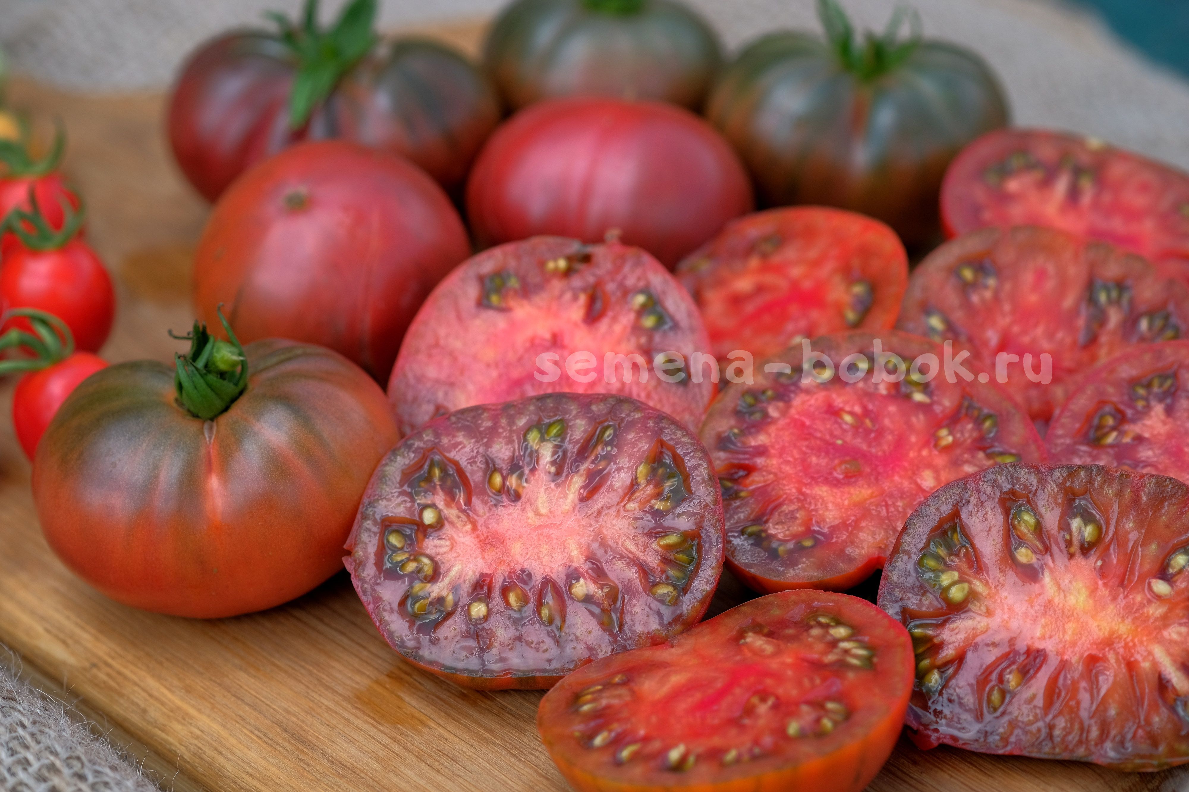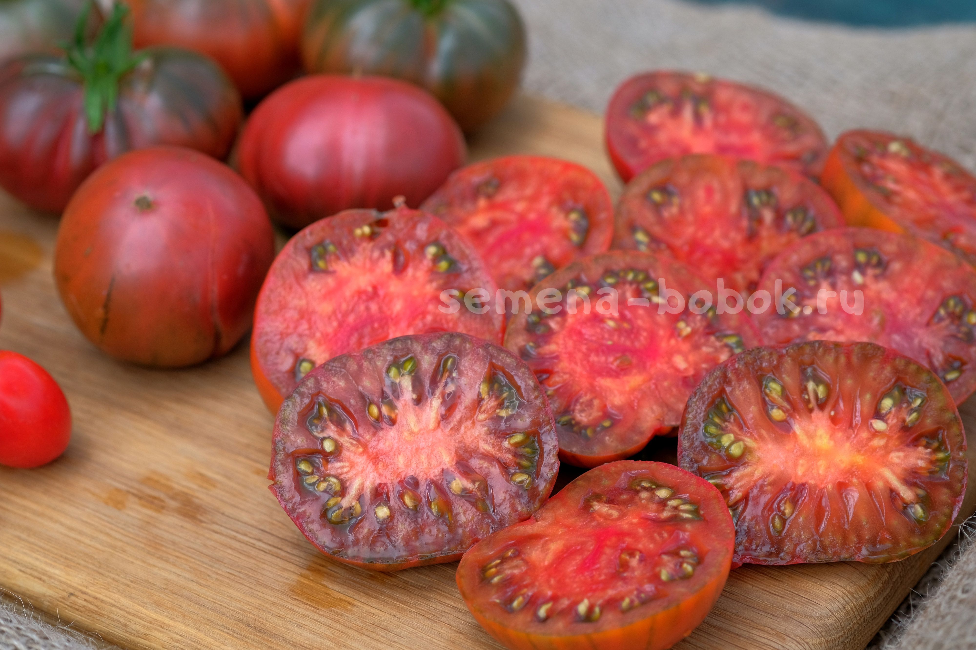 На разрезе мякоть малинового цвета, плотная, маслянистая и очень ароматная. Семена в зеленом геле. Это потрясающе вкусный томат! Вкус яркий, взрывной, сладкий, с едва заметной кислинкой в послевкусии. Супер-вкус!