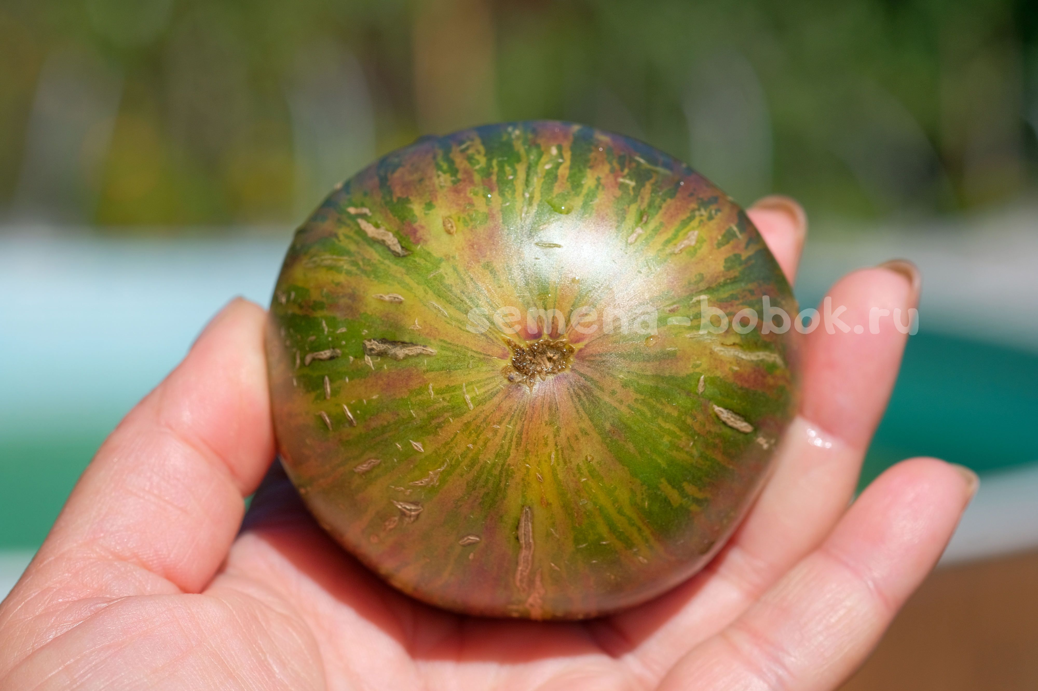 Плоды плоскоокруглые, по 200-300 г, очень экзотической расцветки - зеленого цвета, с оранжевыми и антоциановыми полосками разных оттенков. Внутри зеленые, с кремовой серединкой.