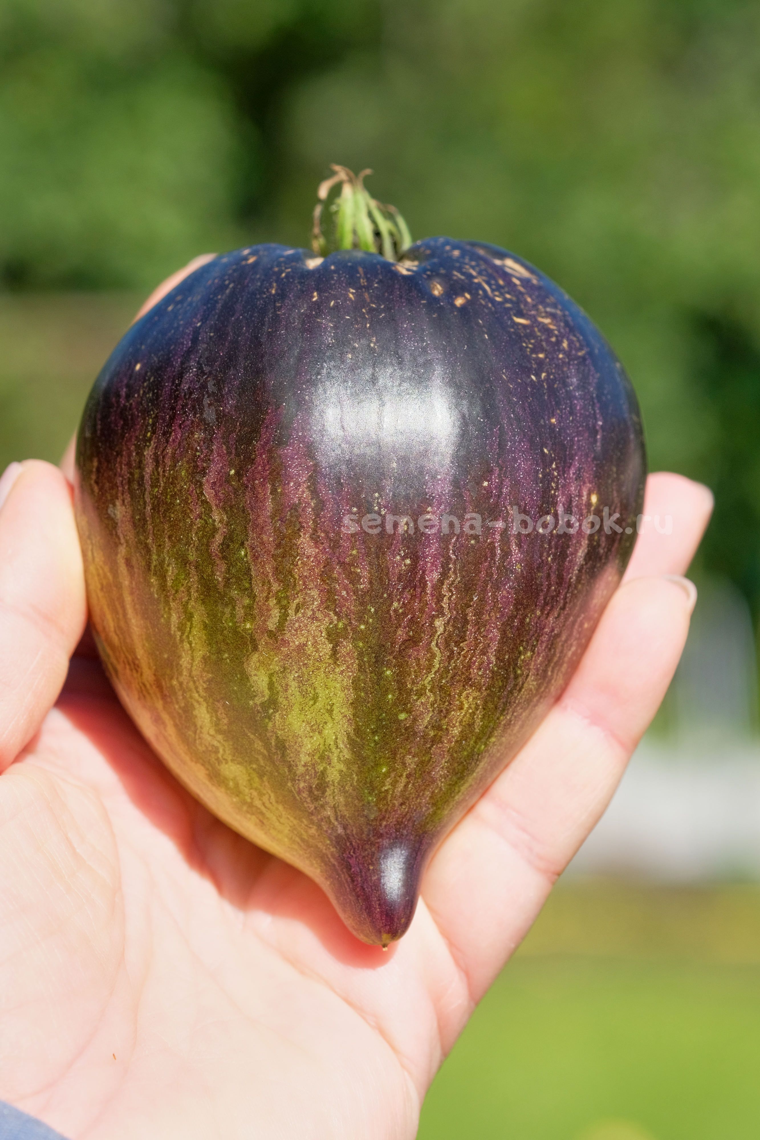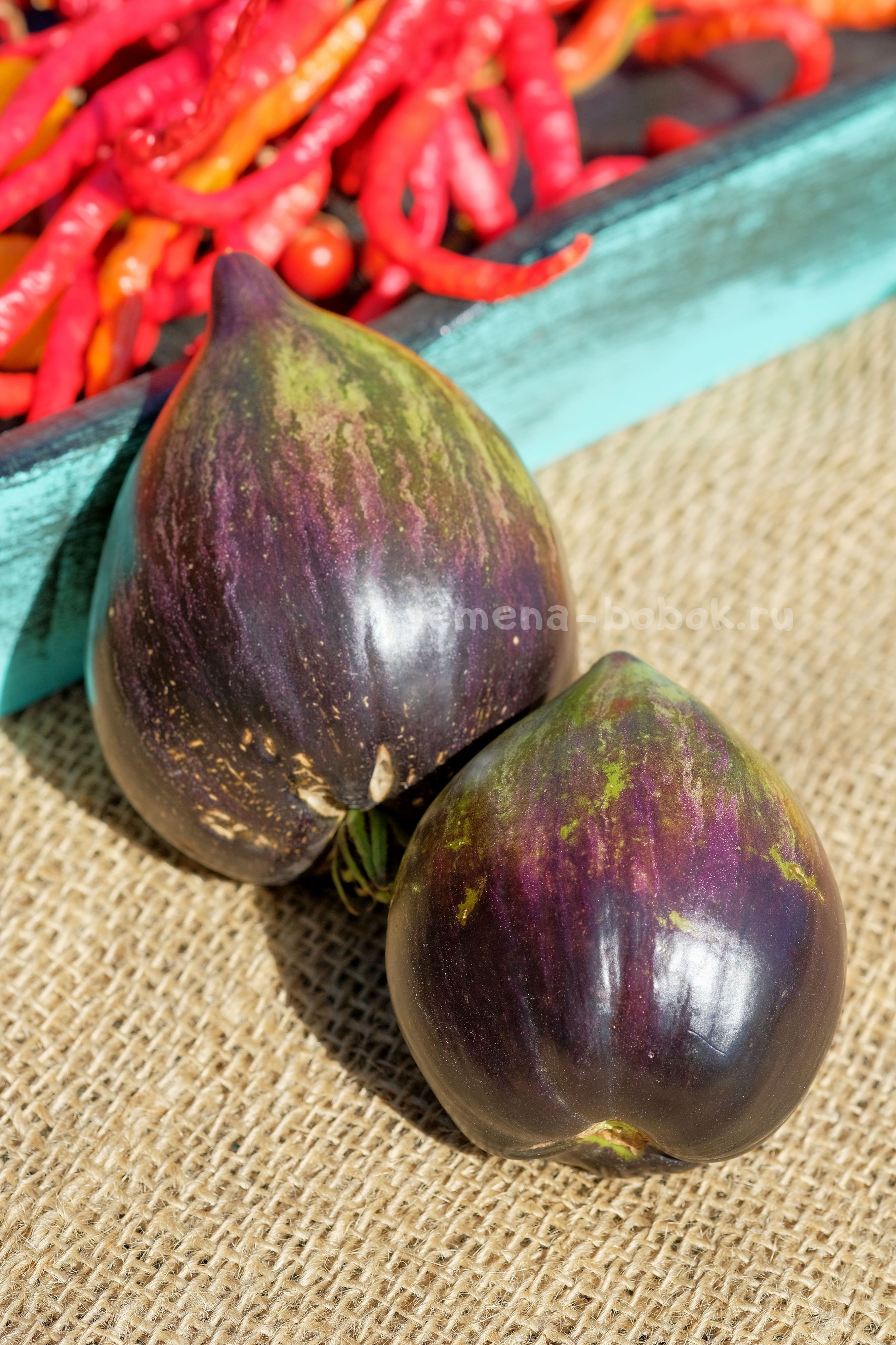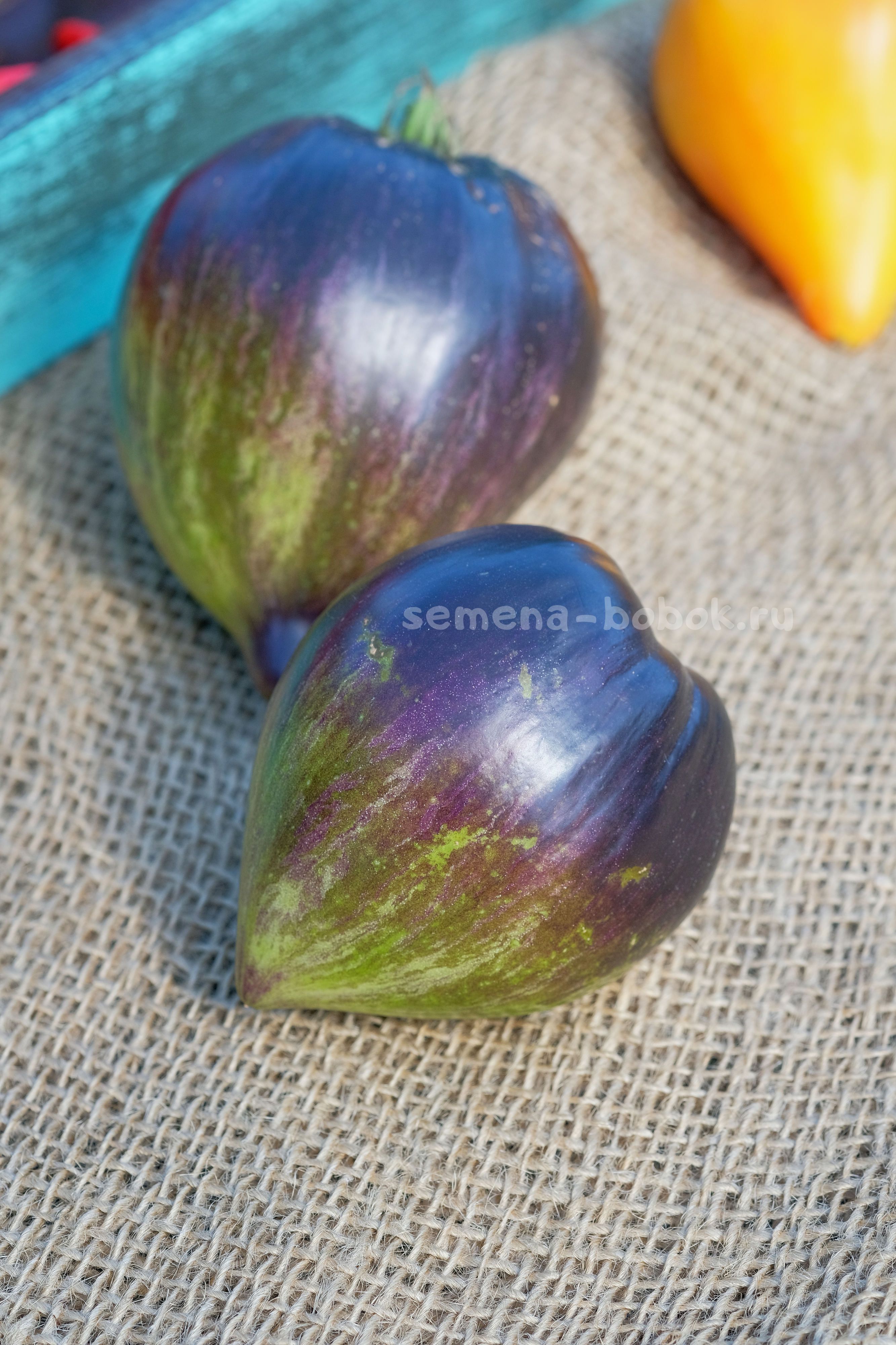 Очень красивые плоды в форме сердца с вытянутым носиком. Окрас изумрудный, с большим количеством антоциана, с фиолетовыми и зелеными разводами.
