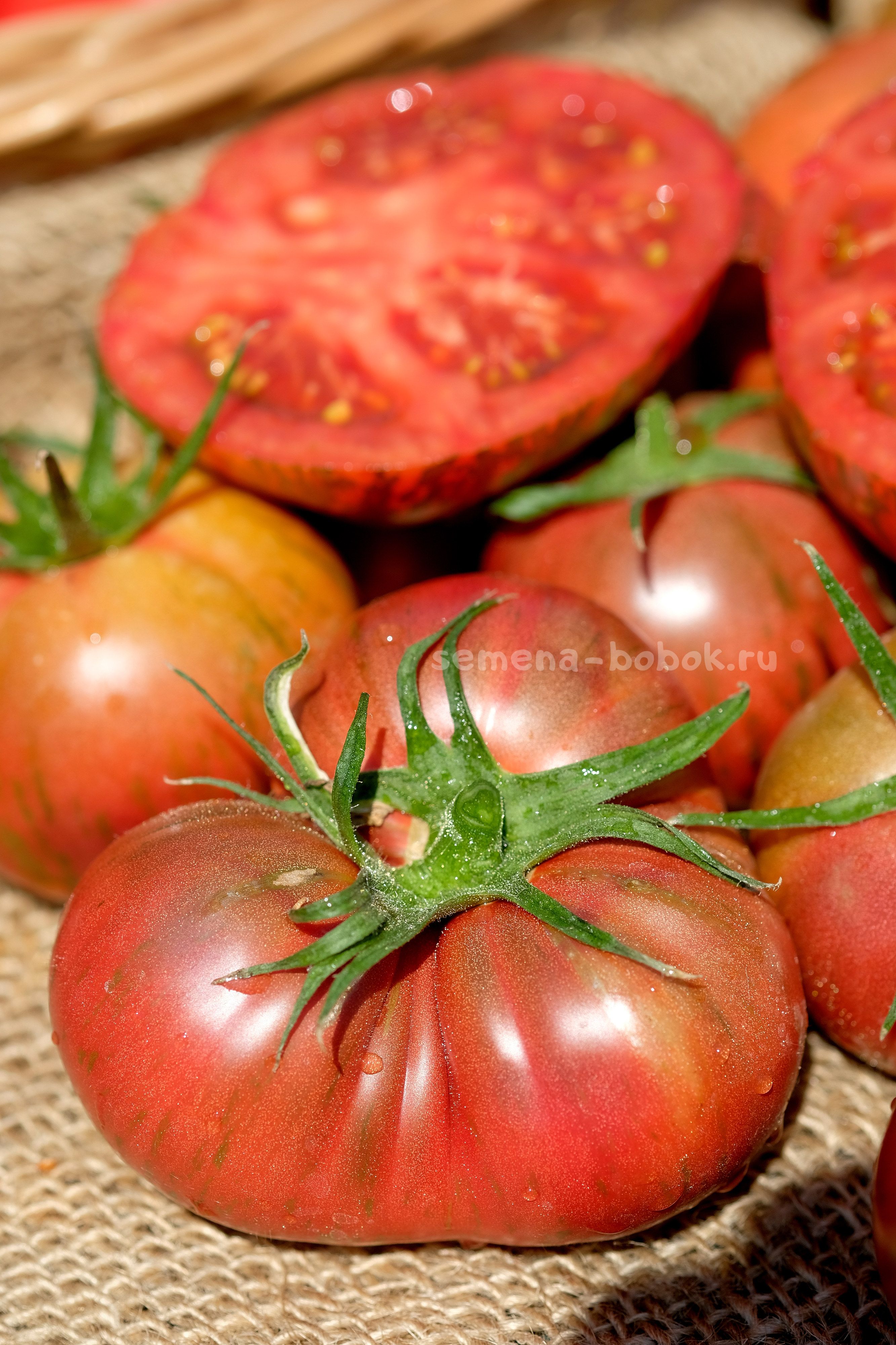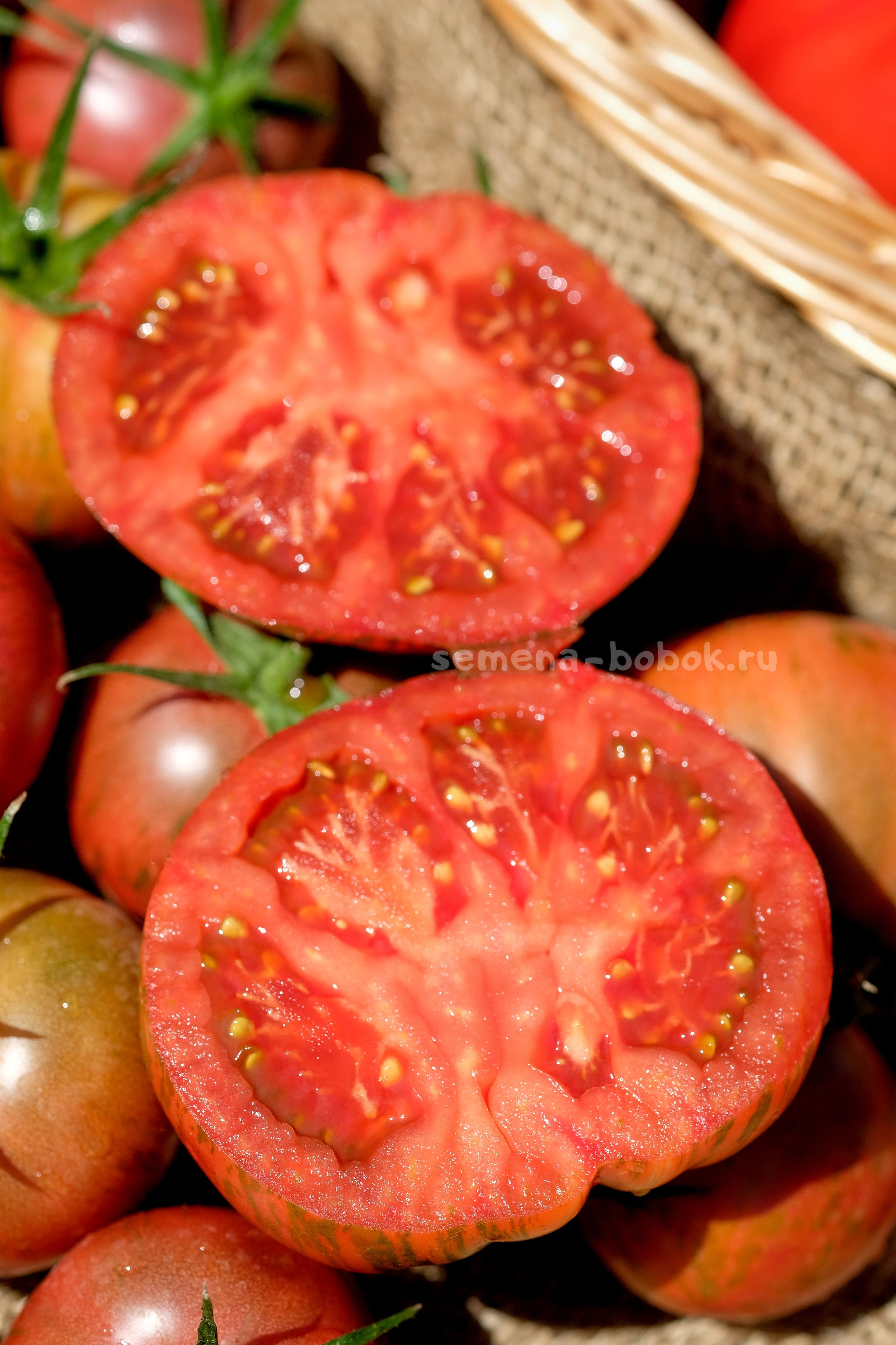 Куст индетерминантный, но не очень высокий, до 1.5 м в теплице. Плоды красно-кирпичного цвета с зелеными штрихами. Иногда этих штрихов больше, иногда меньше. Мякоть мясистая, сочная и сладкая. Вес плодов 150-300 г. И моя маленькая слабость - длинные ресницы у томатов).