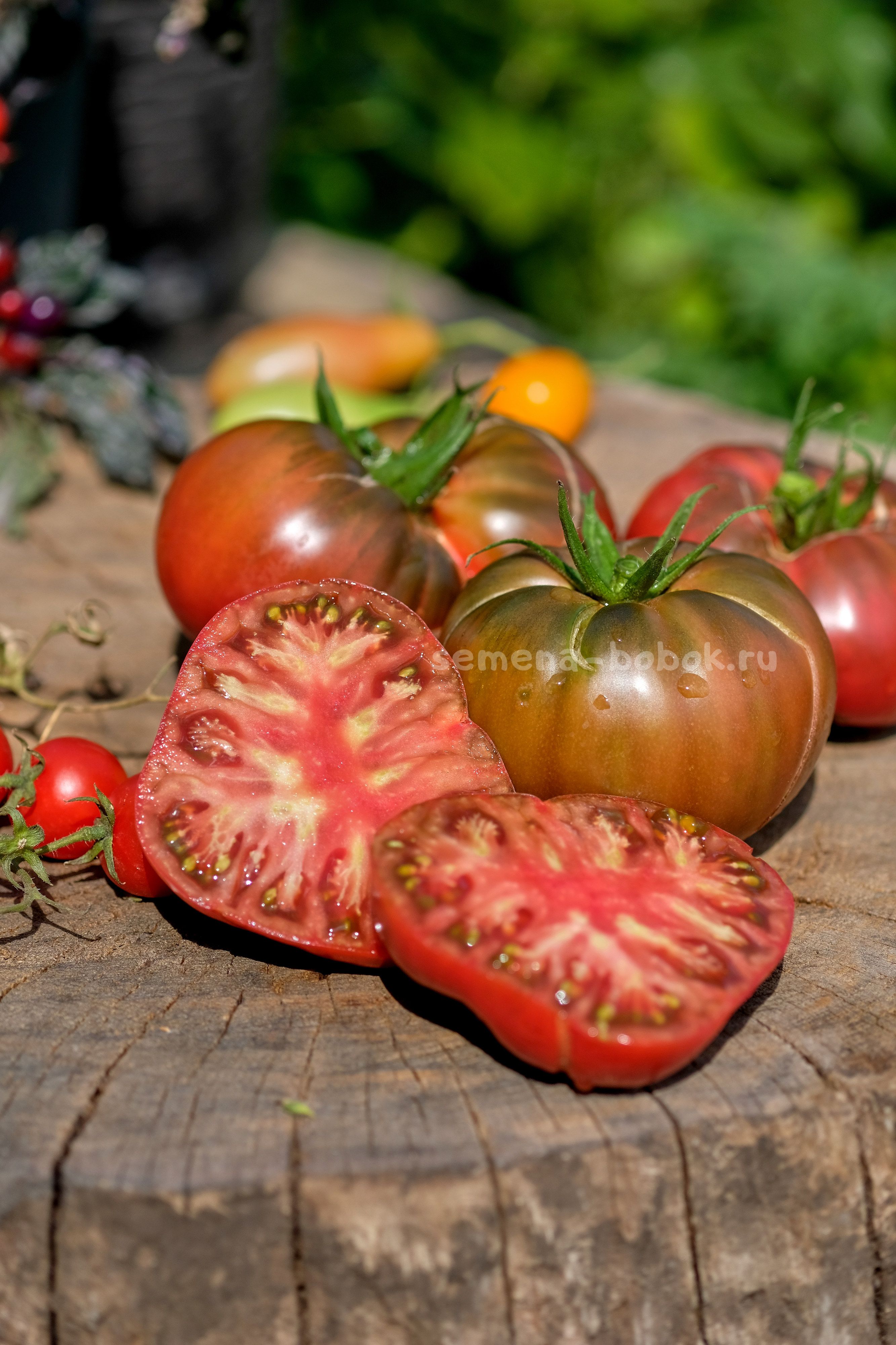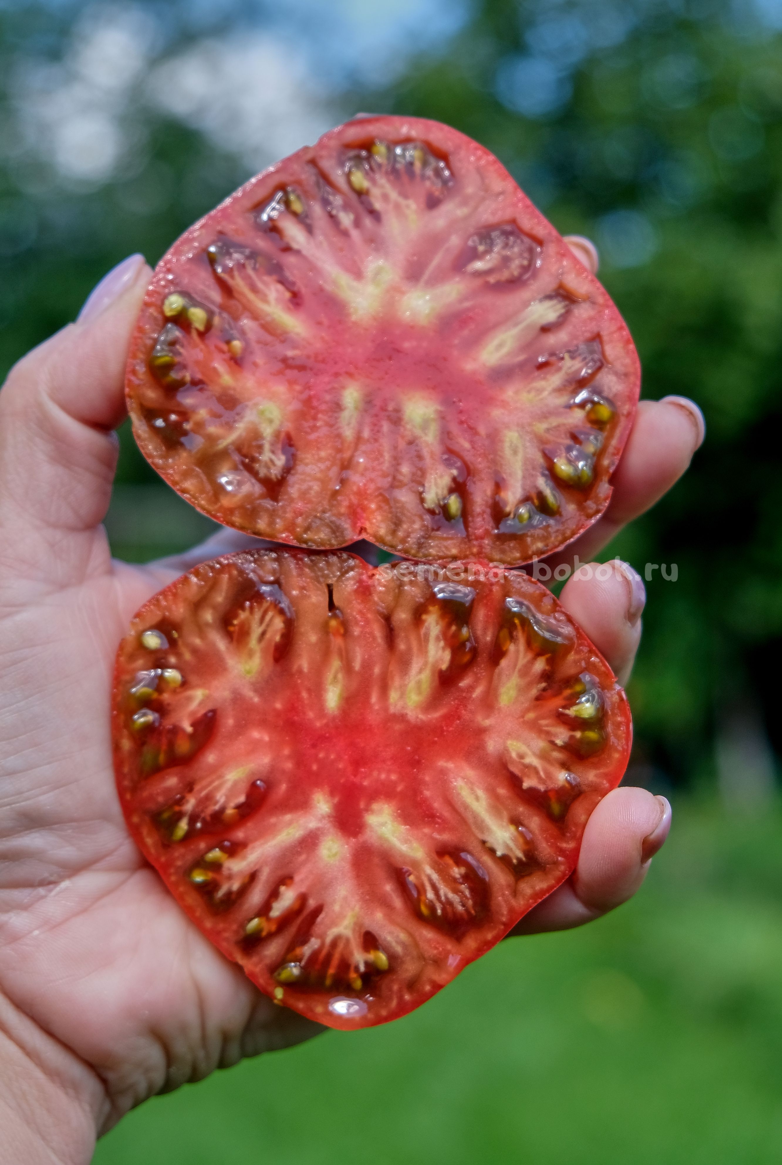 Куст в открытом грунте был 1,7 м. Сорт среднеранний. Плоды плоскоокруглые, слегка ребристые, шоколадного цвета с небольшим антоциановым напылением и зелеными плечиками. На разрезе красивый биф-томат, розово-малинового цвета с семянами в зеленом геле.