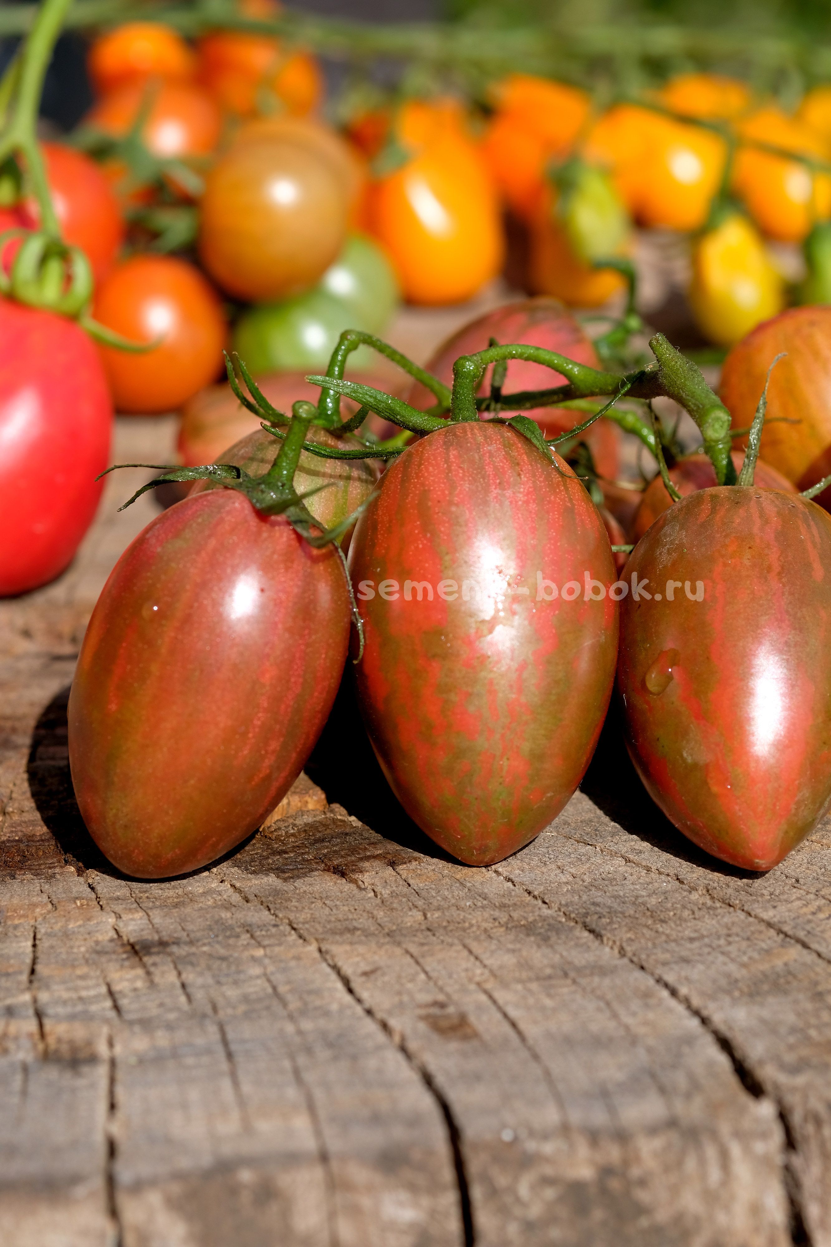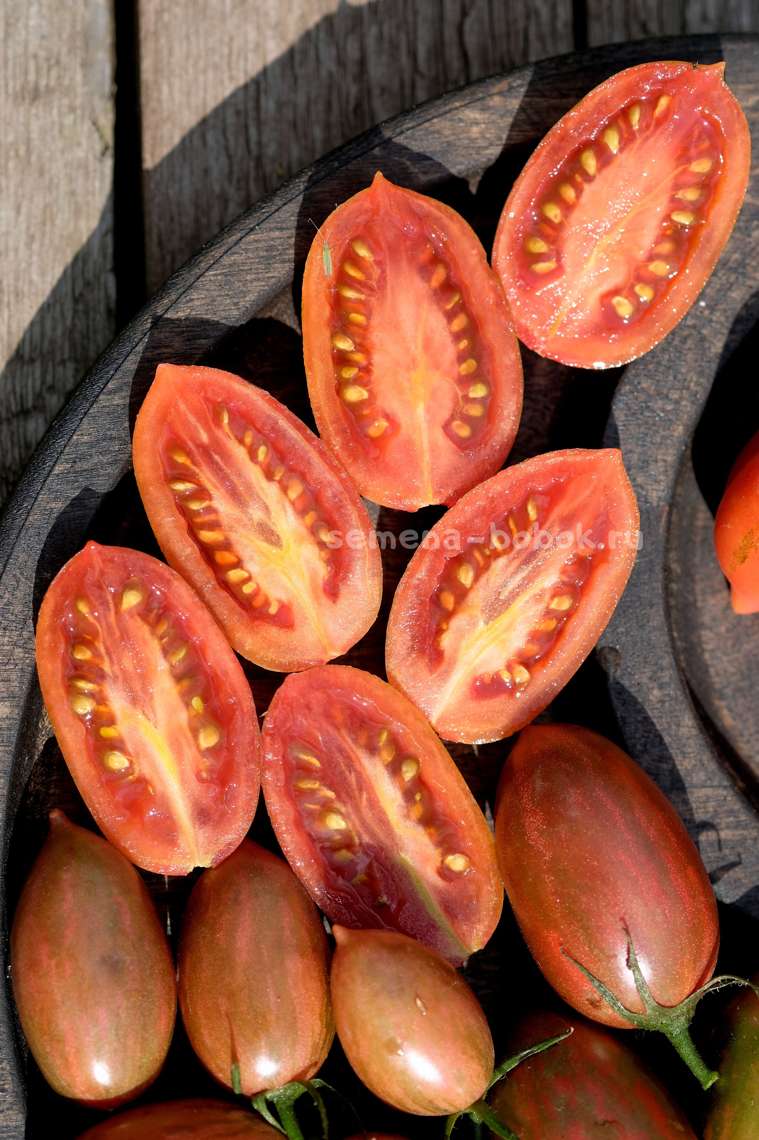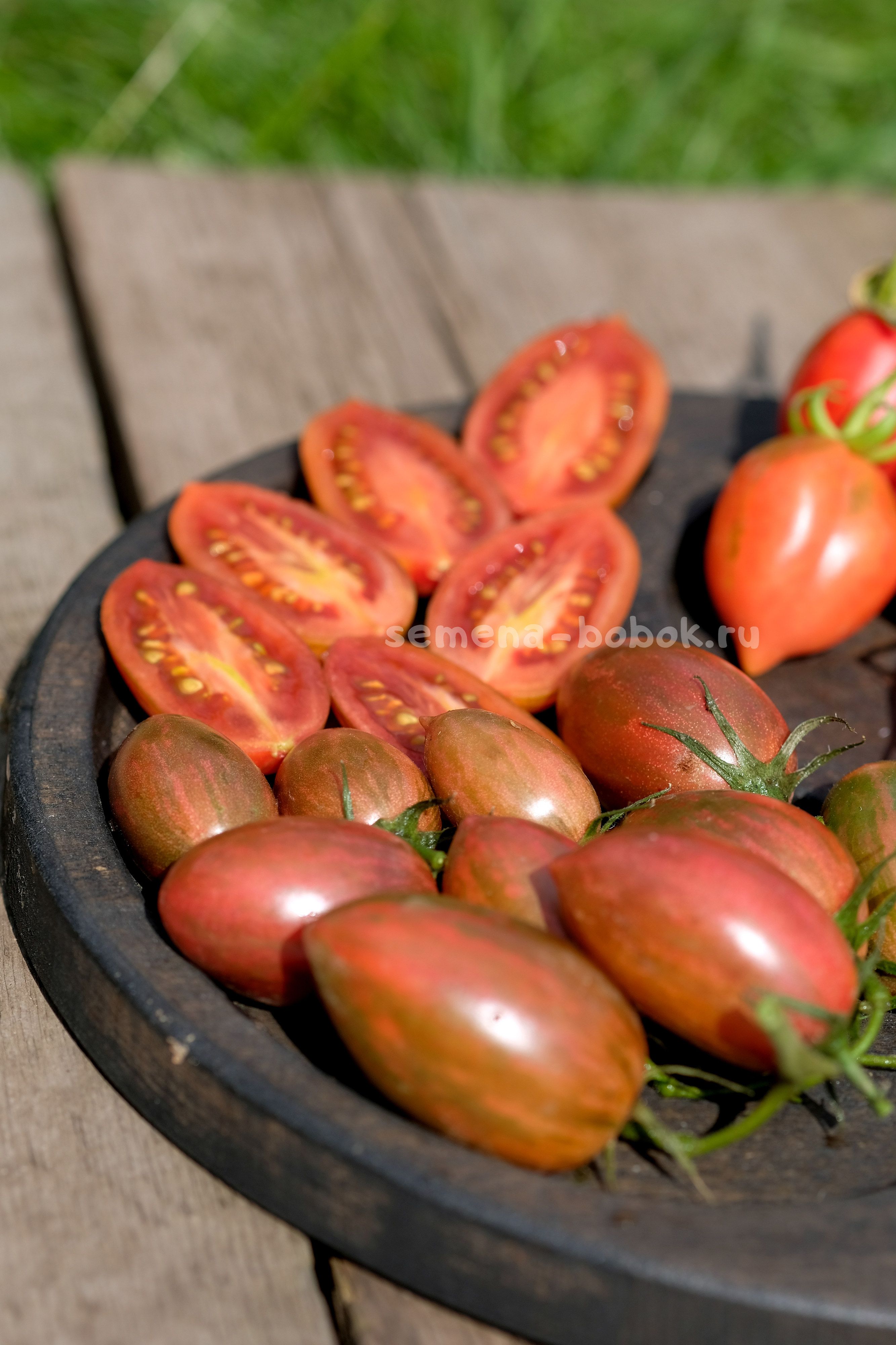 Томаты собраны в небольшие кисти по 6-7 плодов. Плоды - крупные сливки с небольшим носиком, богатой окраски - шоколадно-бордовые с зелеными и бронзовыми полосками. Мякоть бордового цвета, мясистая, сладкая, стенка толстая, упругая. Для вяления.