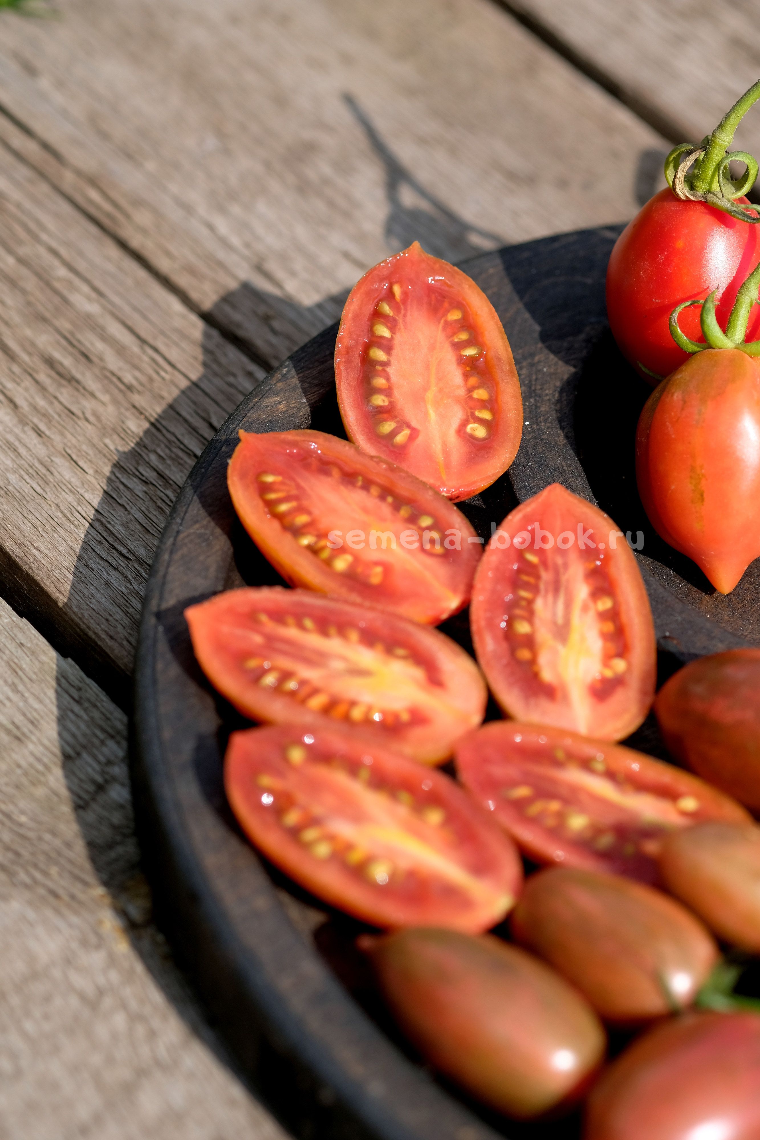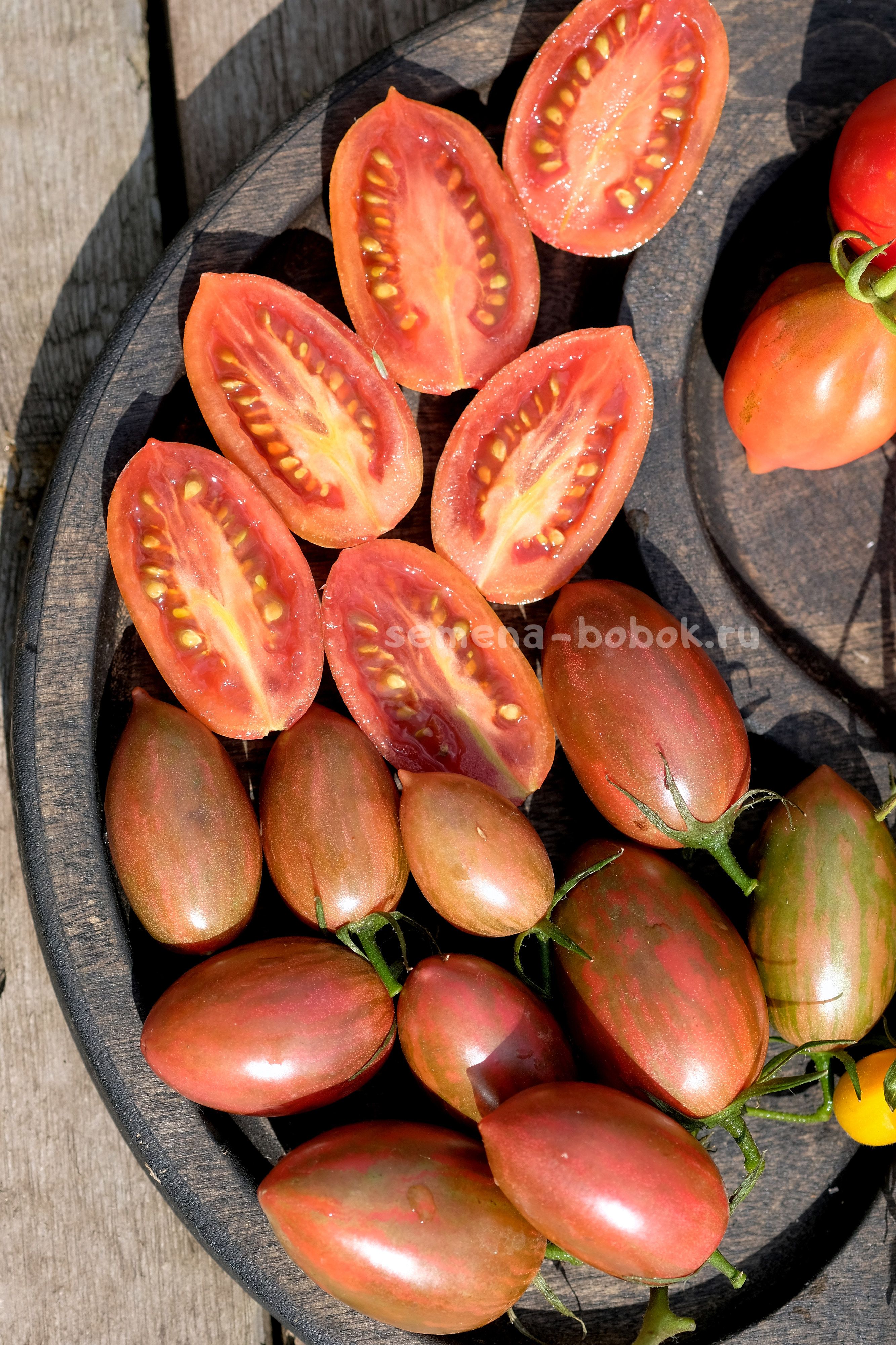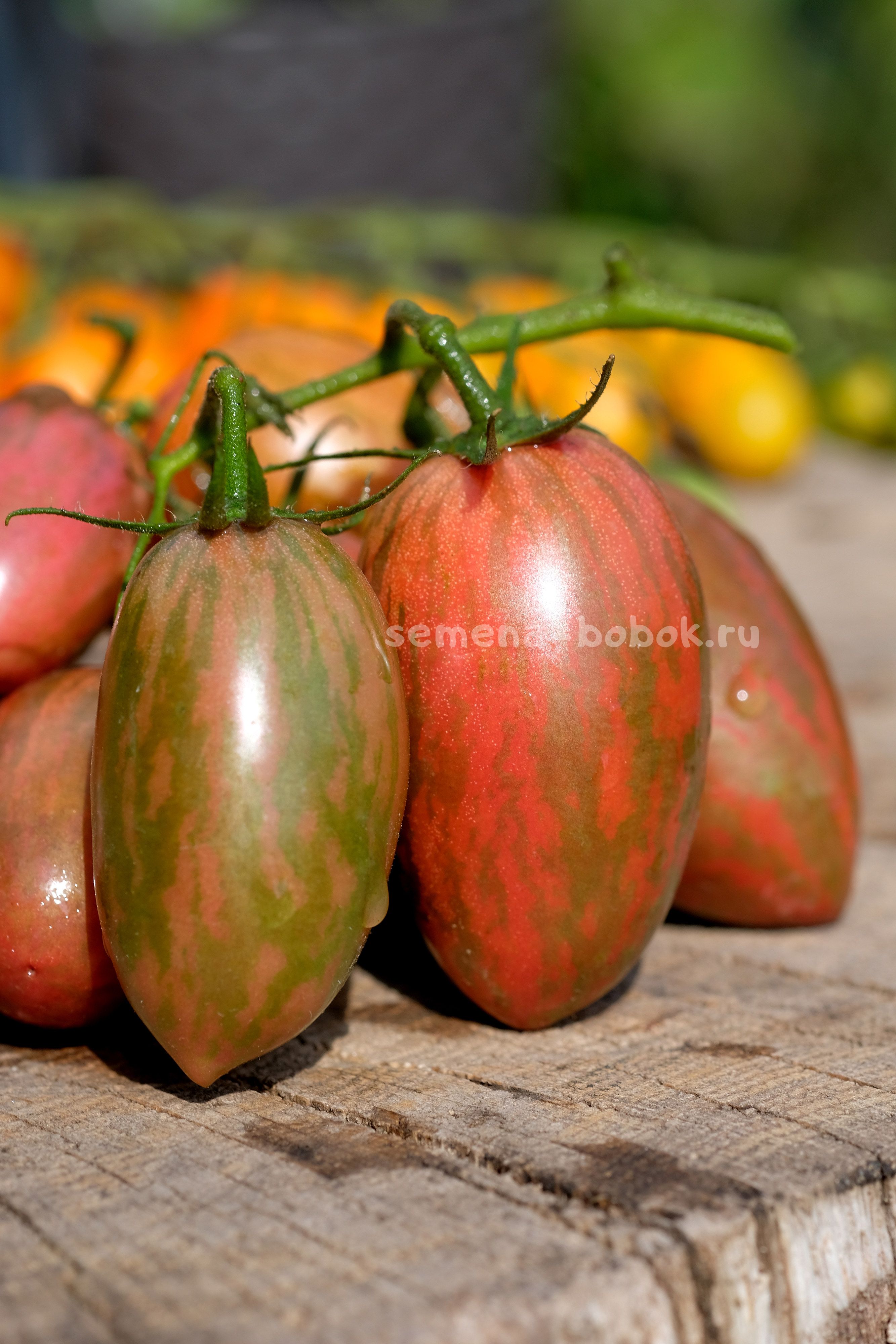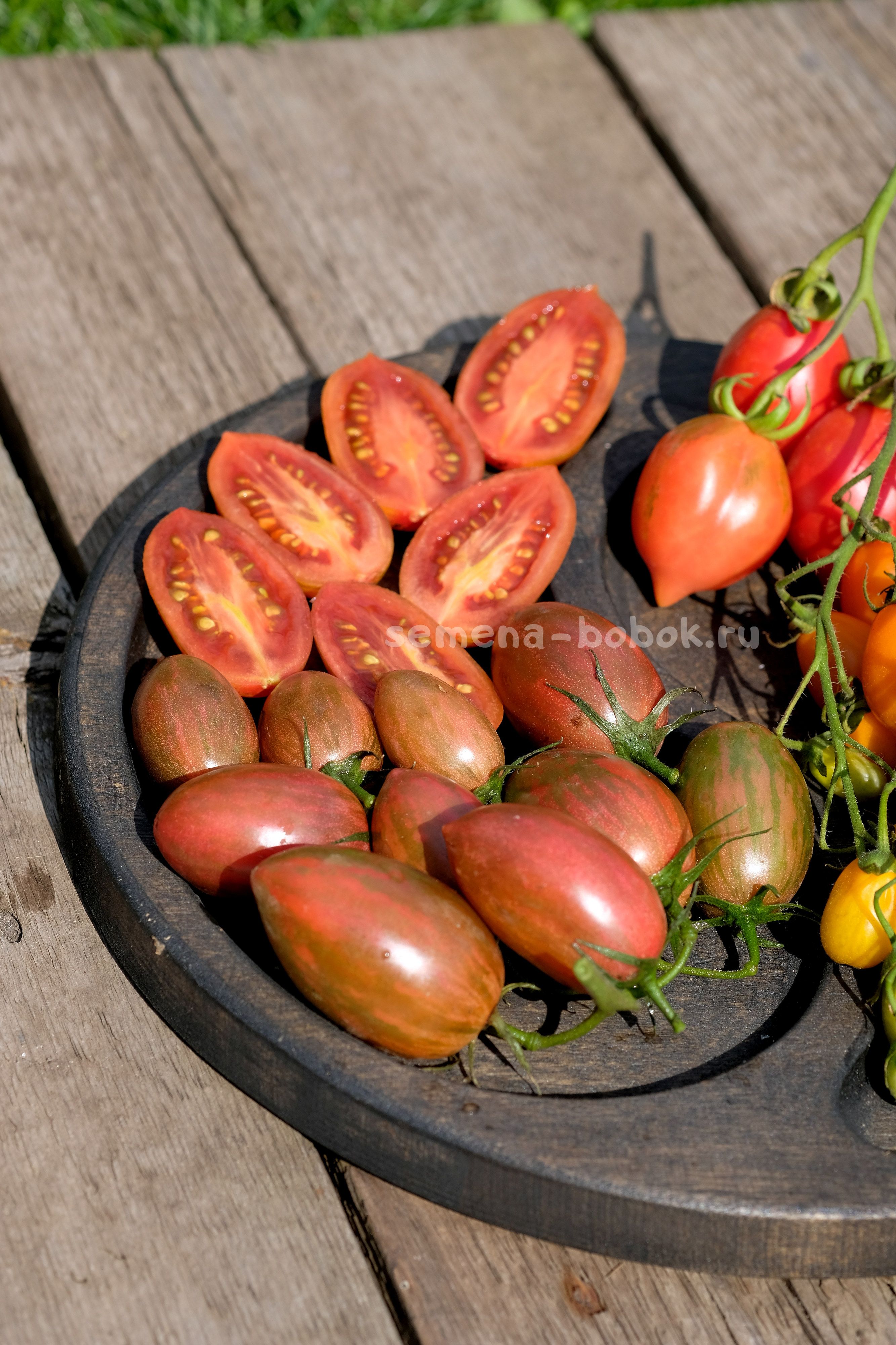 Томаты собраны в небольшие кисти по 6-7 плодов. Плоды - крупные сливки с небольшим носиком, богатой окраски - шоколадно-бордовые с зелеными и бронзовыми полосками. Мякоть бордового цвета, мясистая, сладкая, стенка толстая, упругая. Для вяления.