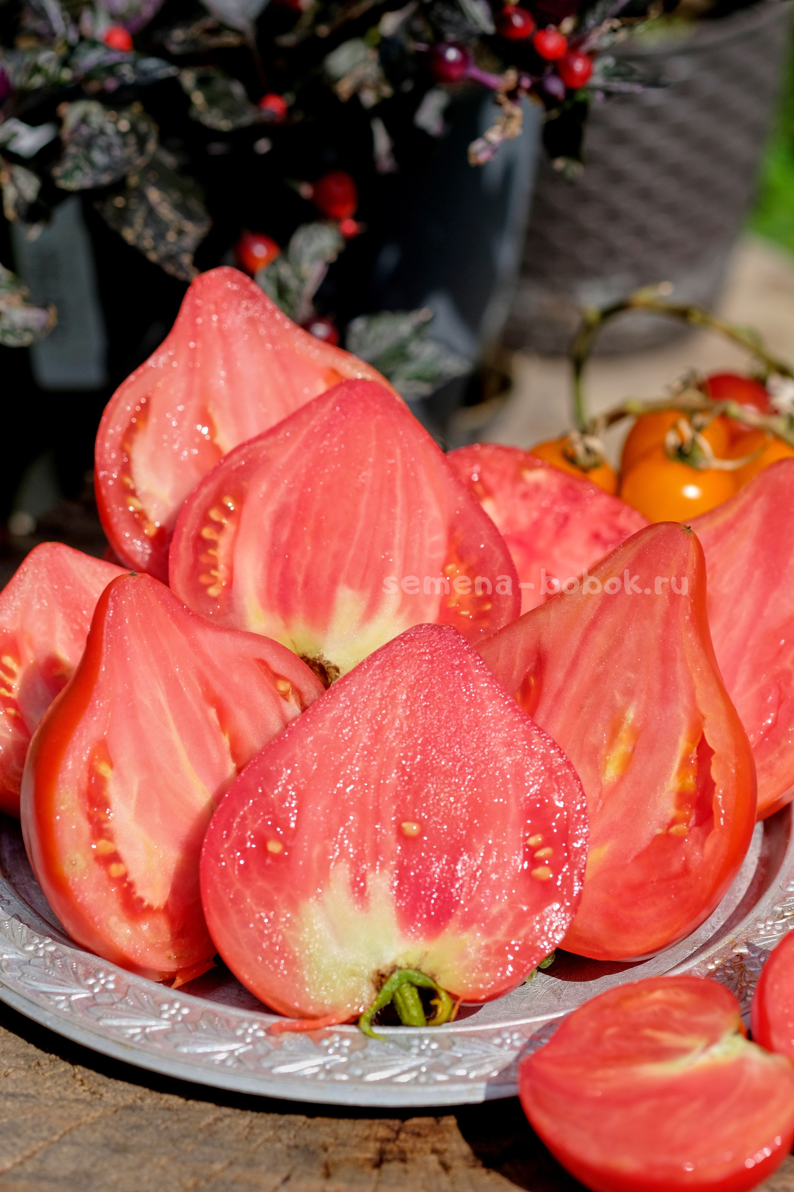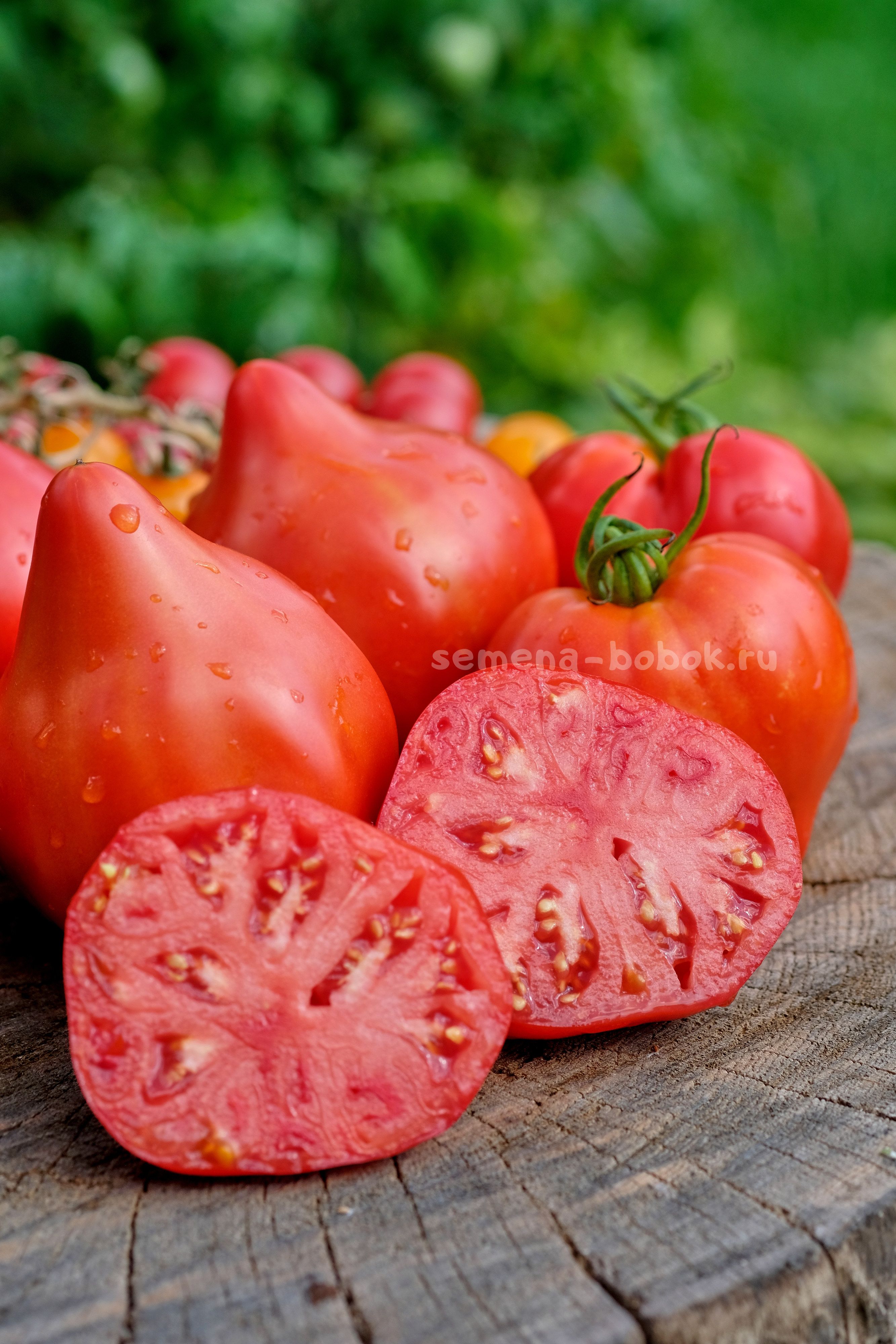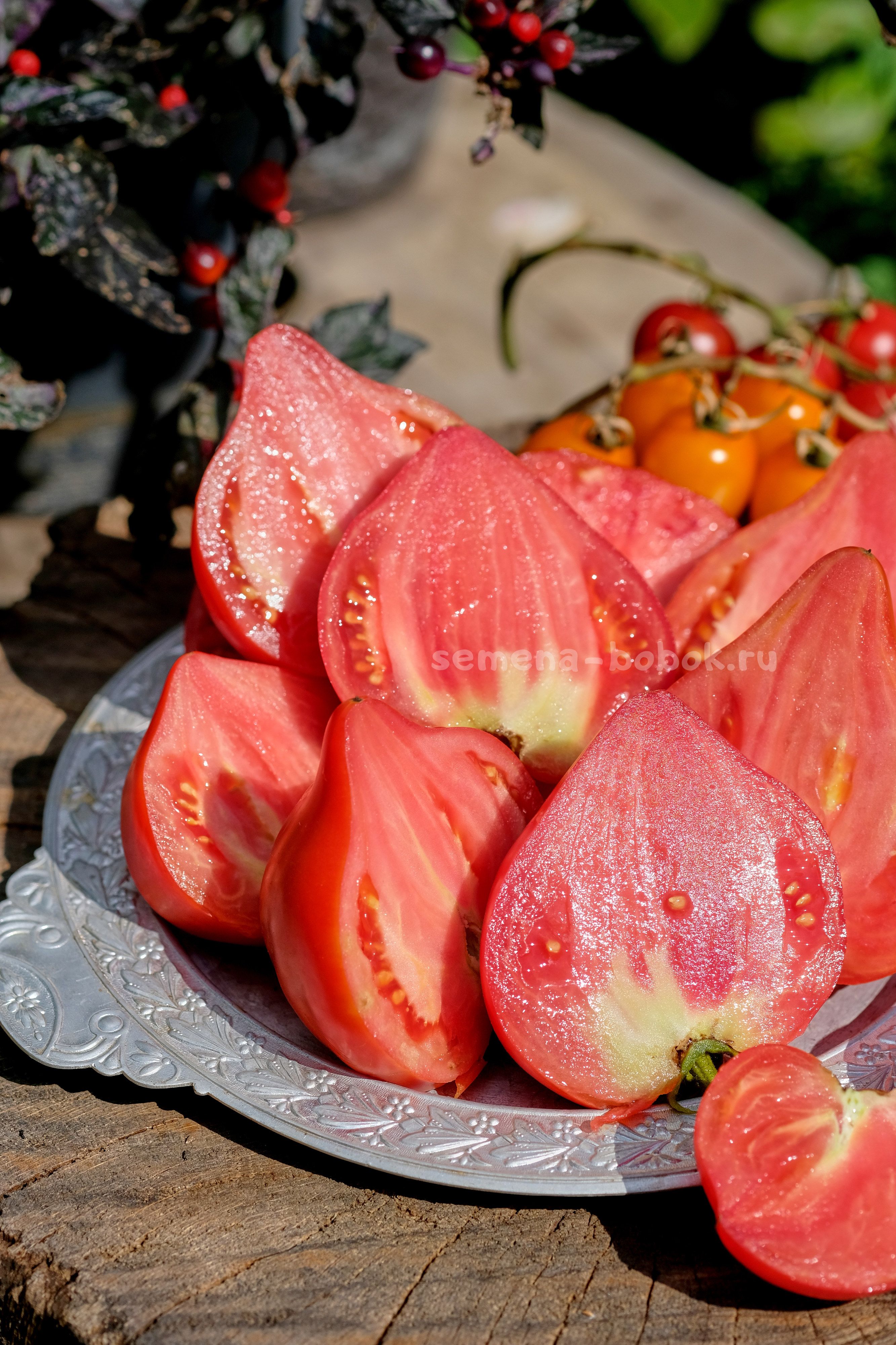 Индент, в открытом грунте 1,7 м, вела в два стебля. Плоды - крупные красные сердца с выраженным носиком. Мякоть малиново-розового цвета, плотная, но сочная, хорошего сбалансированного вкуса. Вес плодов 250-350 г.