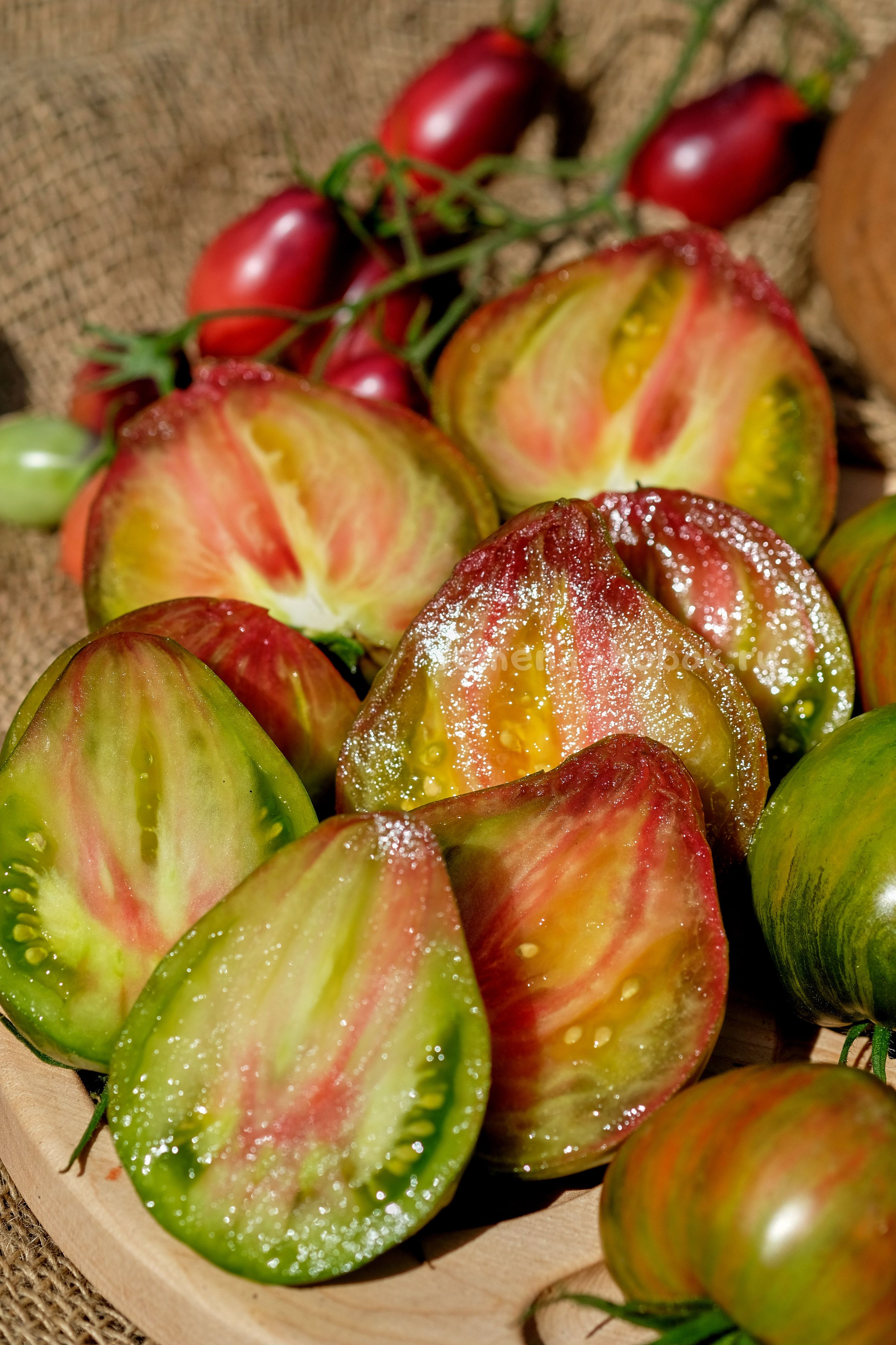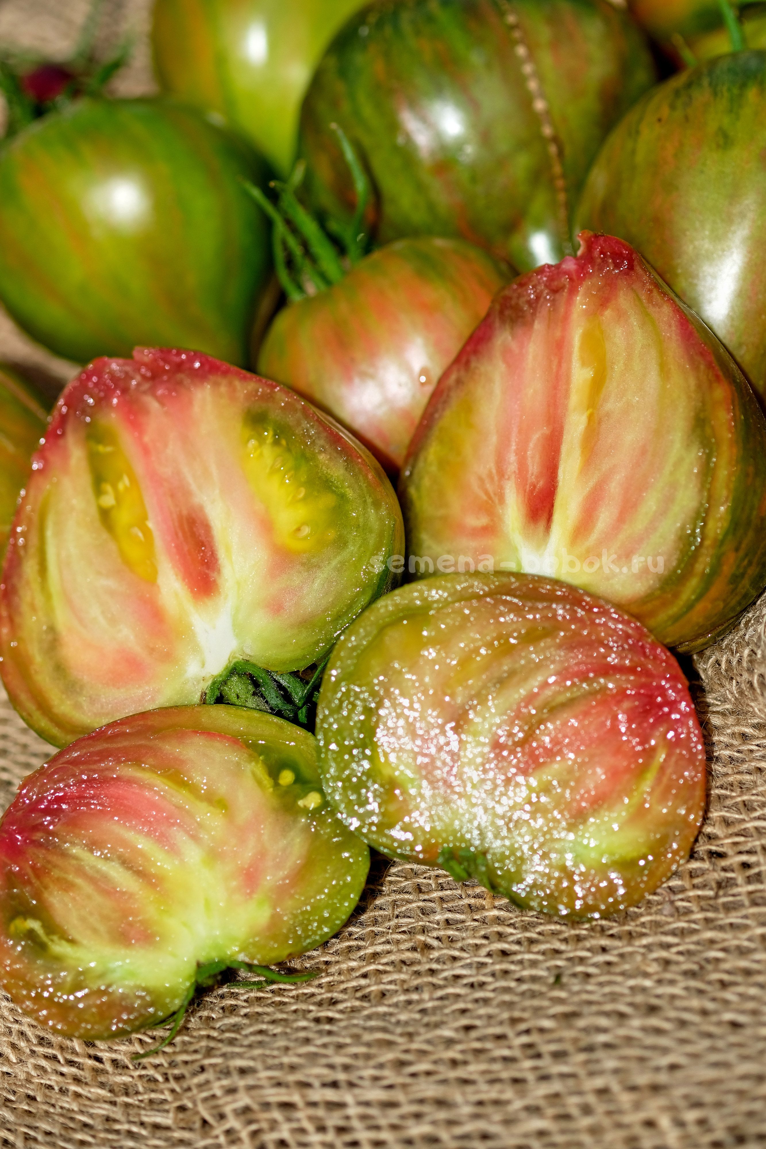 Сердцевидные плоды, зеленого цвета с антонапылением с полосками, мякоть трехцветная, очень красивая, с консистенцией персика, тающая во рту! Вкус сладкий,с фруктовым послевкусием, пока резала на семена - все плоды съела. Вес томатов 200-300 г, урожайный очень.