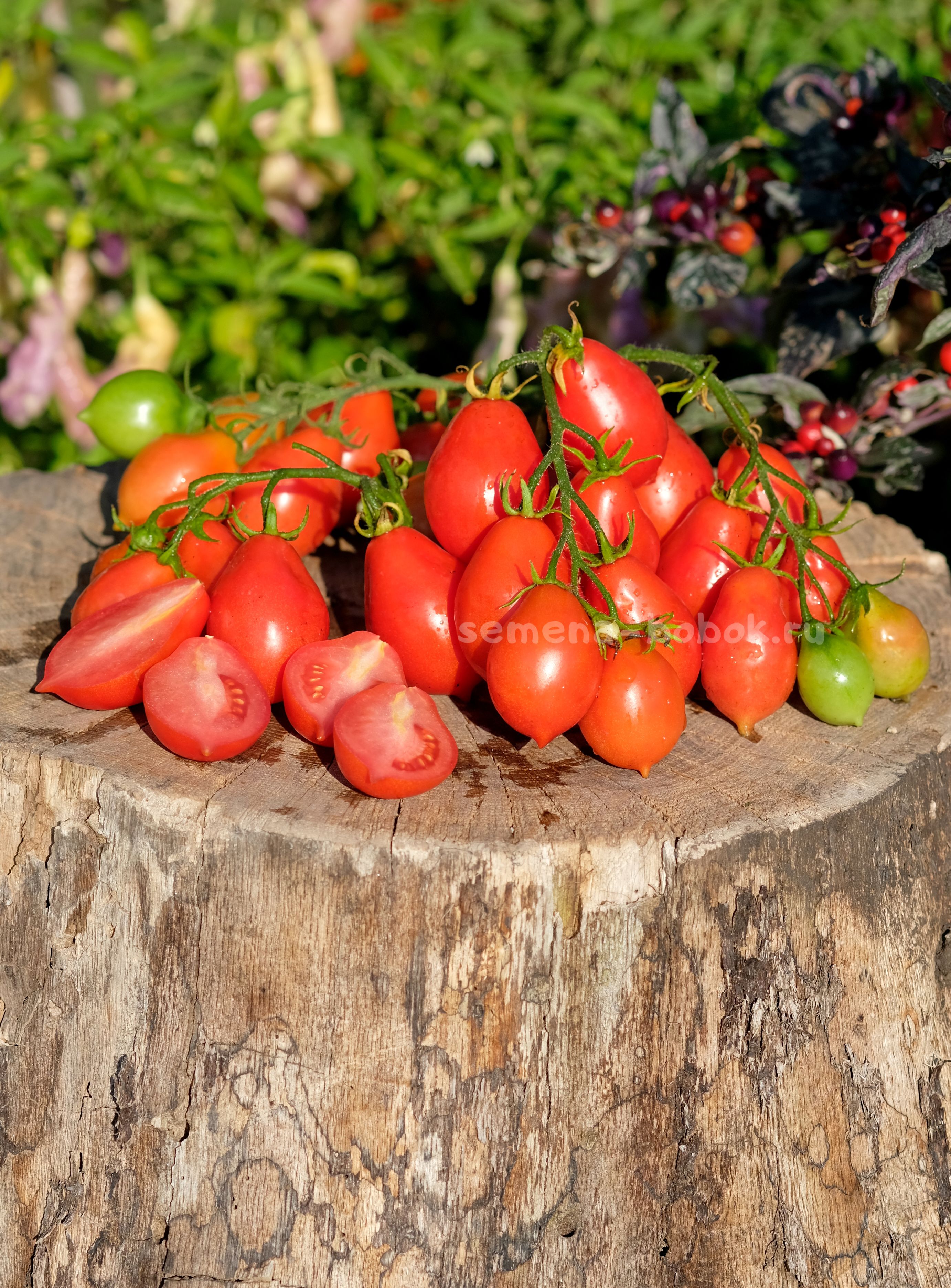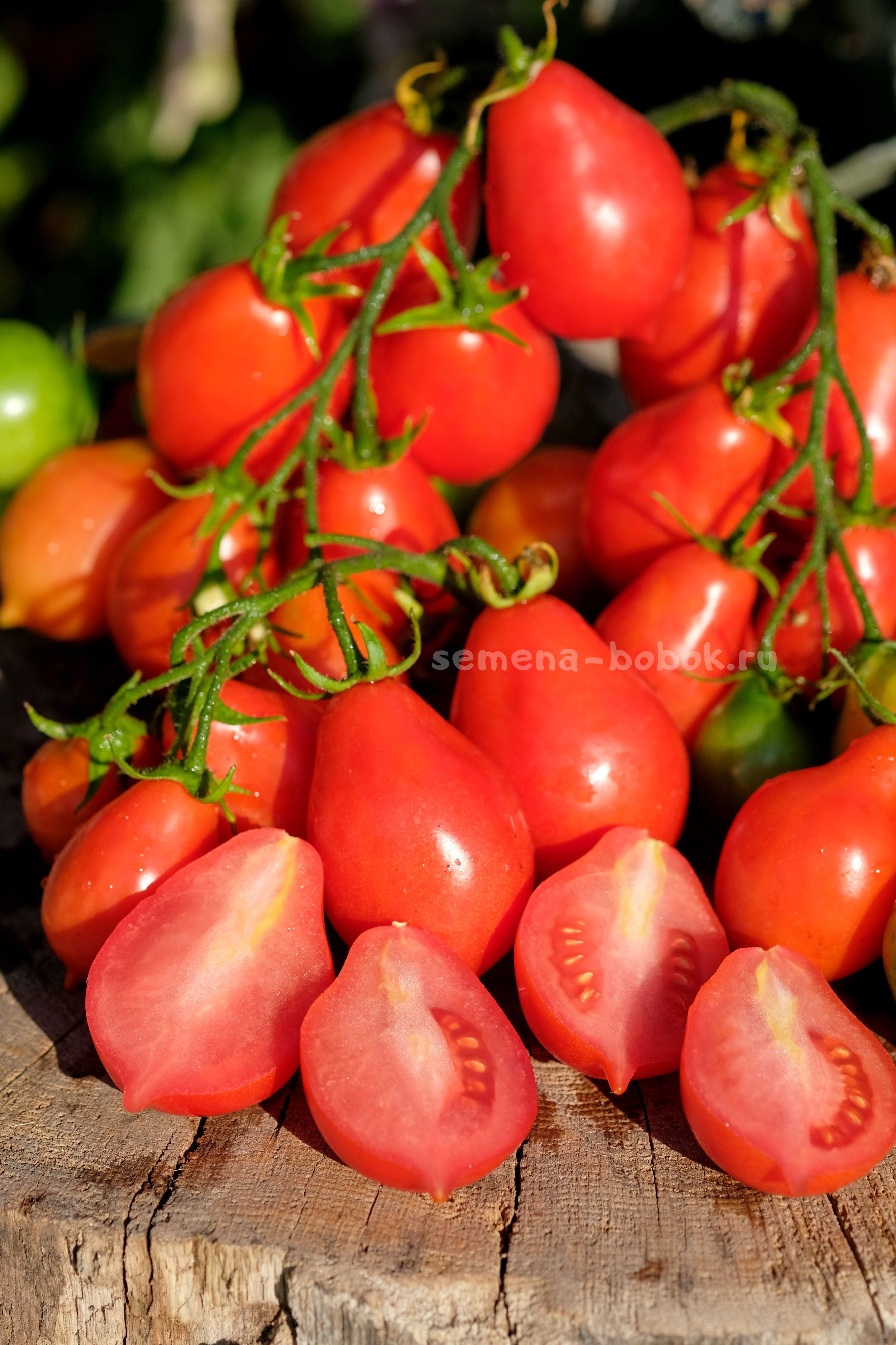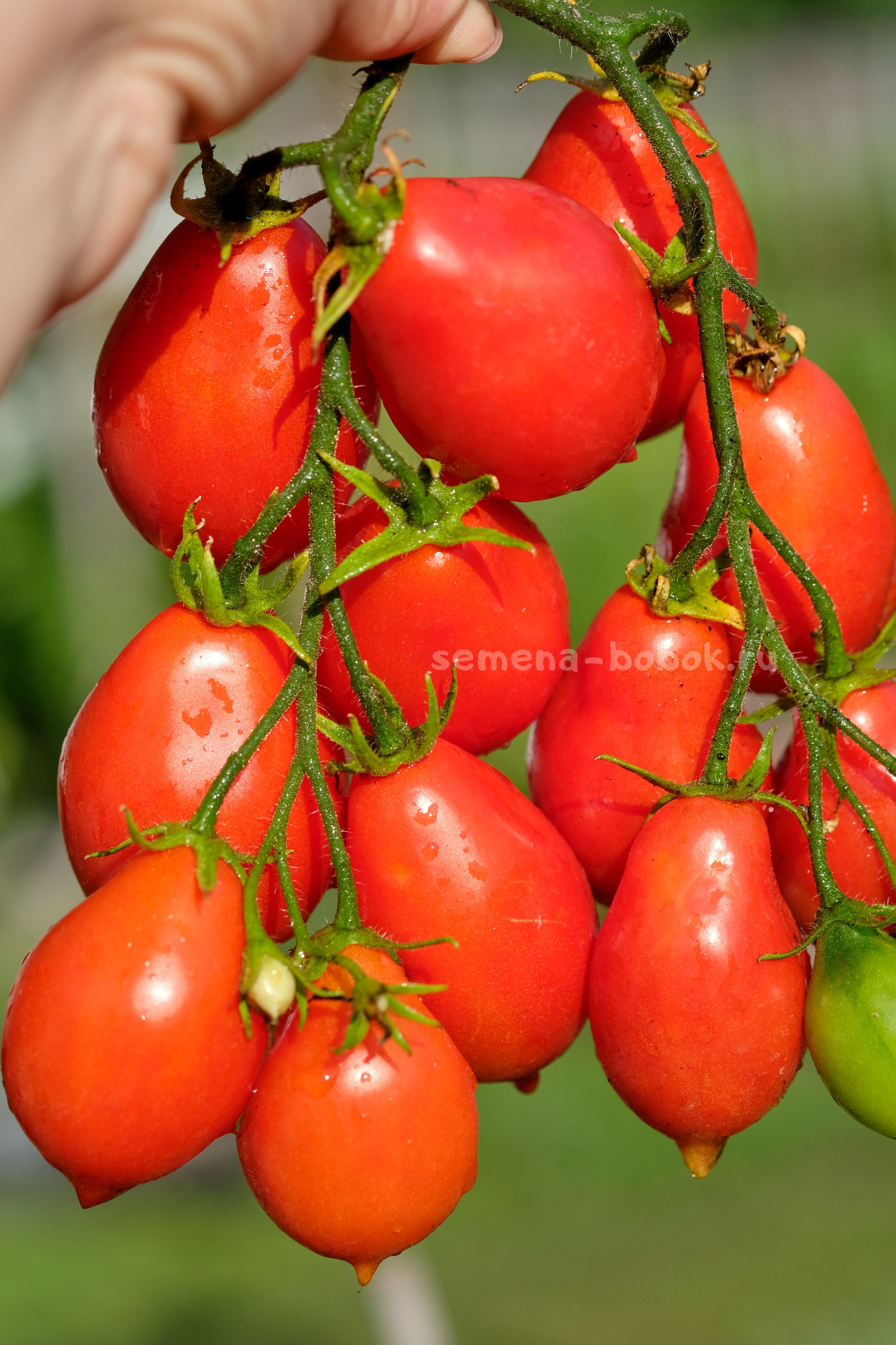Детерминантный сорт. В открытом грунте куст был около 80 см, рос без пасынкования. Можно выращивать как стелющийся или ампельный. В августе весь усыпан красными "грушами" весом 80-90 г. Очень дружно созревает. Томаты не растрескиваются, могут немного полежать, хорошо подойдут для цельноплодного консервирования. Вкус обычный, томатный.