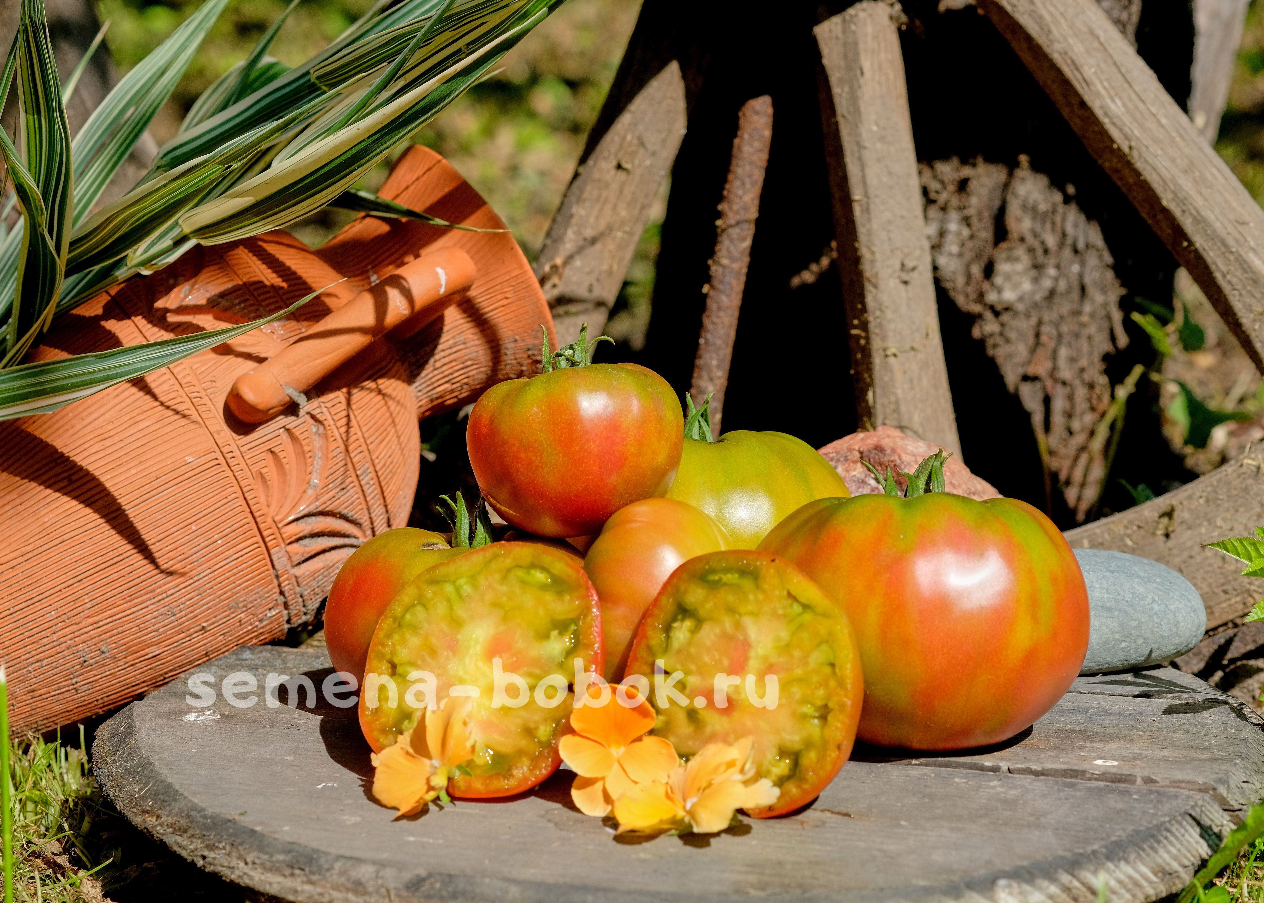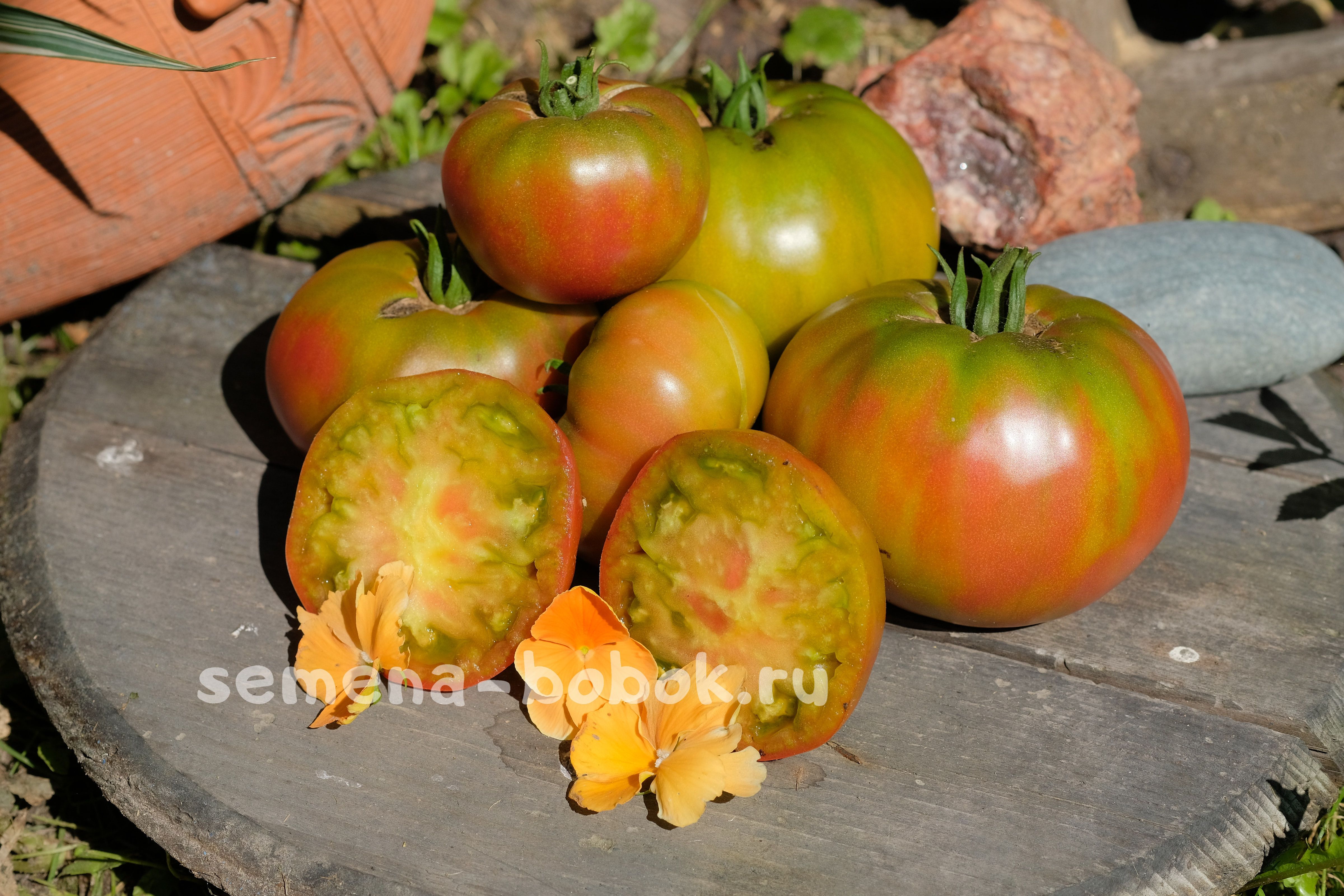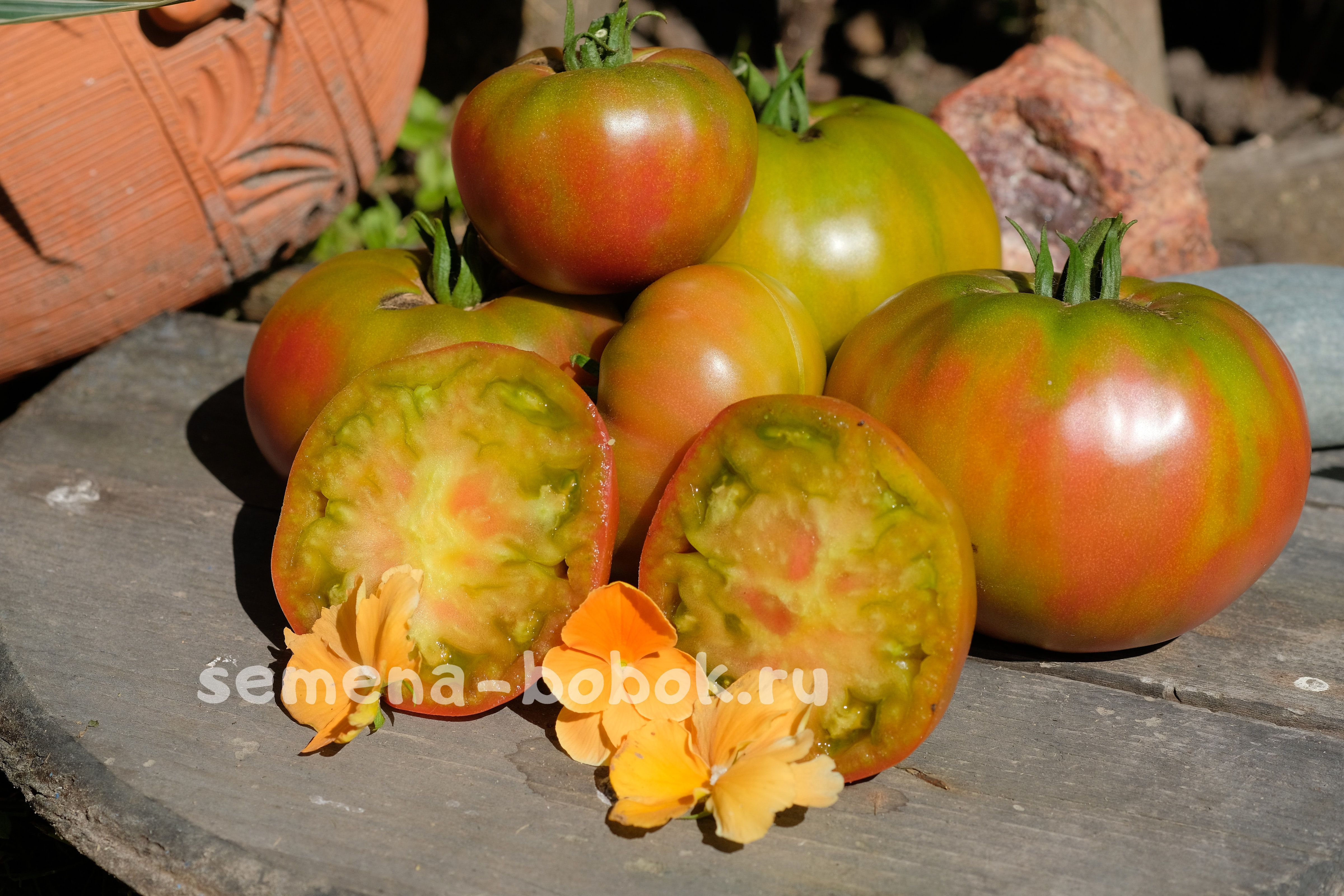 Плоды крупные (от 200 до 600 гр), кожица прочная - не растрескивается. Этот томат невероятной расцветки: оттенки бронзы, светло-зеленые вклапления, темно-желтые пятна, розовые разводы. В полной зрелости цвет томата становится изумрудно-коричневым.