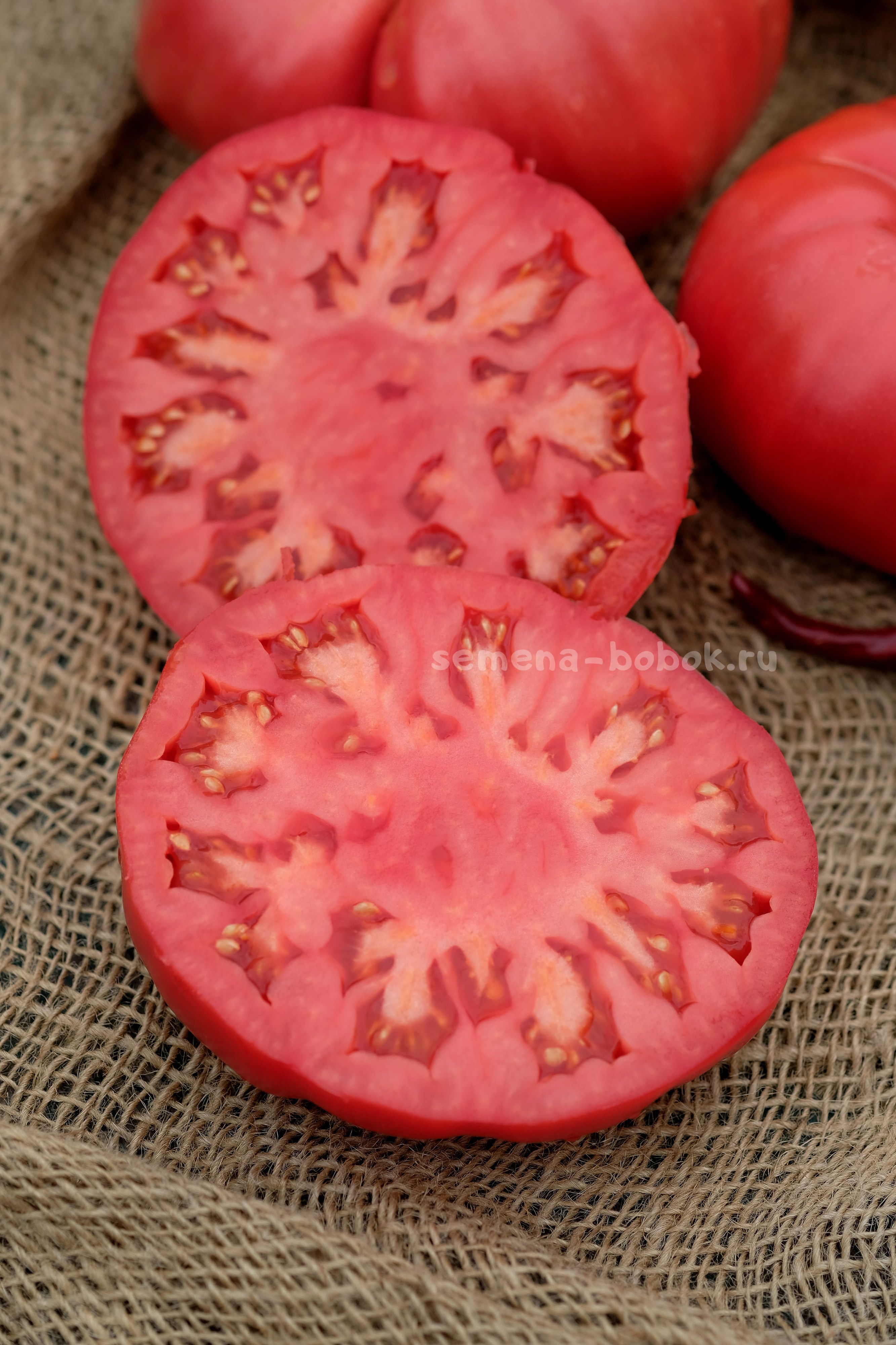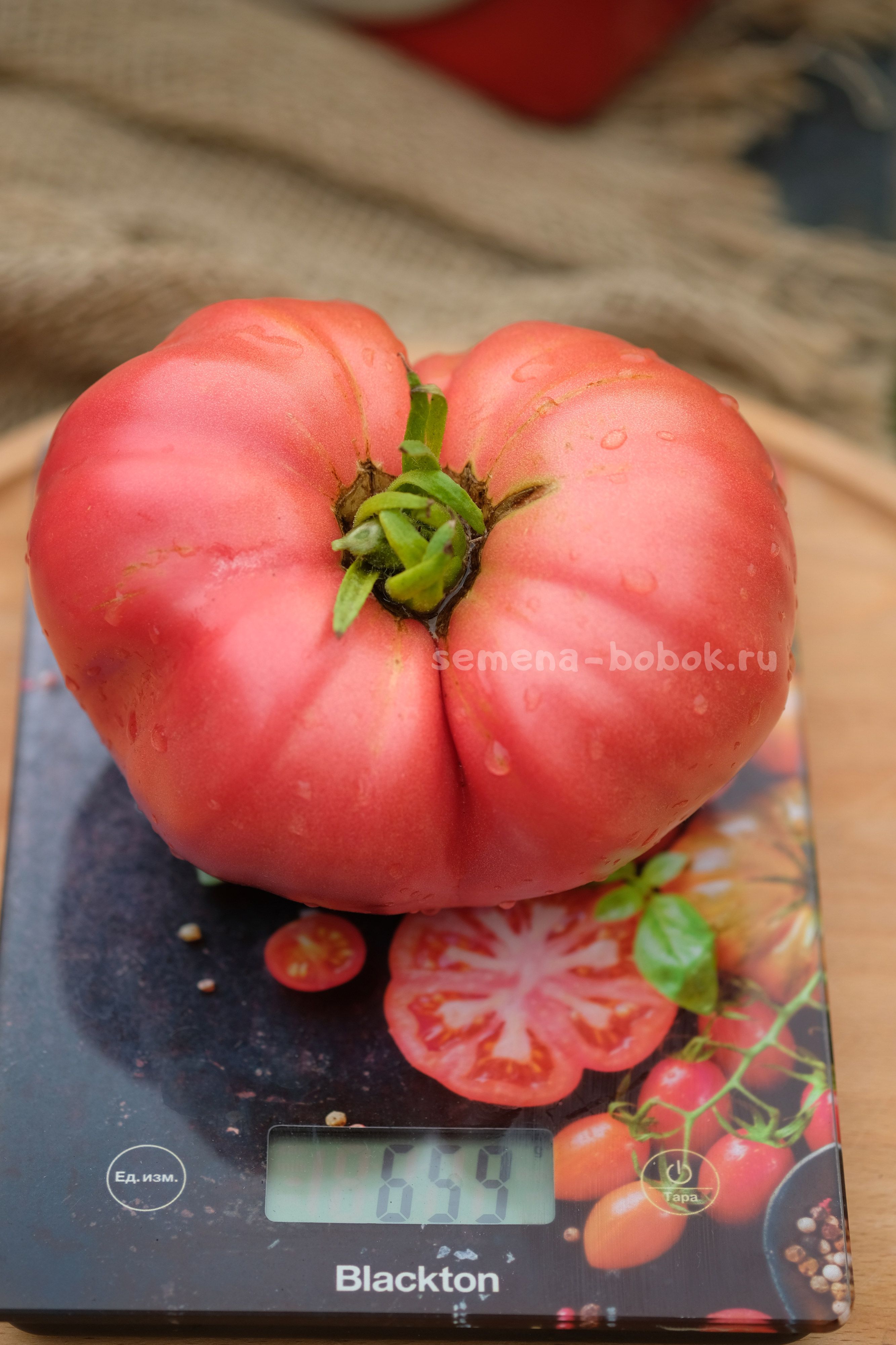 Томаты розового цвета, плоскоокруглой формы, чуть ребристые с пышными плечиками. Вес плодов до 1 кг, если нормировать кисти - будут и больше. Мякоть мясистая, плотная, с хорошим помидорным вкусом. Семейный сорт из Минусинска.