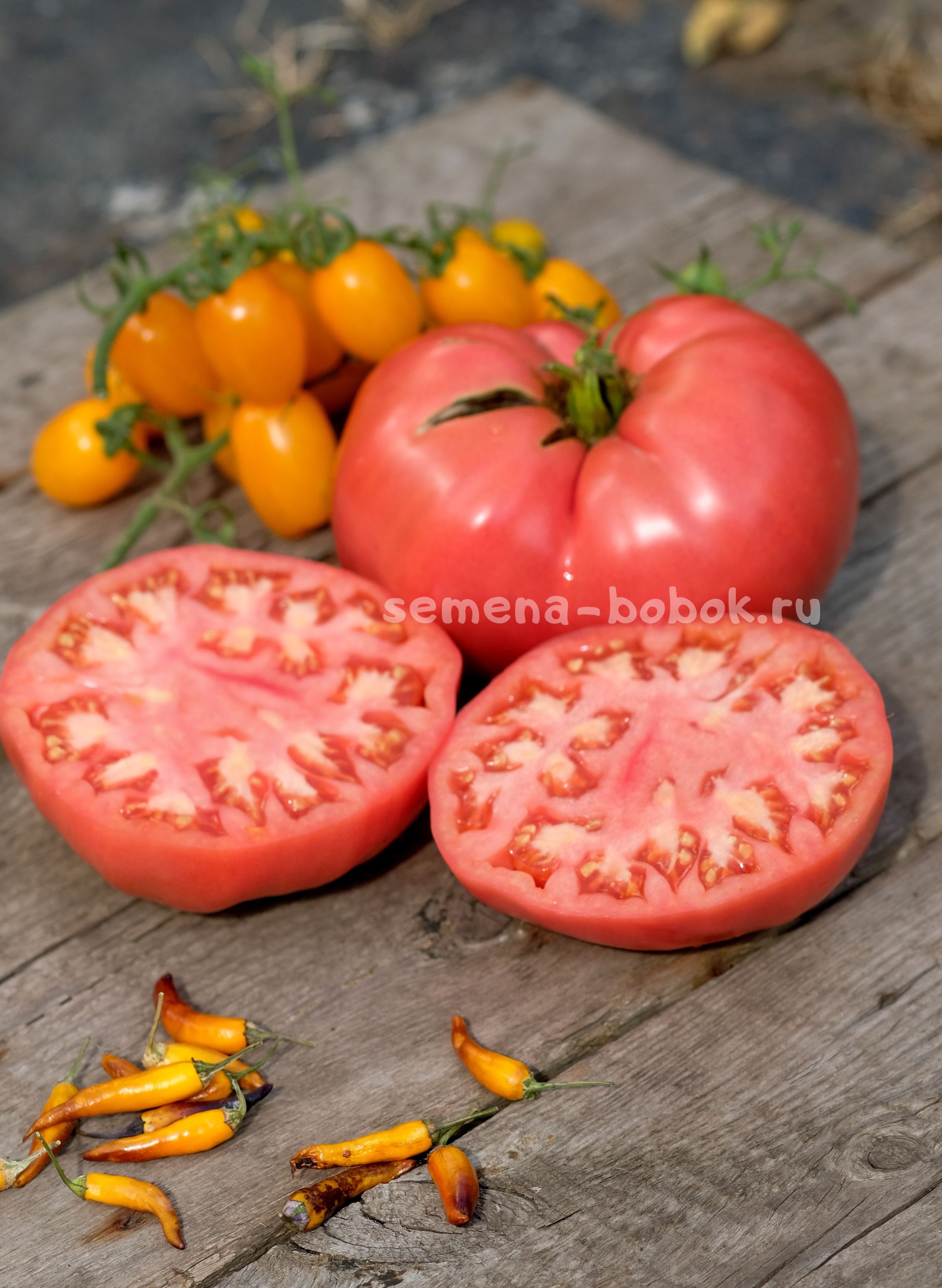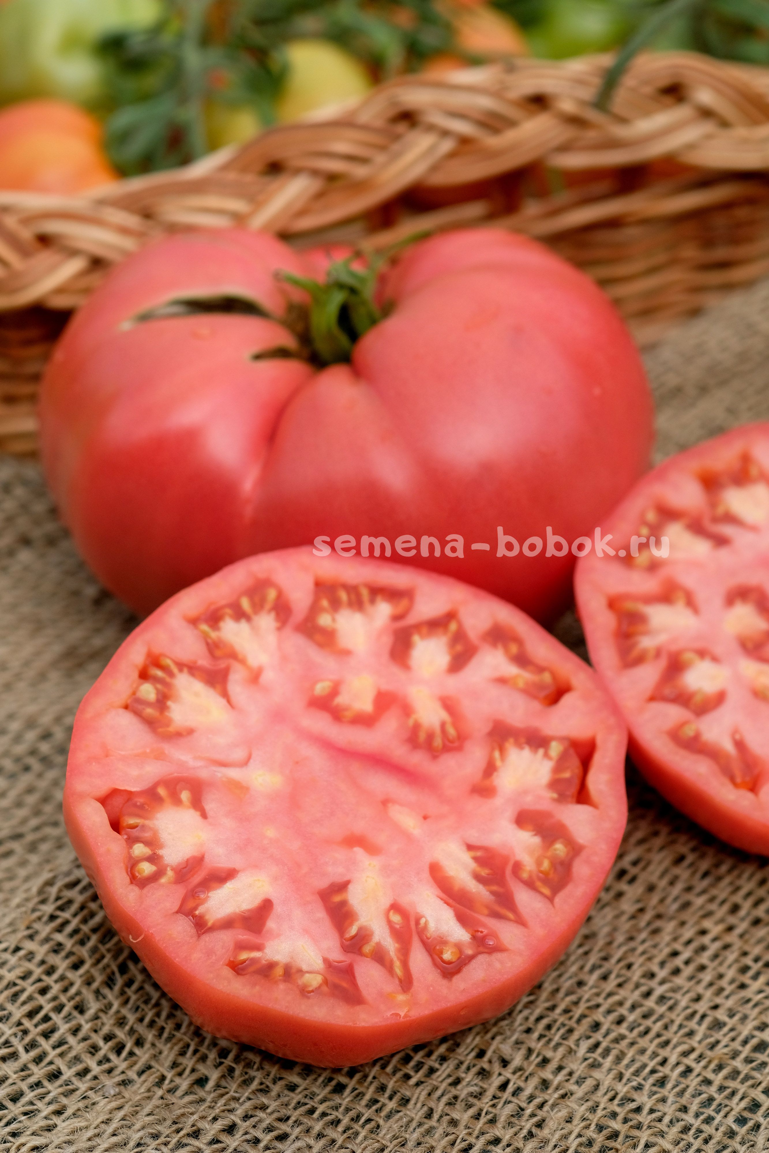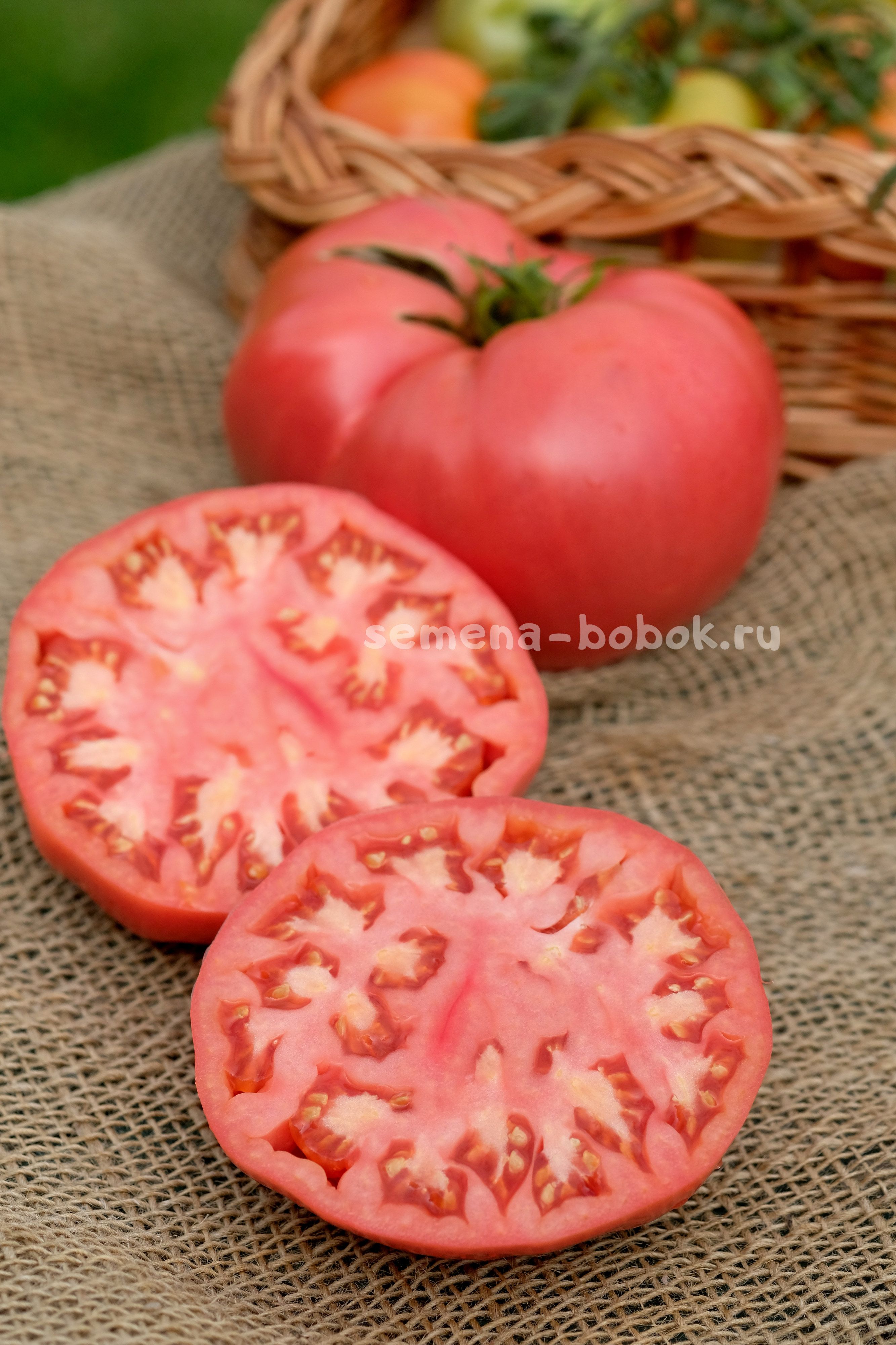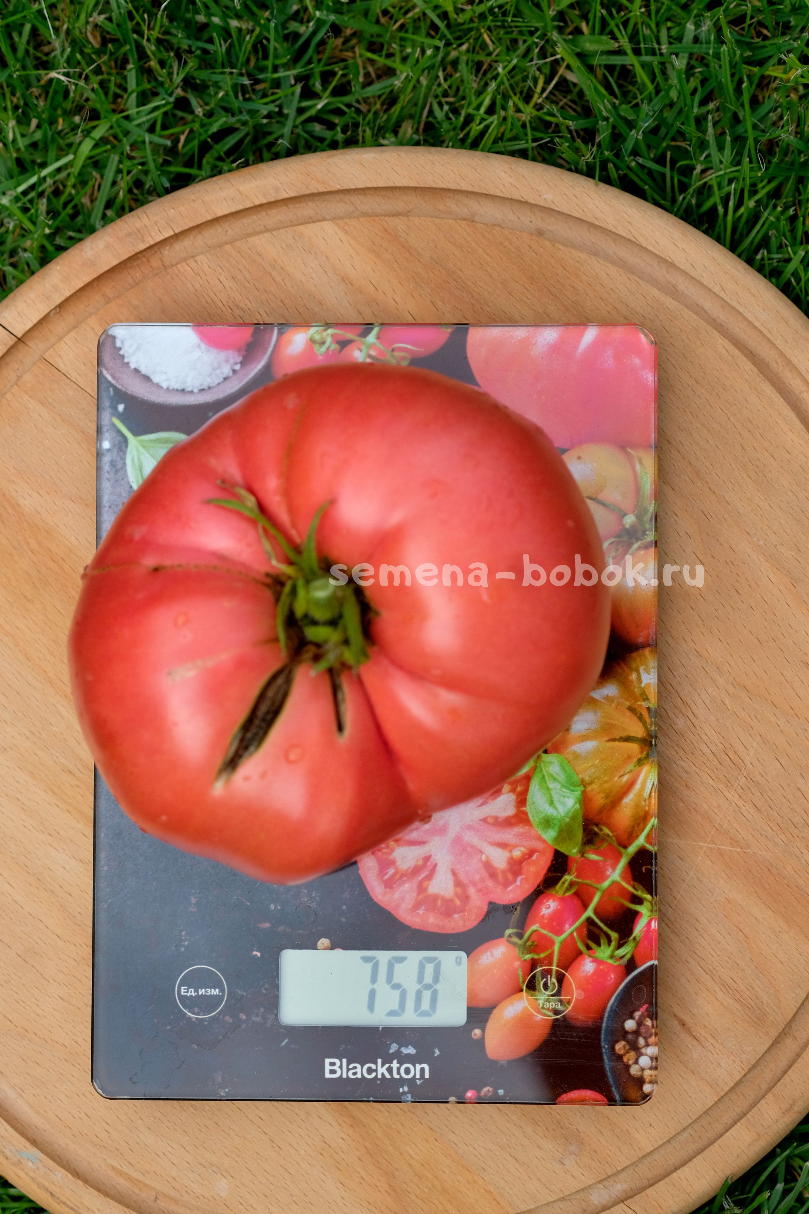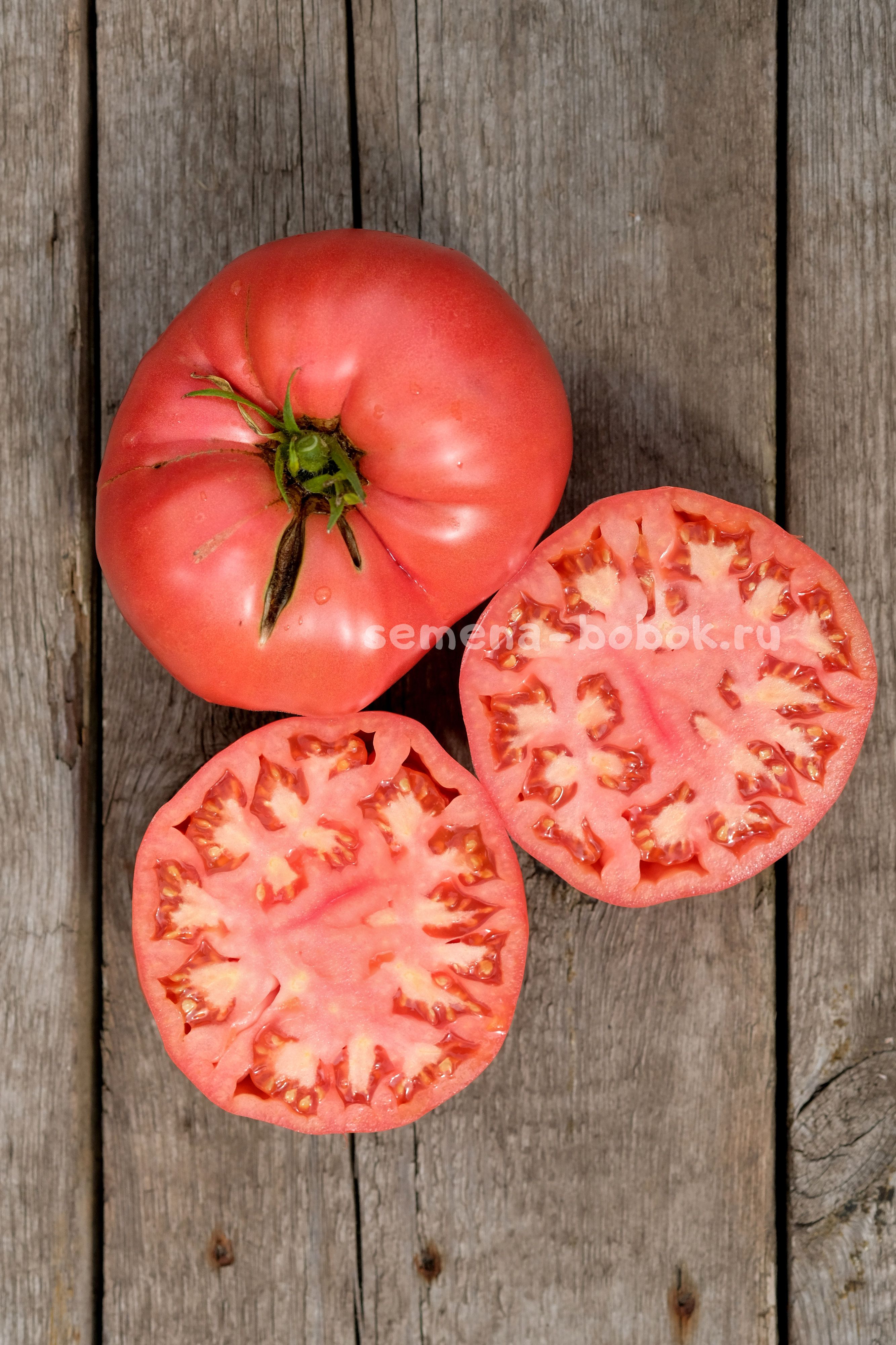 Плоды - огромные розовые бифы, с пухлыми плечиками. Мякоть малиново-розовая, плотная, мясистая, сладкая с долей кислинки. Томаты могут полежать после съема. Вес плодов 500-900 г, мелочи нет. Дя салата, густых соков и соусов.