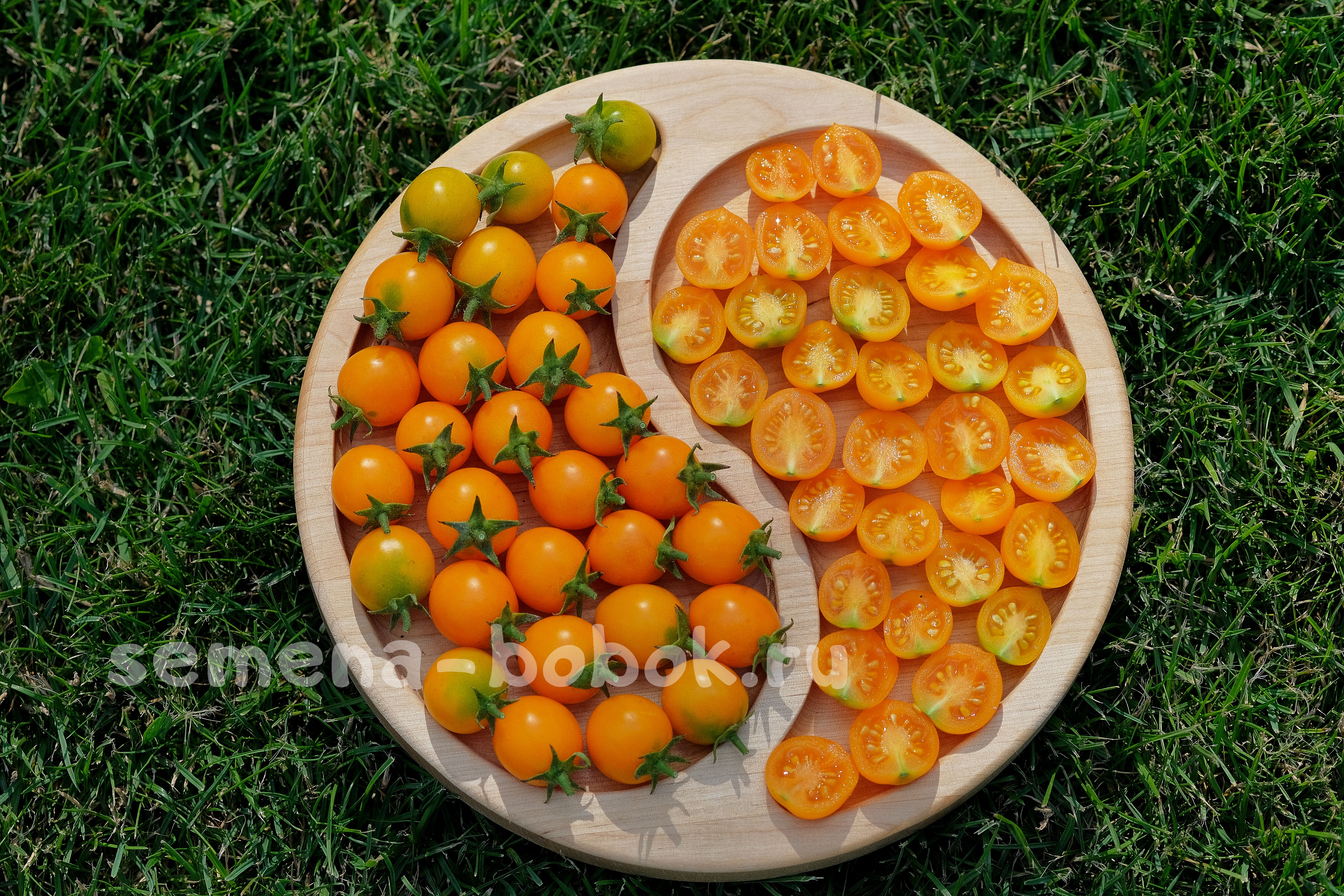 У меня росло два куста в 5 листрах каждый - маловато, лучше высаживать в кашпо объемом от 10 литров. Плети длинной около 30 см, не пасынкуется - каждый пасынок - это будущая кисть. Плоды ярко-оранжевые черри, с небольшим носиком, весом 12-16 грамм. Очень сладкие! Вкус классического оранжевого томата, сладкий, с небольшой кислинкой. Очень дружная отдача урожая - у меня поспели кусты полностью, одновременно.