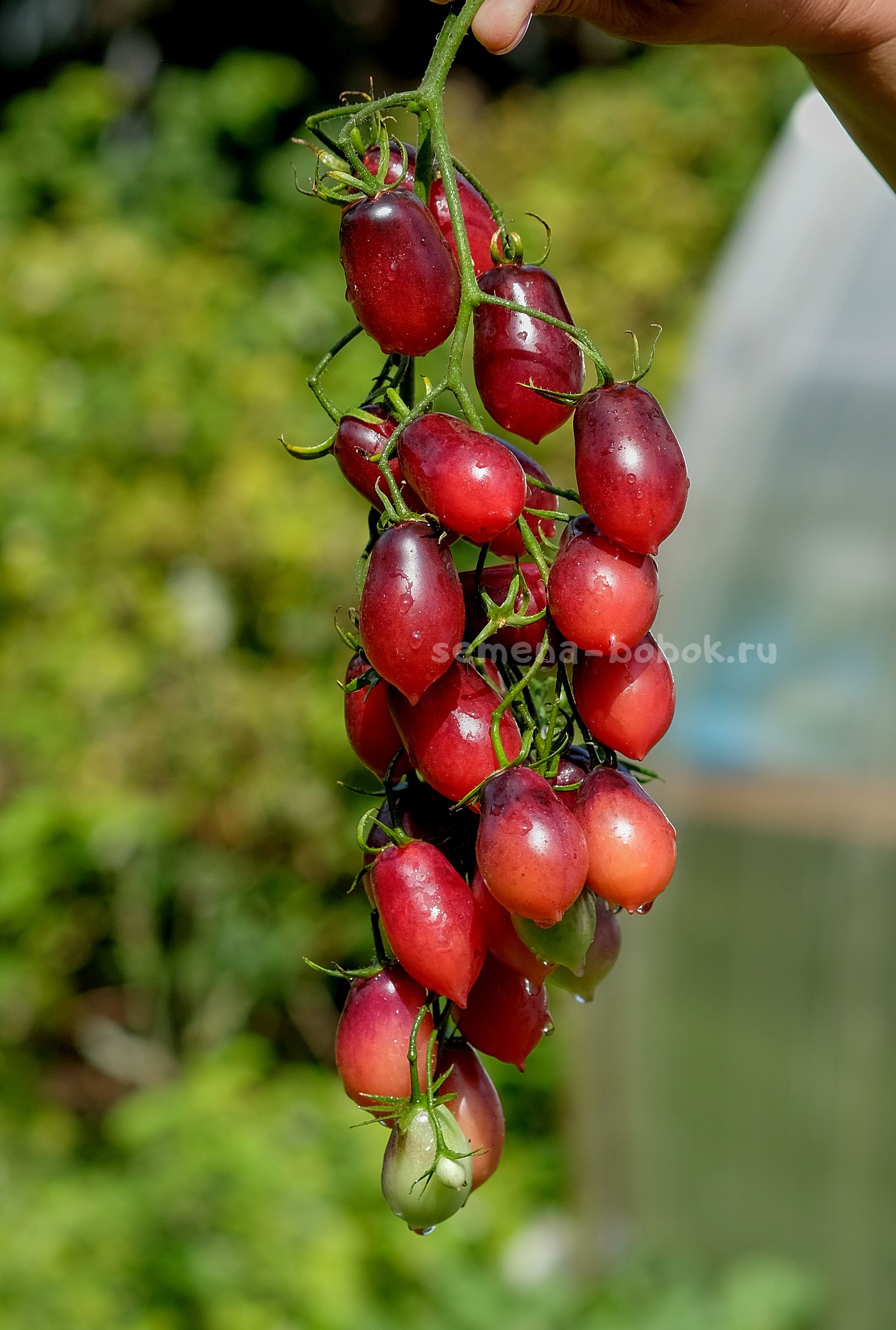 Очень урожайный сорт. Плоды - небольшие сливки, весом 25 г, ярко-малиновые с густым антоцианом на плечах. Томаты плотные, для полного вкуса дайте им повисеть созревшими на кустах. Вкус со сладостью и кислинкой. Очень хороши в маринаде, для тех кто любит плотные томаты в банке. Ну и красив невероятно.