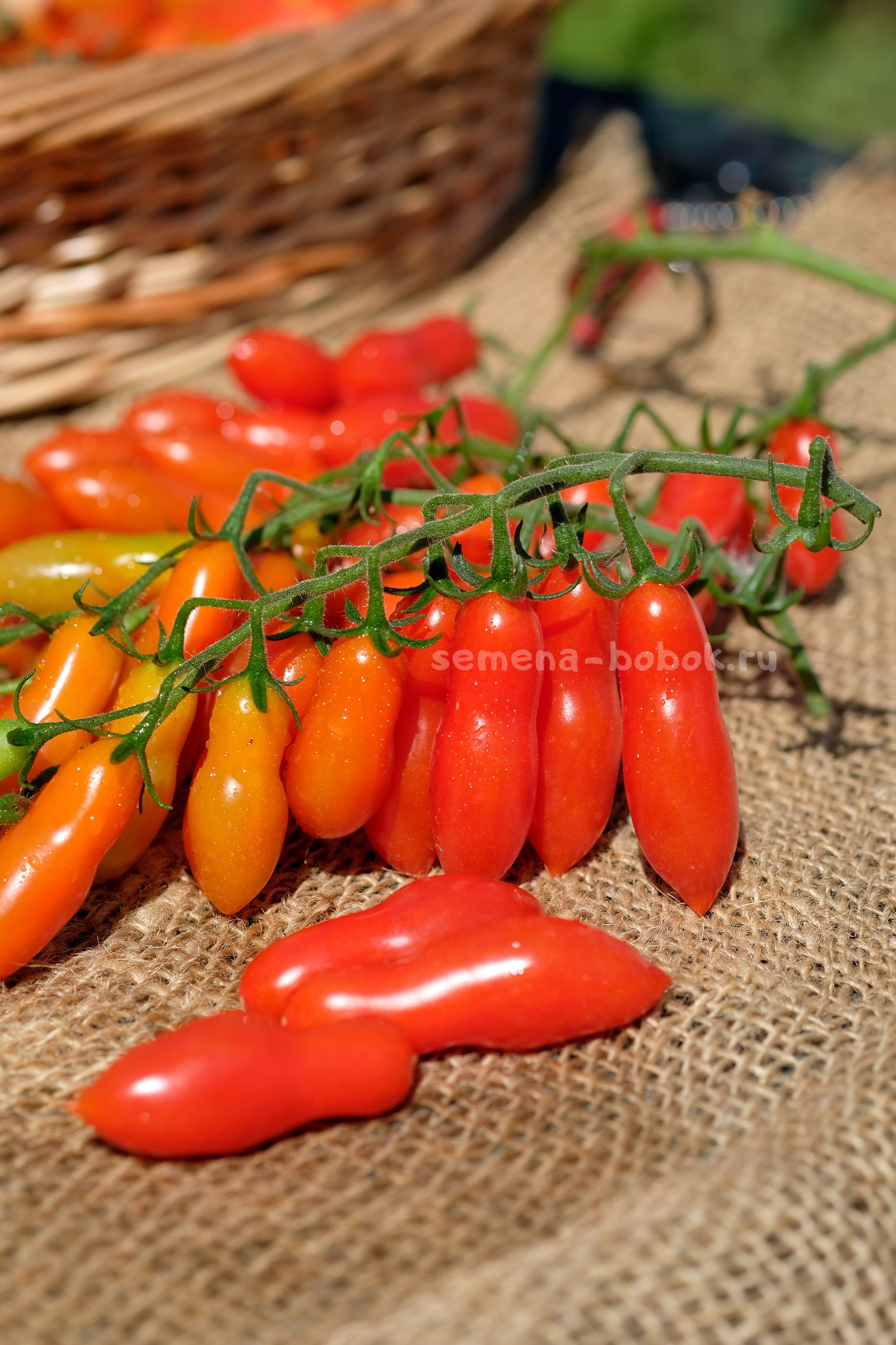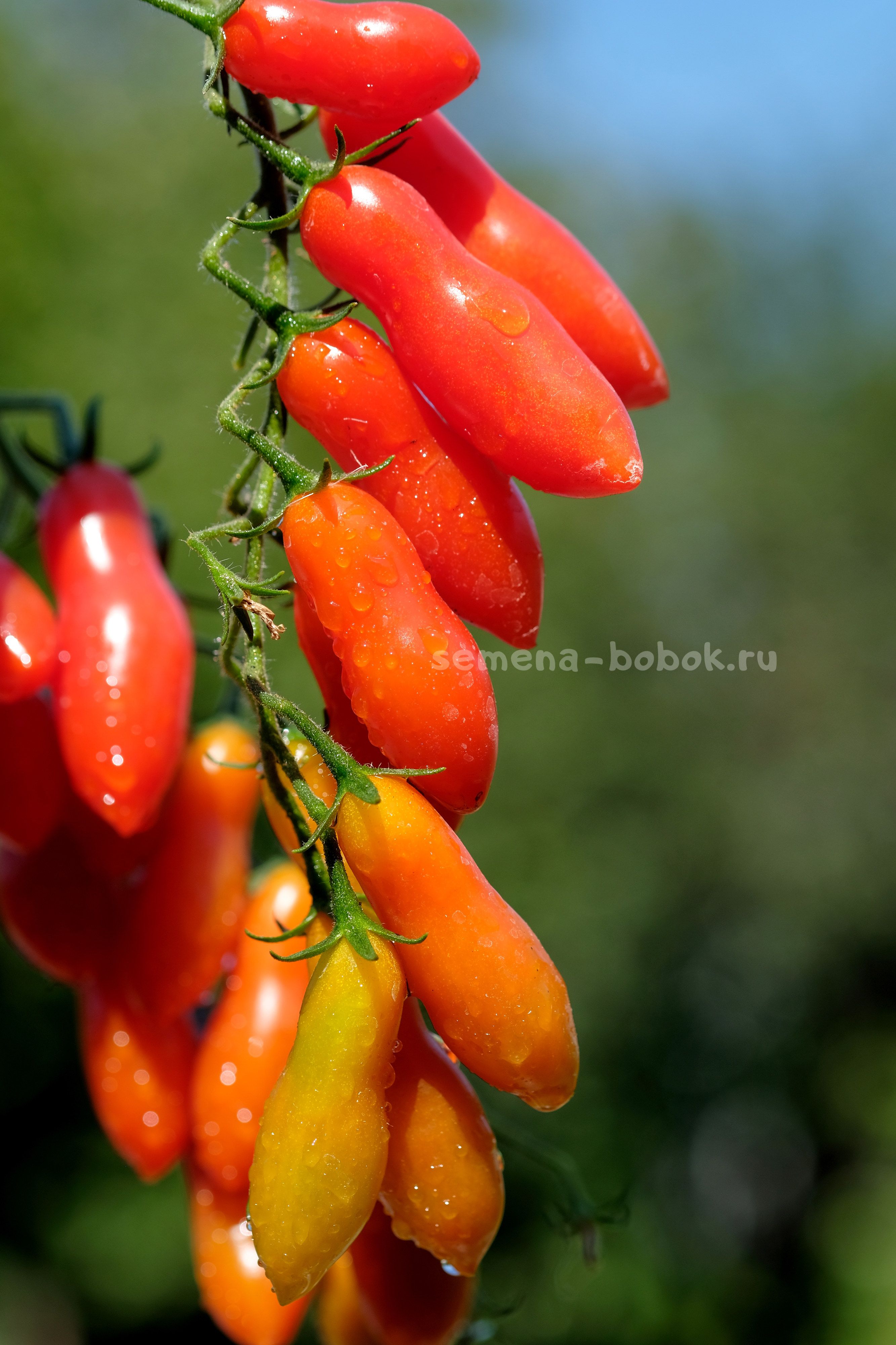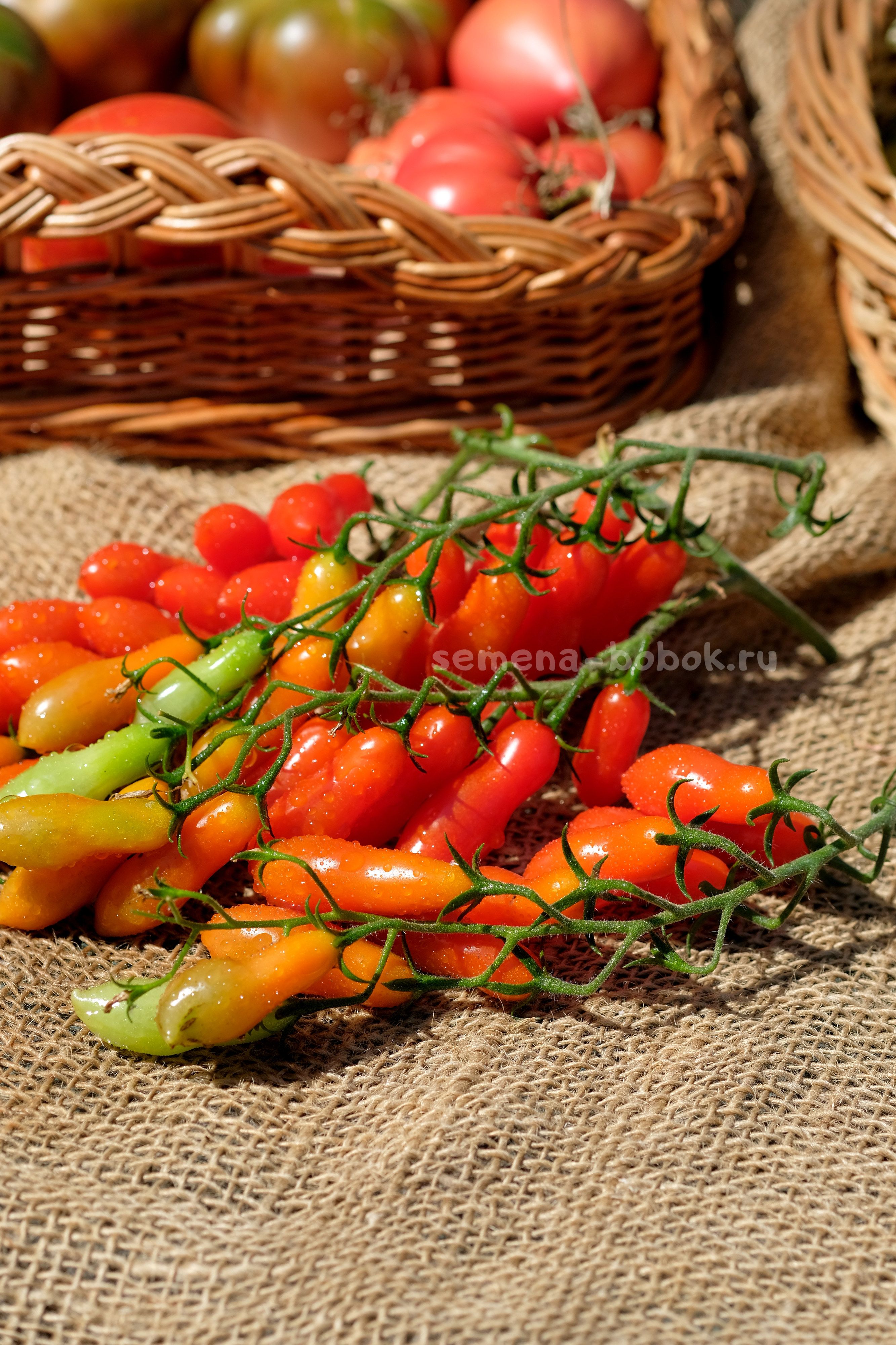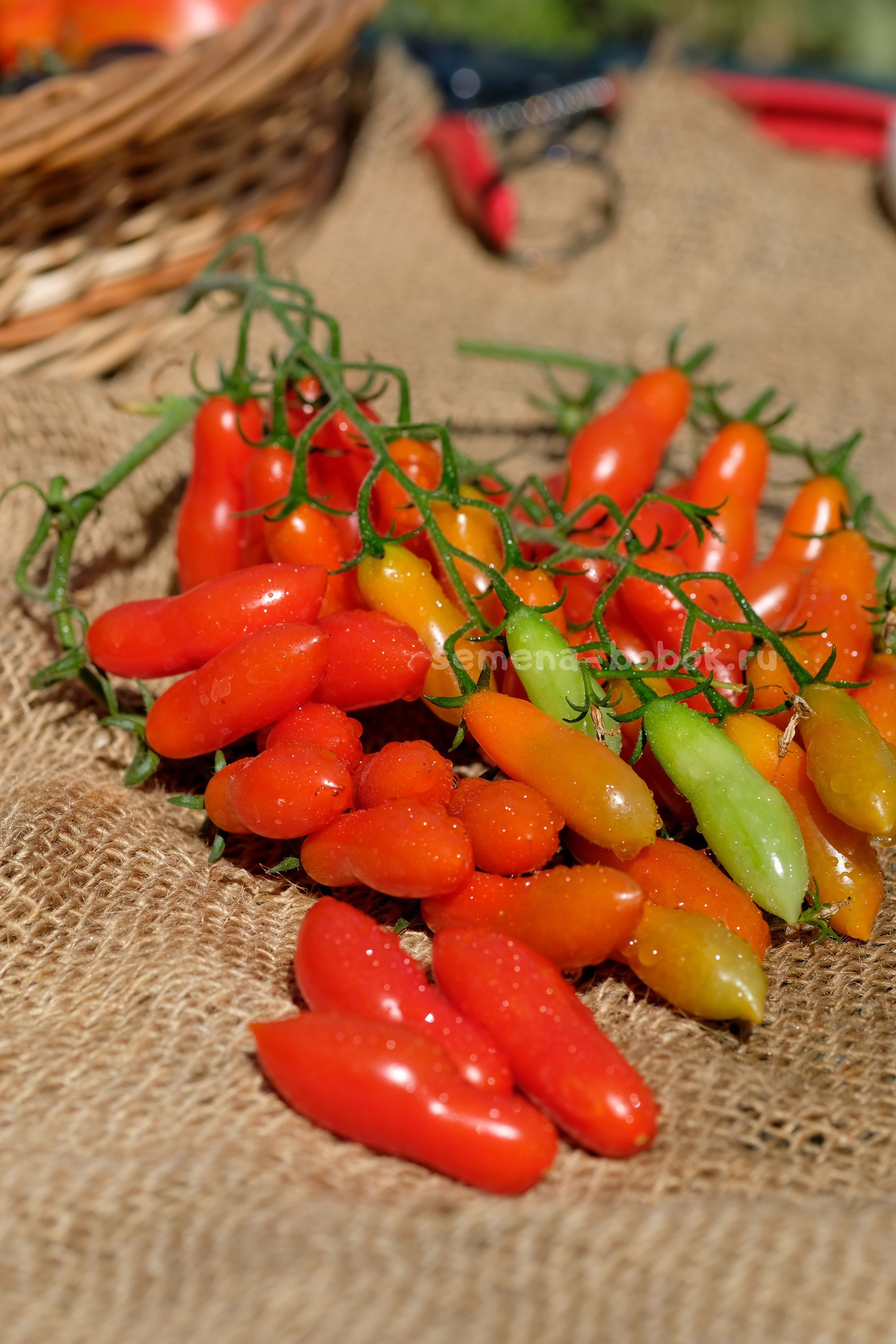 Томат черри с простыми и сложными кистями. Плоды удлиненной формы, весом около 15 грамм. Очень сладкие! Стенка толстая и хрустящая, по консистенции очень похож на Танцующие Зеленые Пальчики - такой же вкусный, хрустящий, только красный. Семян в нем также практически нет.