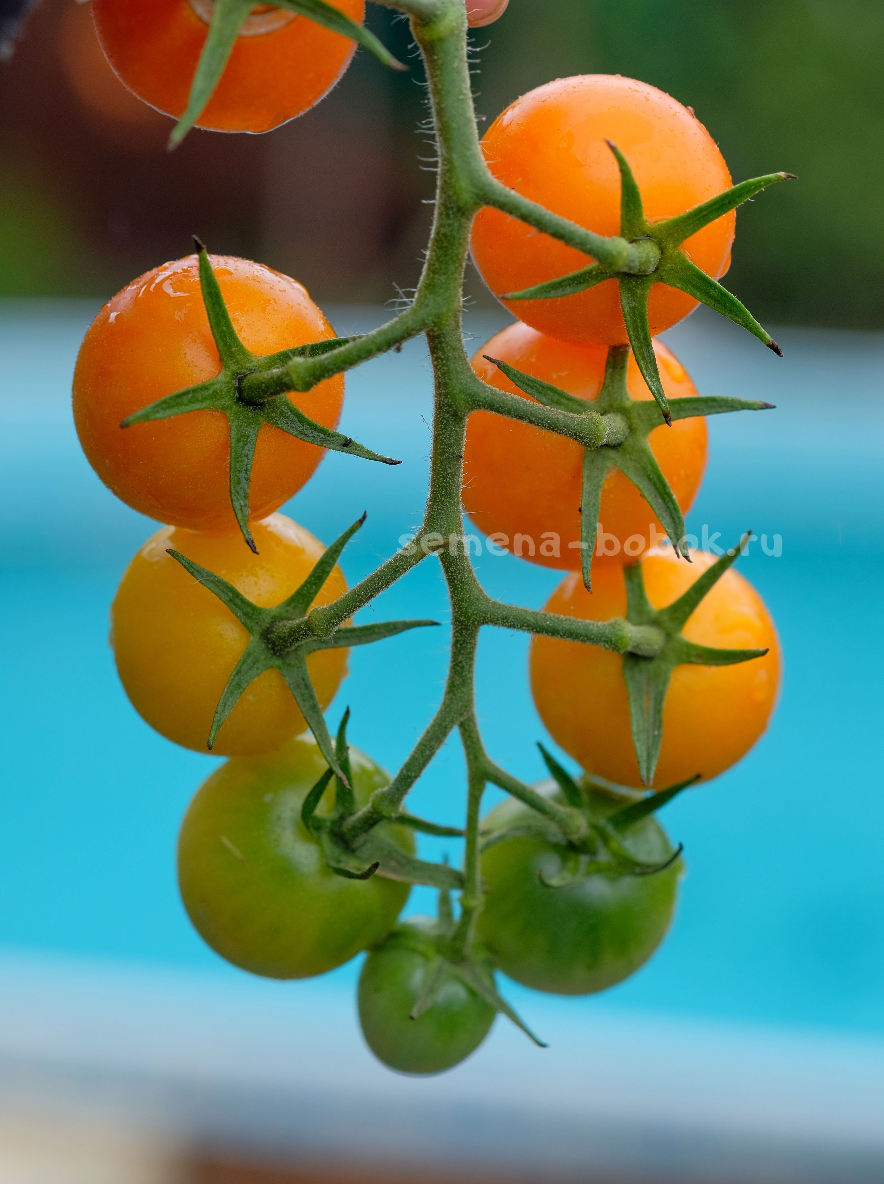 Плоды желто-оранжевого цвета по 25 г. Кисти простые, в кисти по 10-12 плодов.
