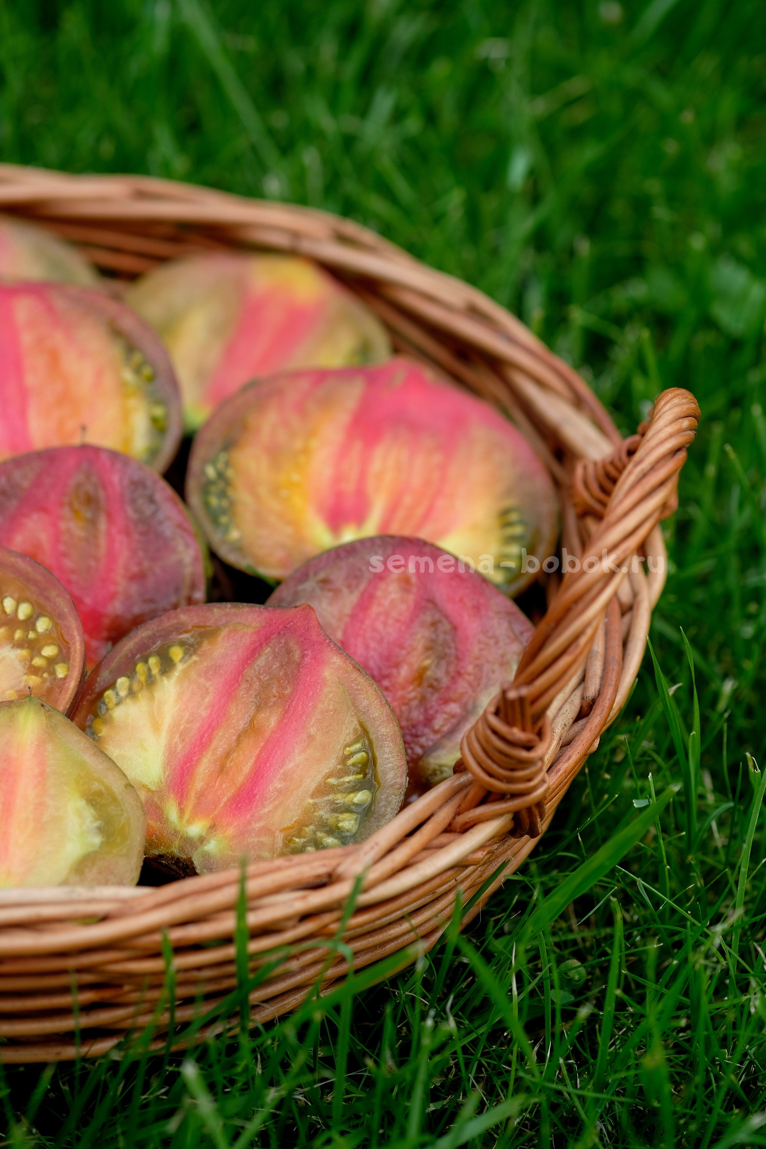 Плоды невероятной красоты - высокоплоскоукруглые с носиком, с расписными узорами красного, малинового, желтого цвета. Мякоть сладкая, маслянистая, многоцветная. Вкус яркий, сладкий с небольшой томатной кислинкой. Вес плодов 250-400 г.