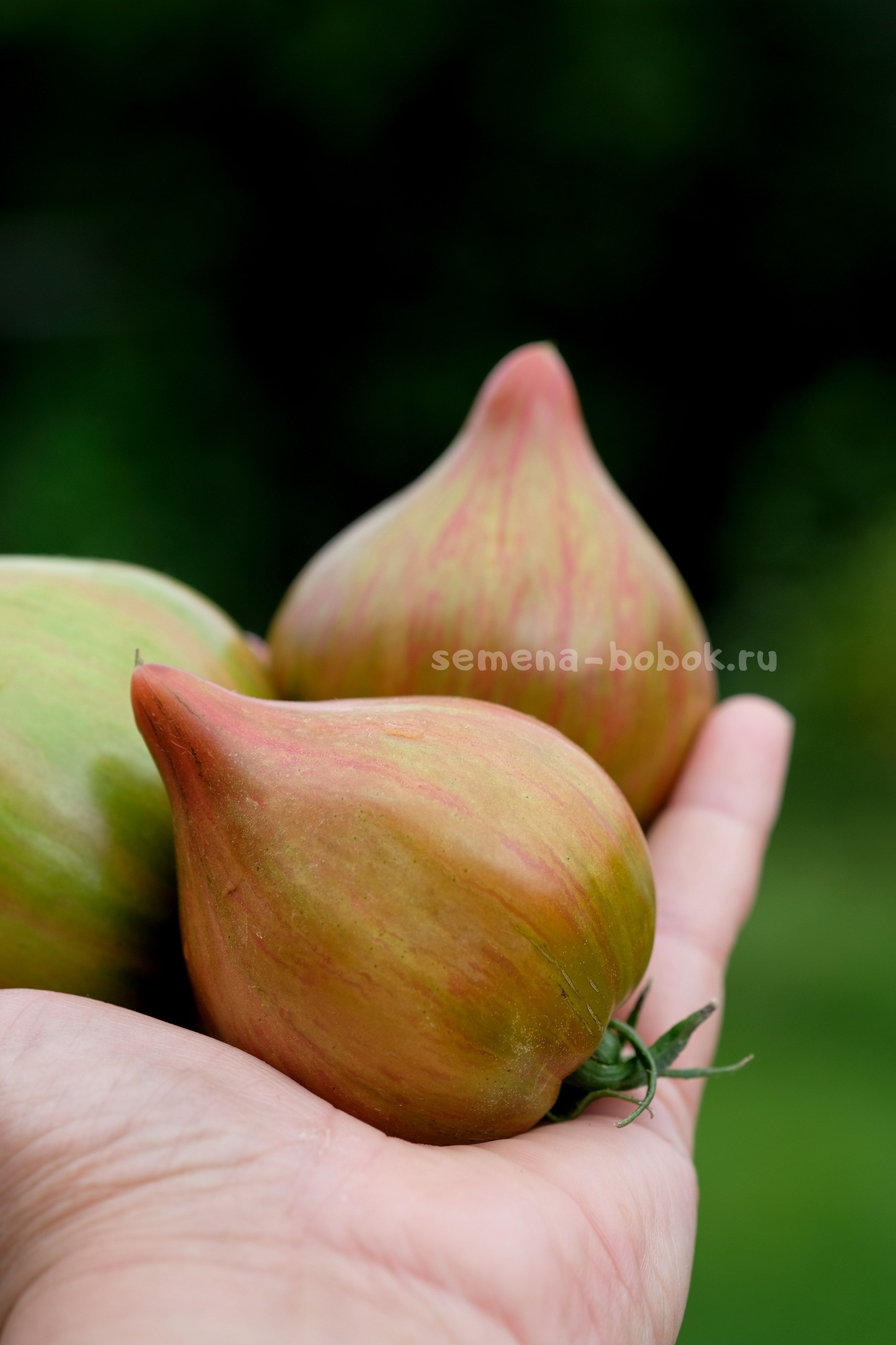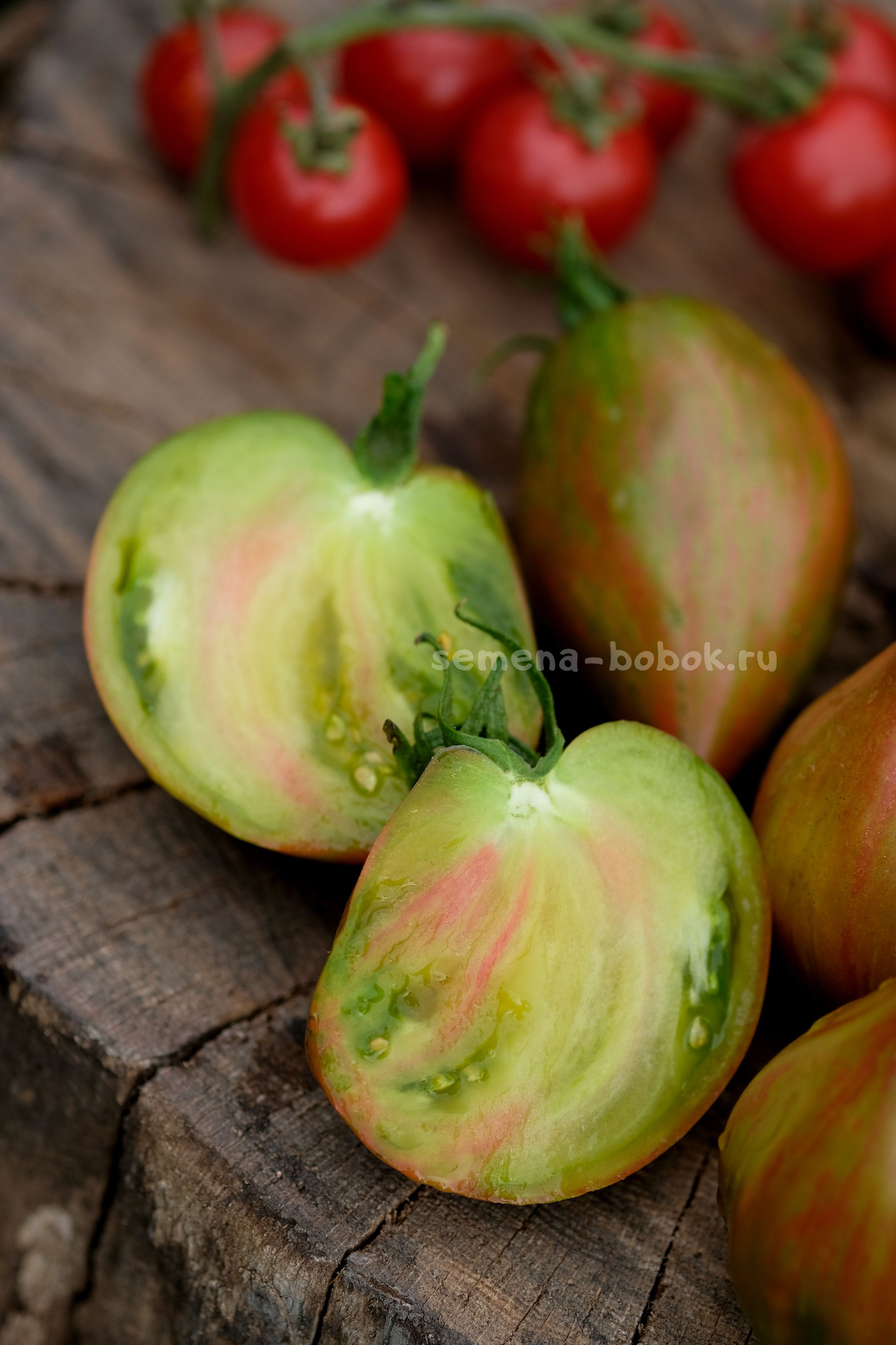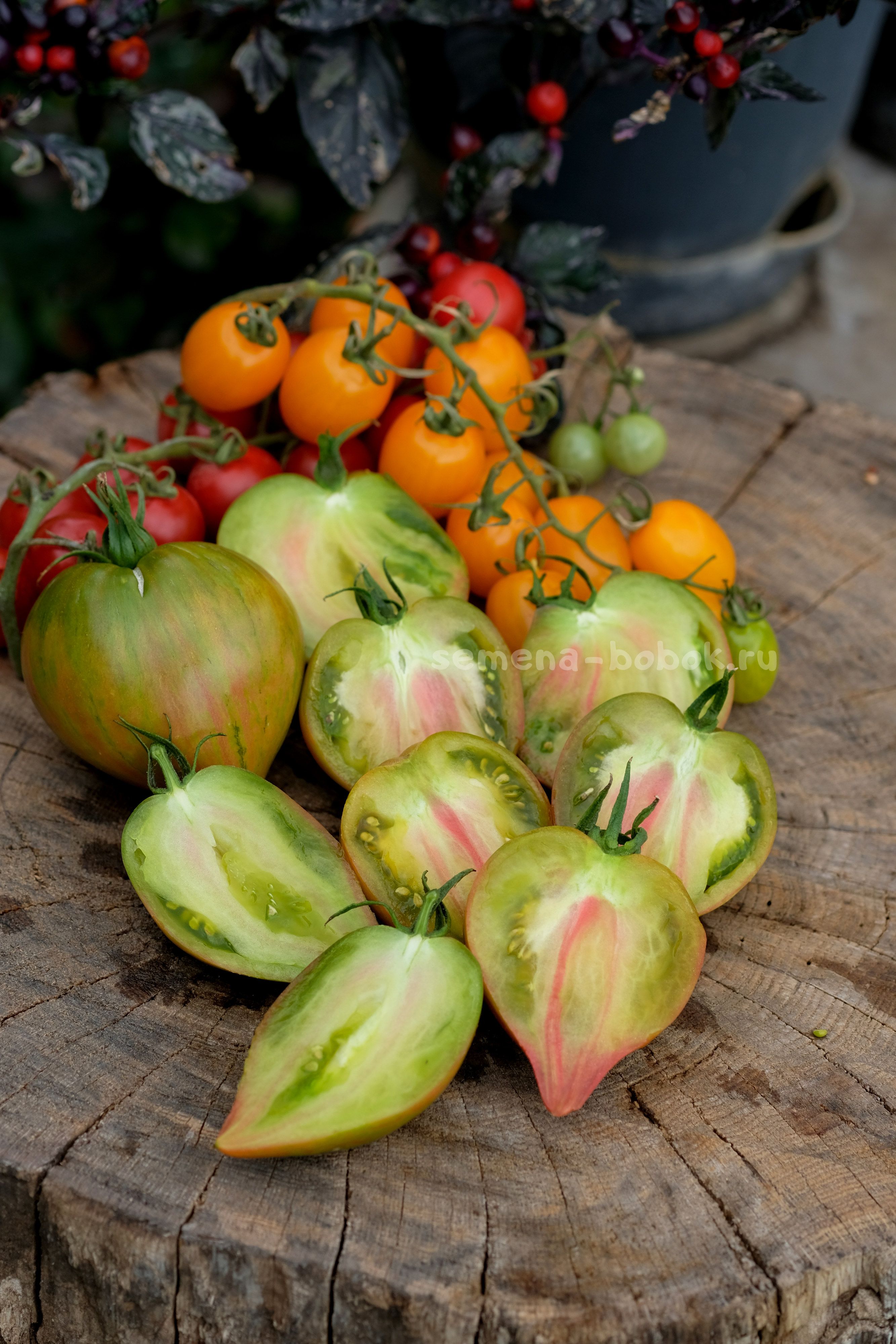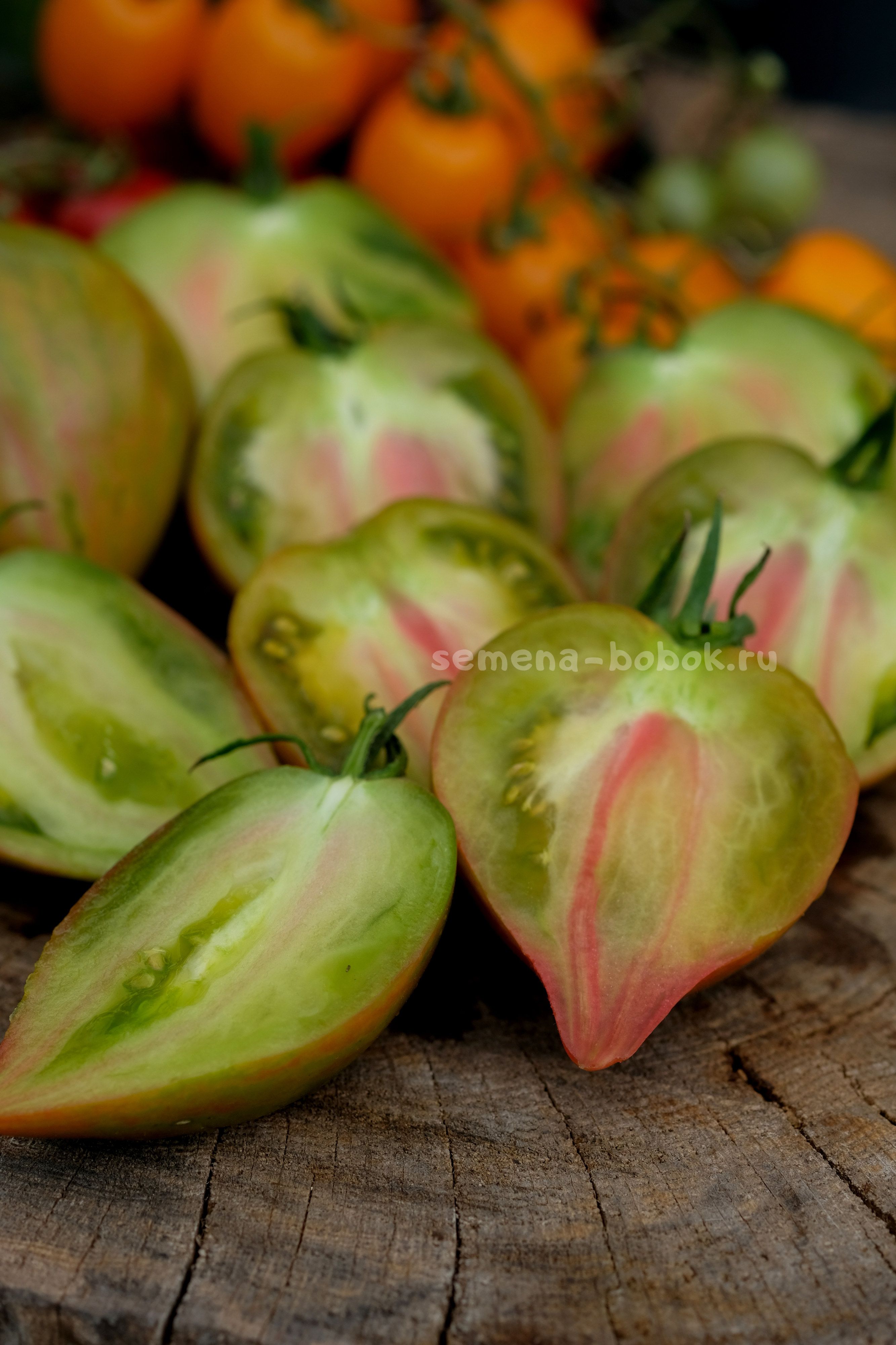 Куст тонкого строения, в открытом грунте был не более 1,6 м. Плоды - очаровательные сердечки с ярко-выраженным носиком, разрисованы бронзовыми, красными и орнжевыми разводами. Мякоть триколорная, повторяет цвета на кожице томатов. У меня на фото на разрезе едва заметны красные всполохи - вот в такой спелости он мне понравился гораздо больше - вкус уже набрал, но остался плотным, примерно как персик или манго. Сладкие, с небольшой кислинкой в послевкусии.
