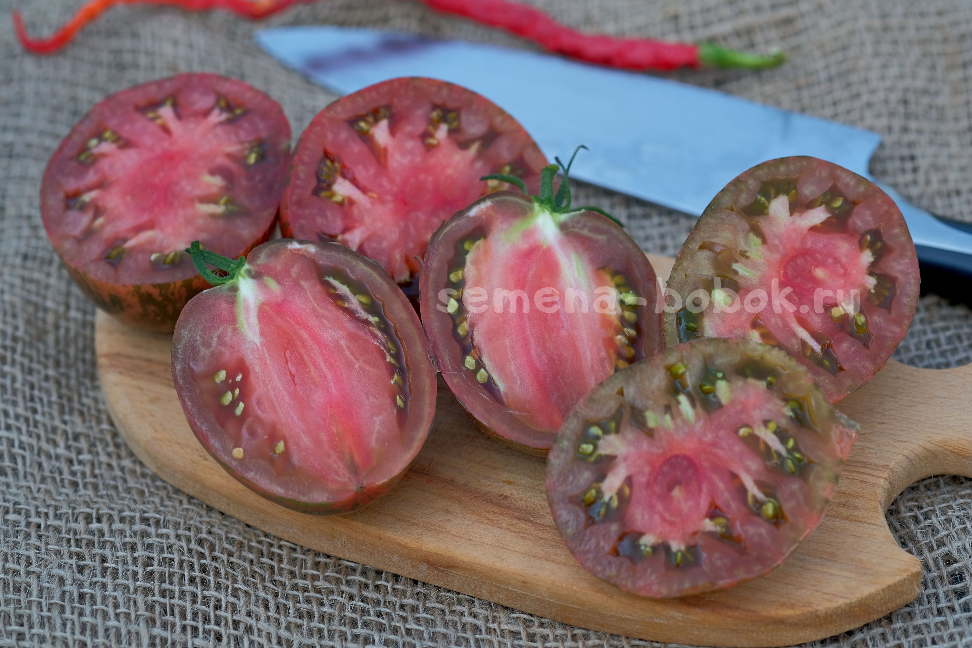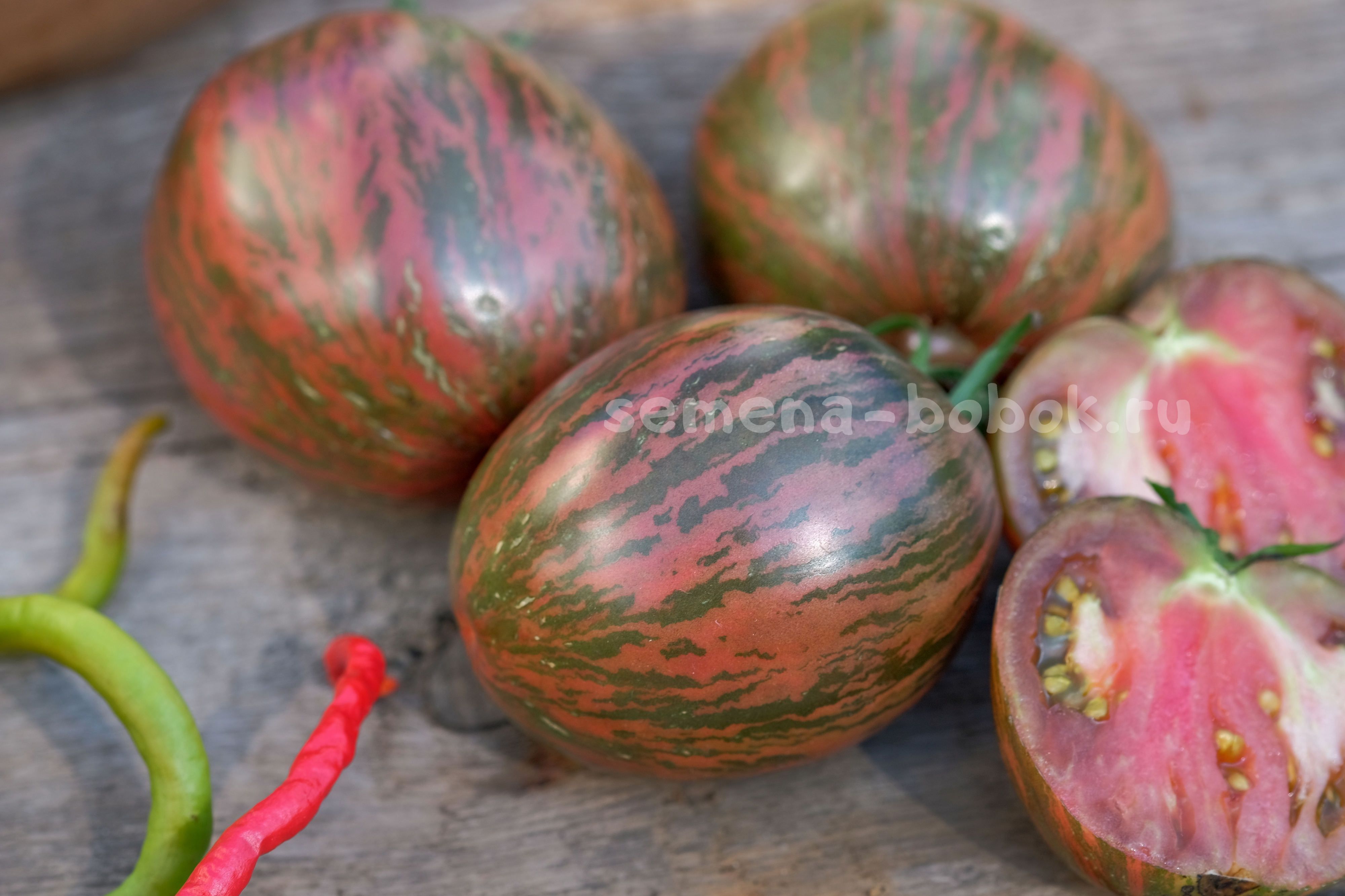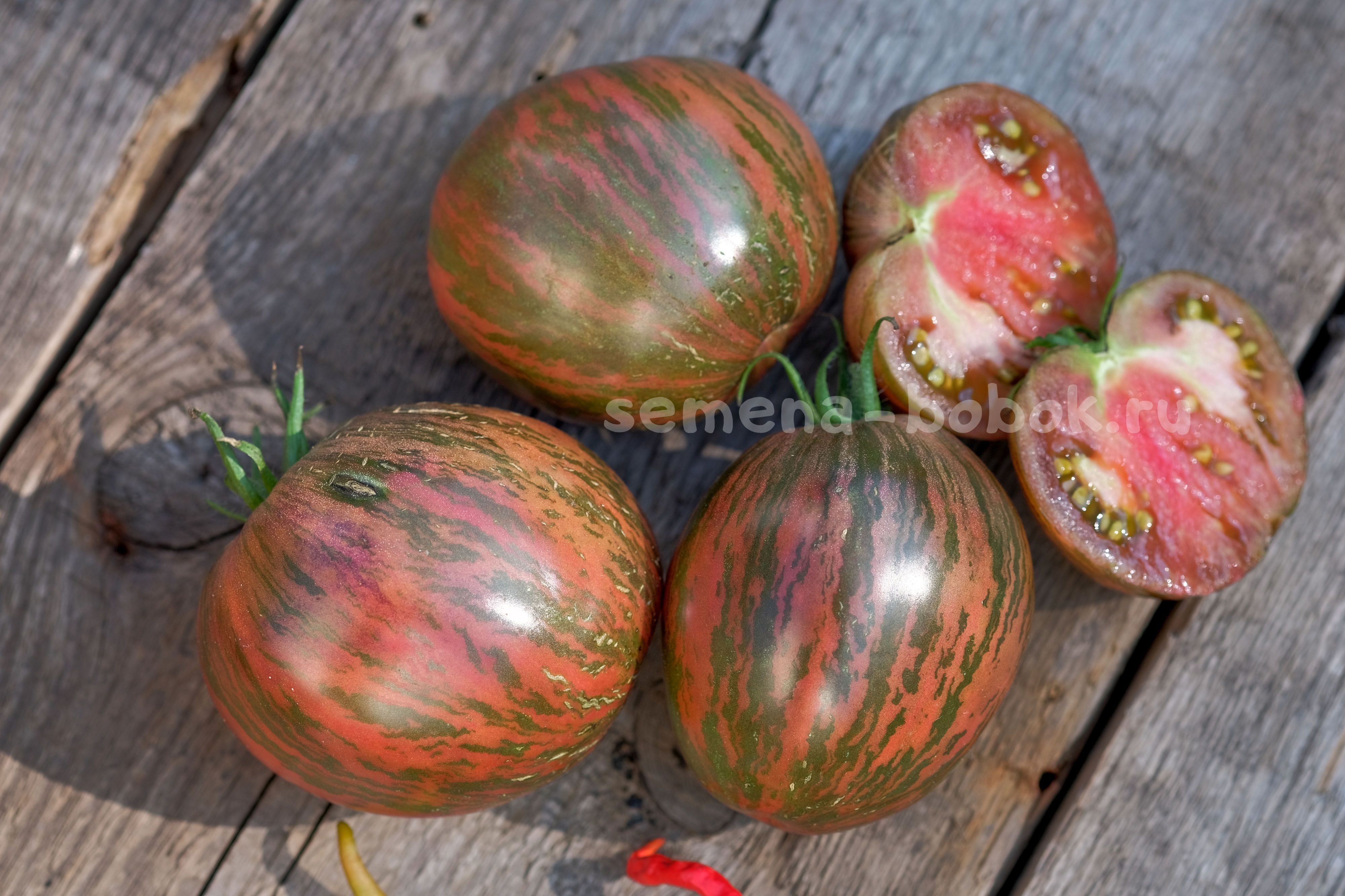 Полосатиками сейчас уже сложно кого удивить, но не все они имеют такой яркий, пряный взрывной томатный вкус и аромат! На разрезе плоды темно-бордовые, яркие, семена в зеленом геле, что сразу говорит о сладости томата. Плоды небольшого размера, 100-150 г, округлой, слегка вытянутой формы.