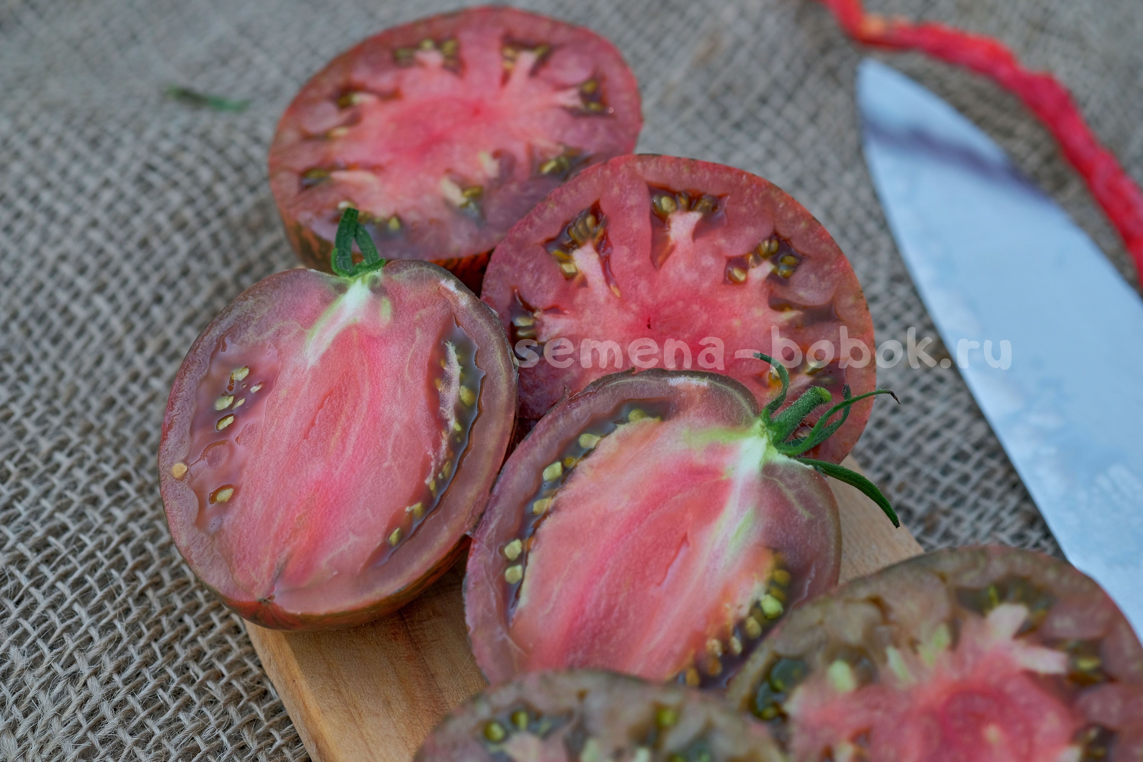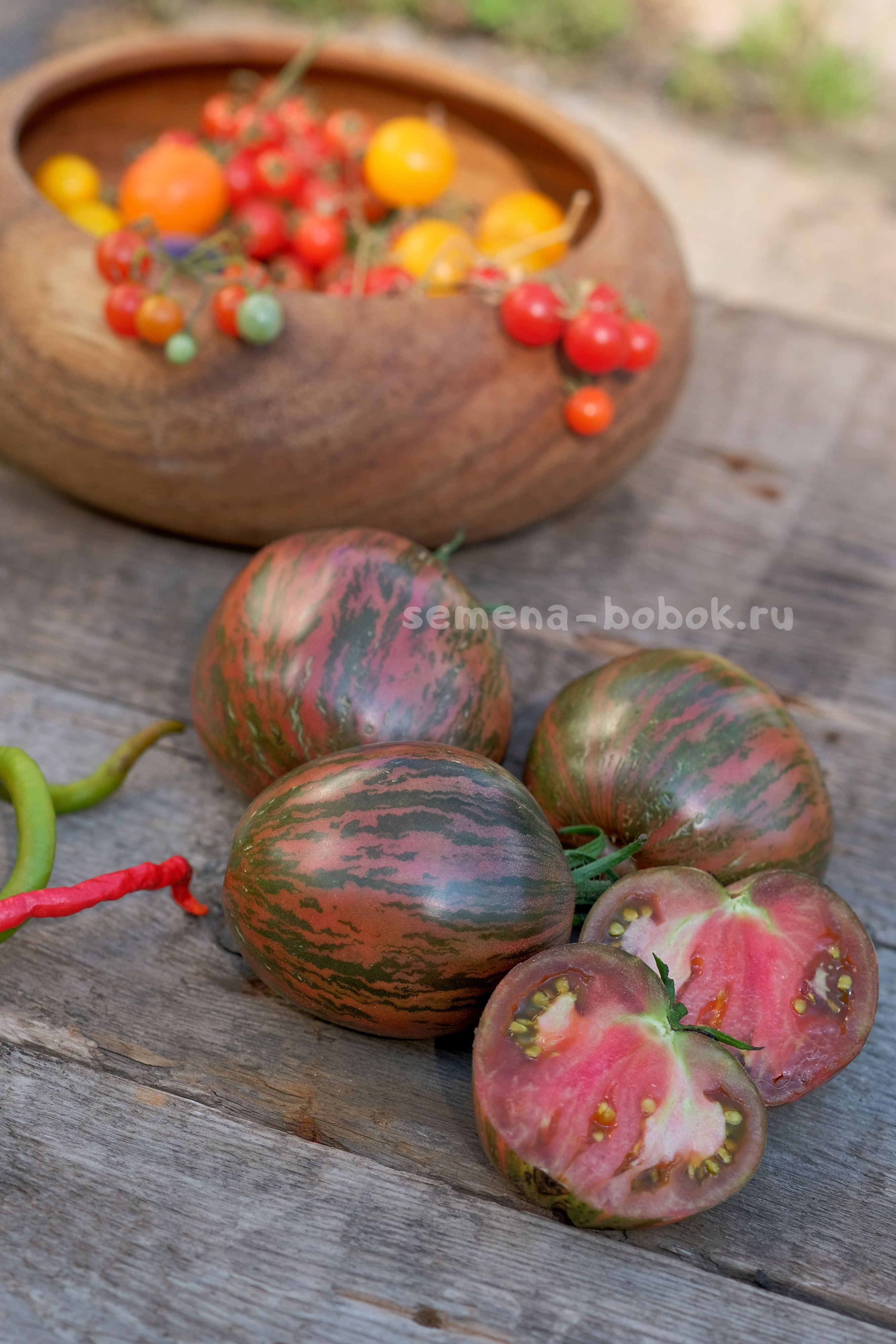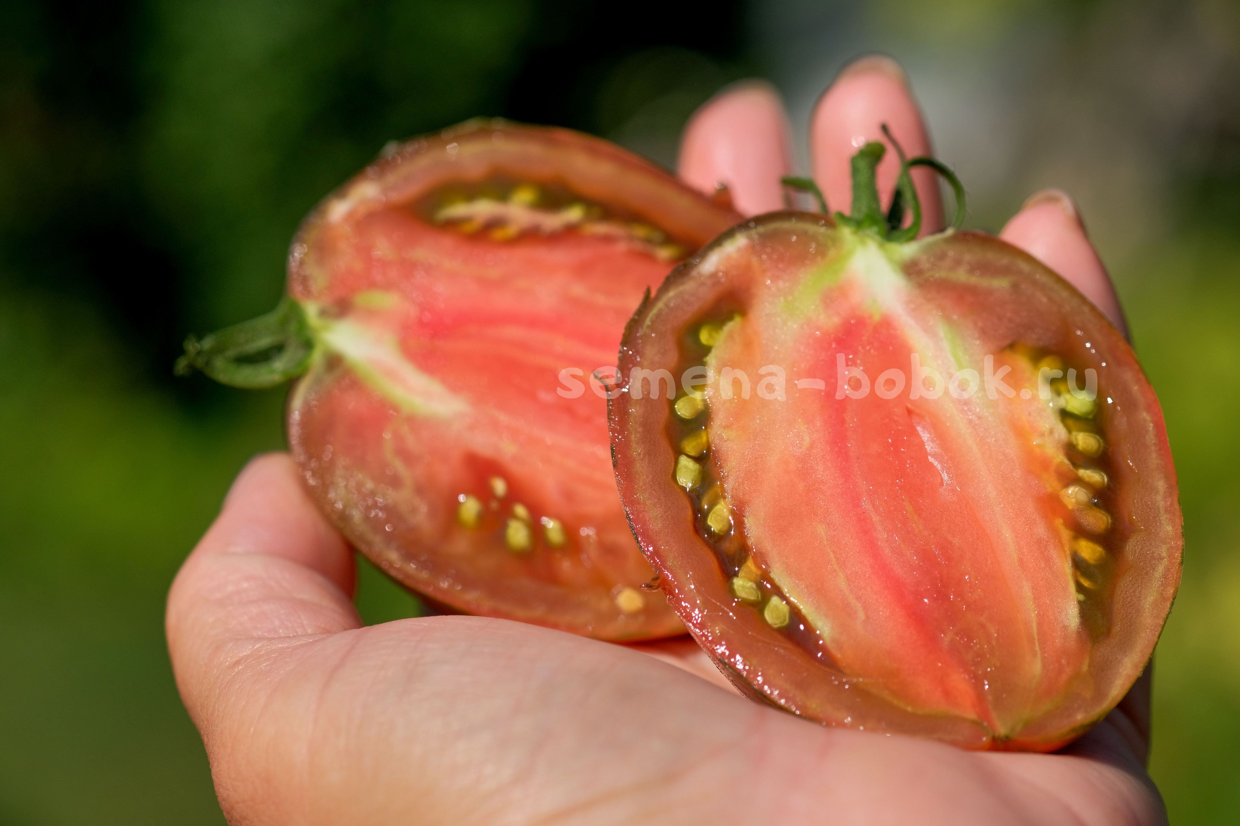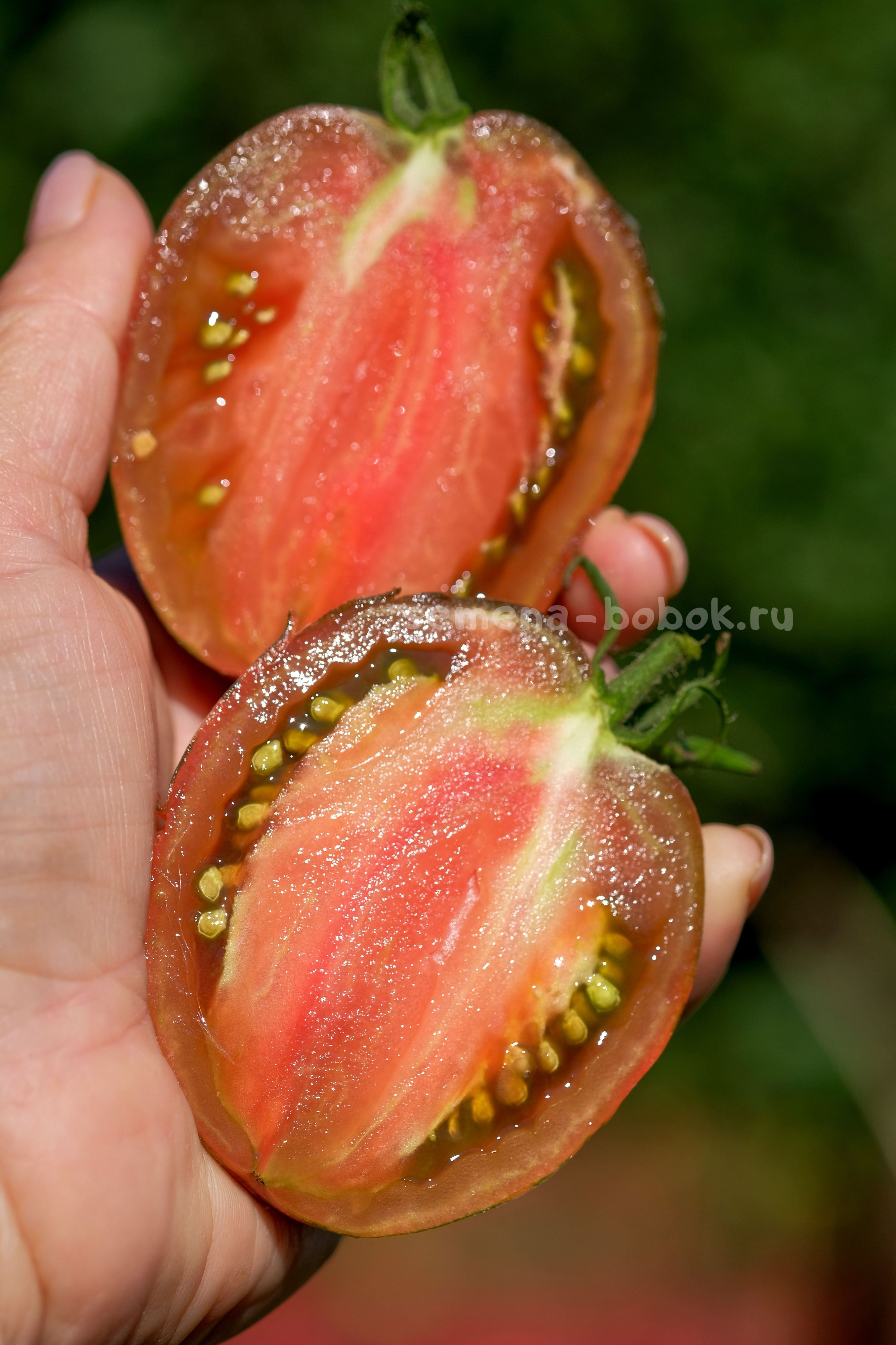 Полосатиками сейчас уже сложно кого удивить, но не все они имеют такой яркий, пряный взрывной томатный вкус и аромат! На разрезе плоды темно-бордовые, яркие, семена в зеленом геле, что сразу говорит о сладости томата. Плоды небольшого размера, 100-150 г, округлой, слегка вытянутой формы.