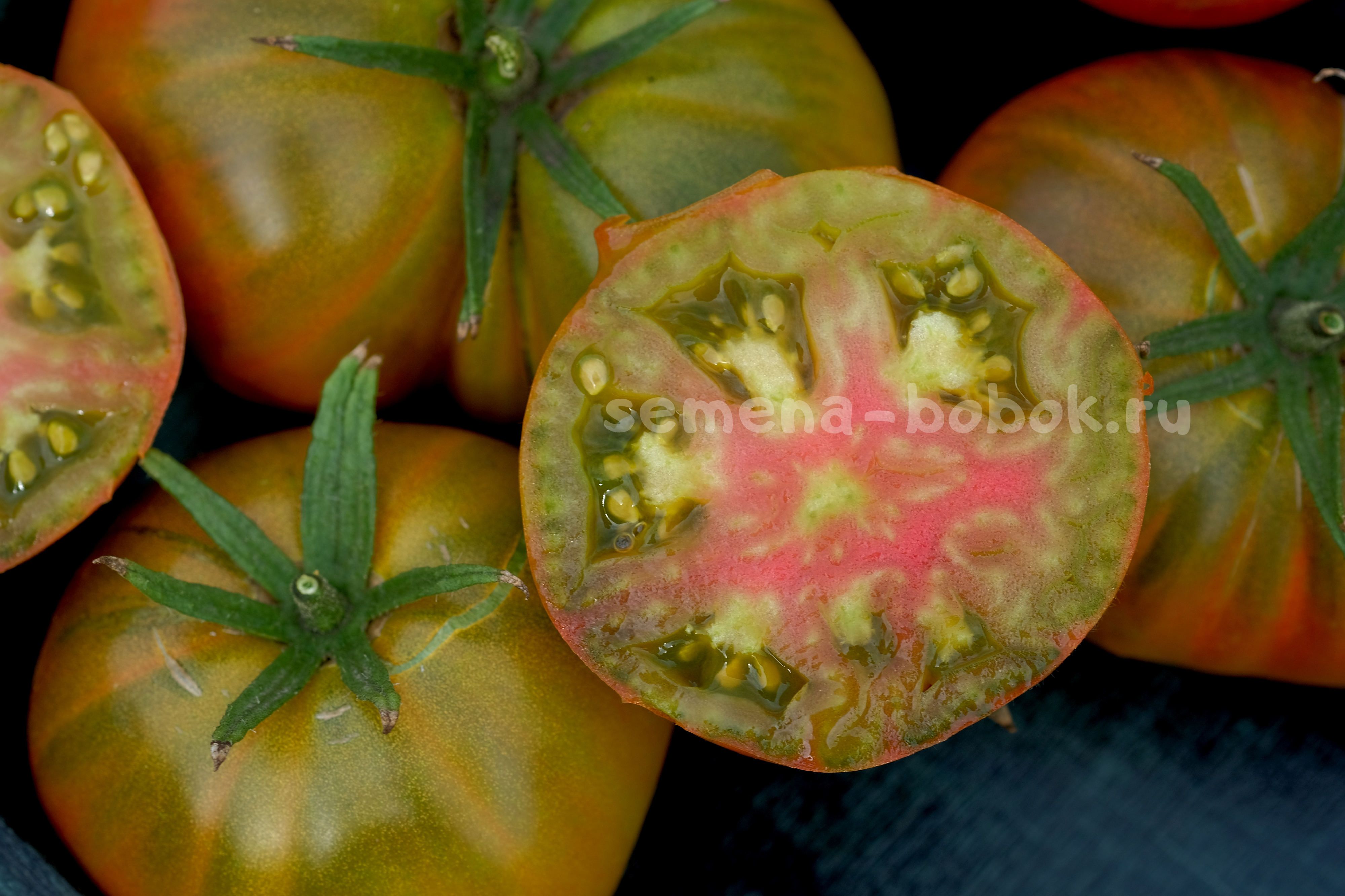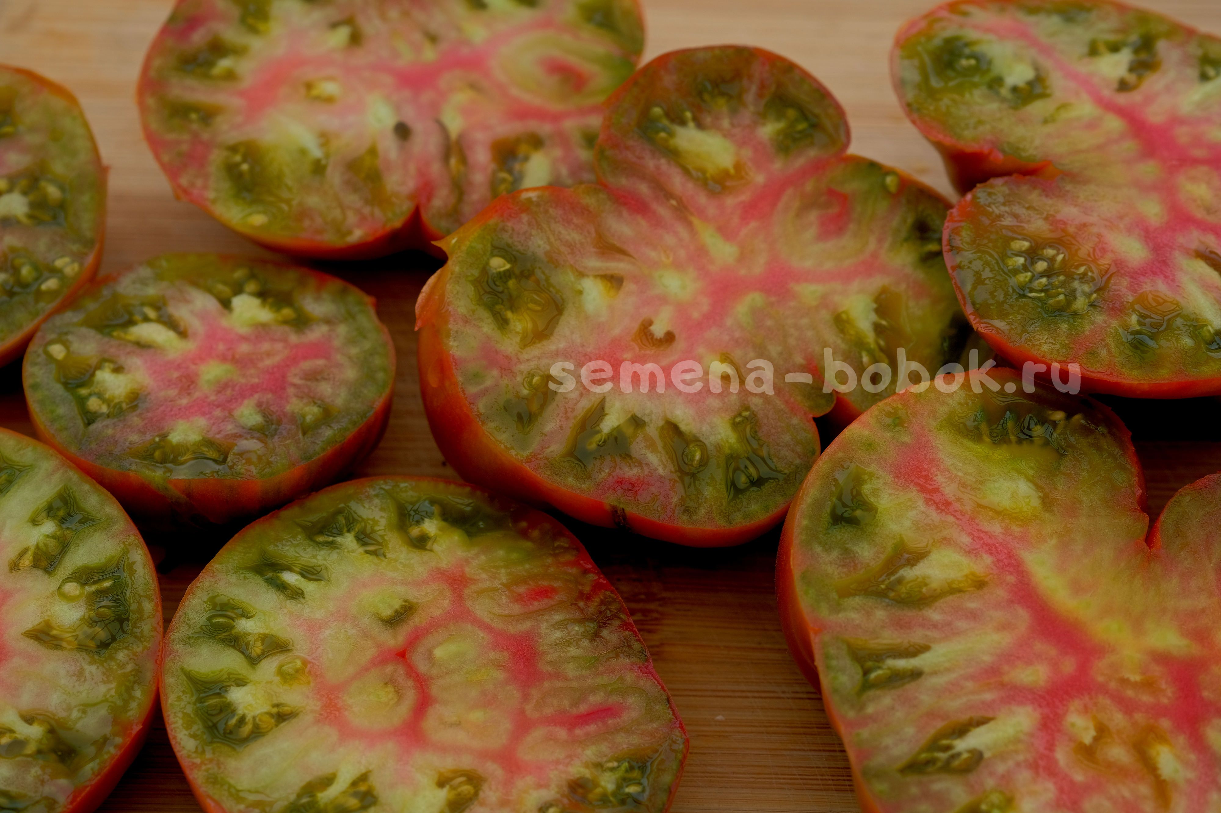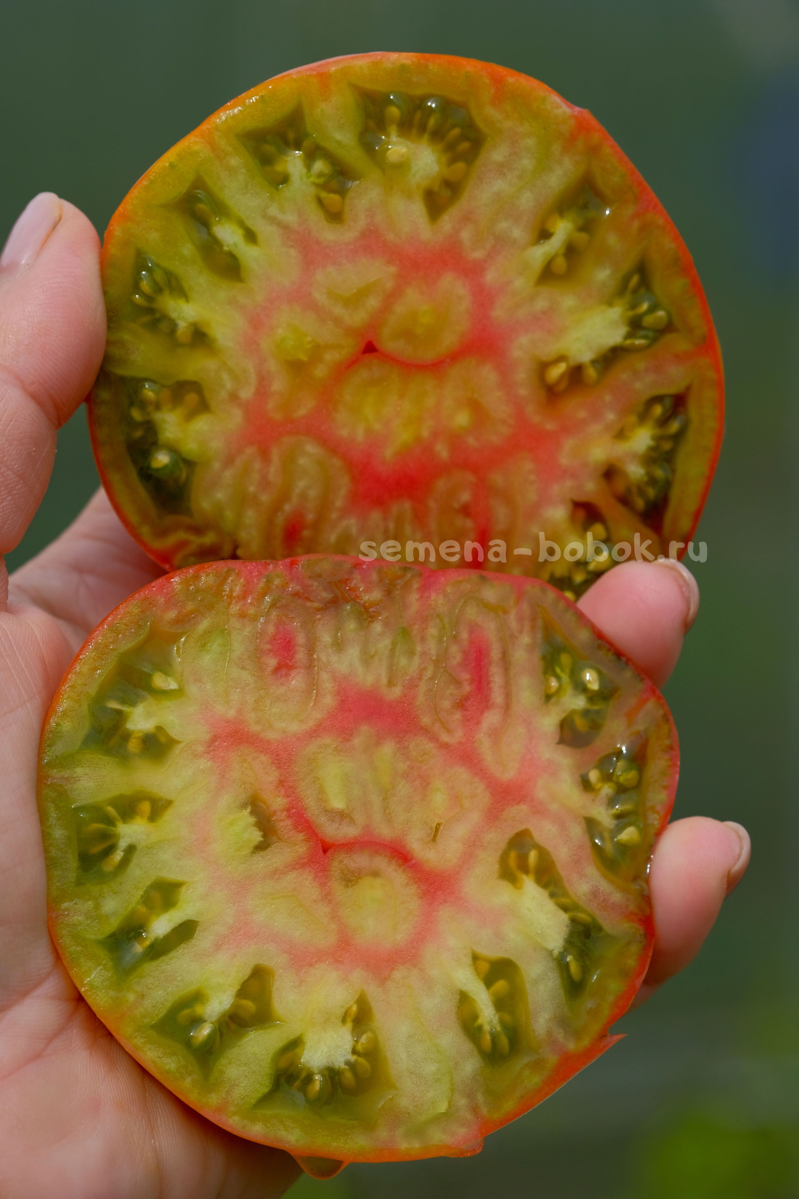 Плоды плоскоокруглые, кирпично-красного цвета с медным напылением на плечиках. Разрез - произведение искусства, зеленая мермеладная мякоть с яркими вспышками в середине. Очень сладкий, с фруктовым послевкусием. Кожица тонкая, нежная.